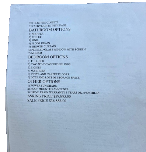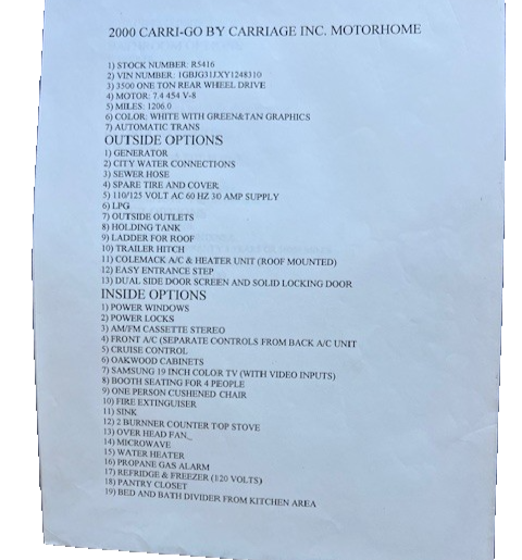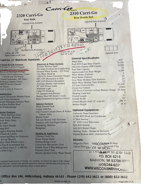 The 2001 Carri-Go 2310 is a compact yet versatile unit that combines the maneuverability of a smaller RV with many of the amenities found in larger units. Built on the reliable Chevrolet Express 3500 chassis, with 35828 original miles. a 7.4L Vortec V8 engine it offers both durability and ample power for highway cruising or mountain travel. It is classified as a Class B+ motorhome.