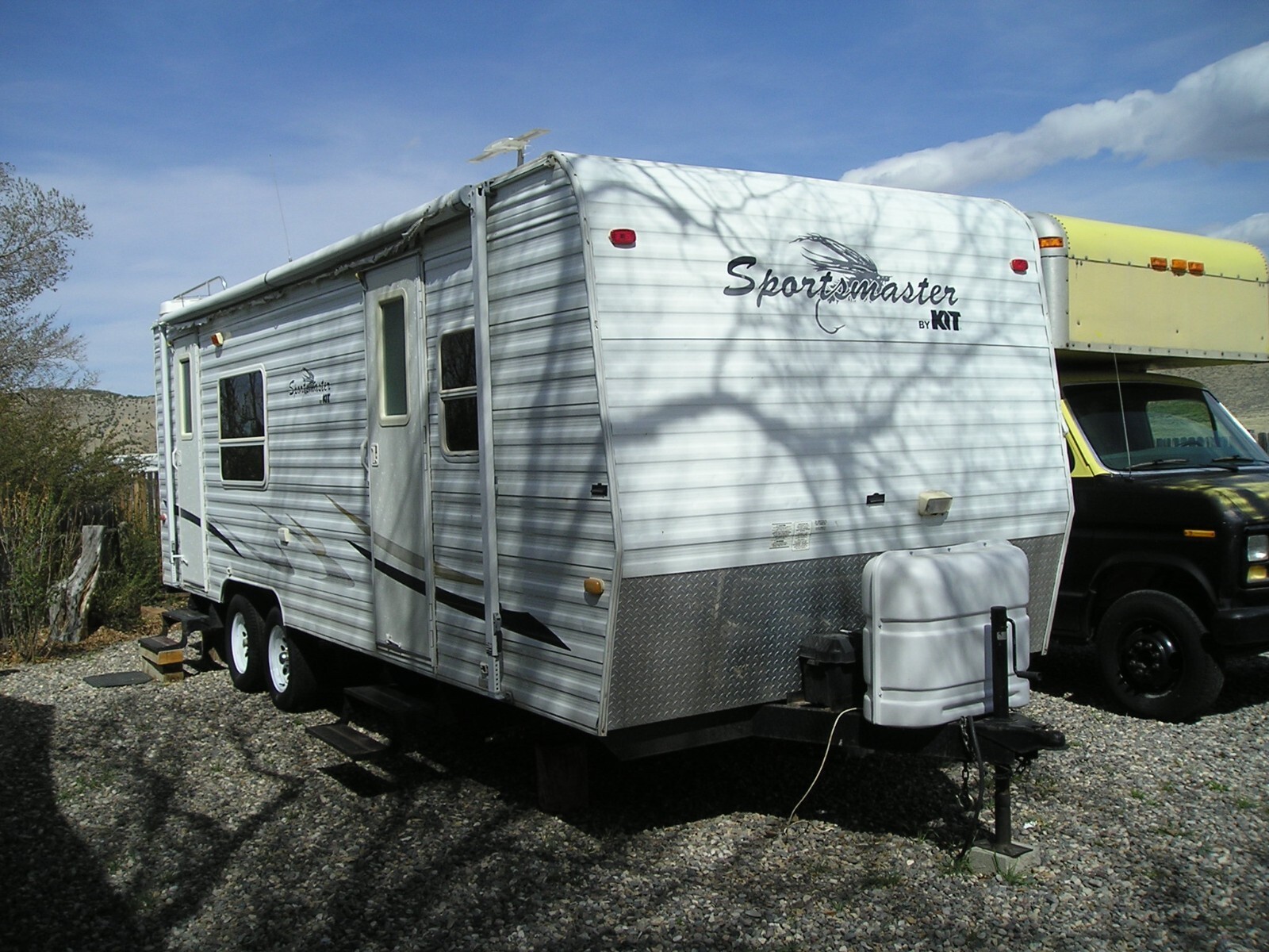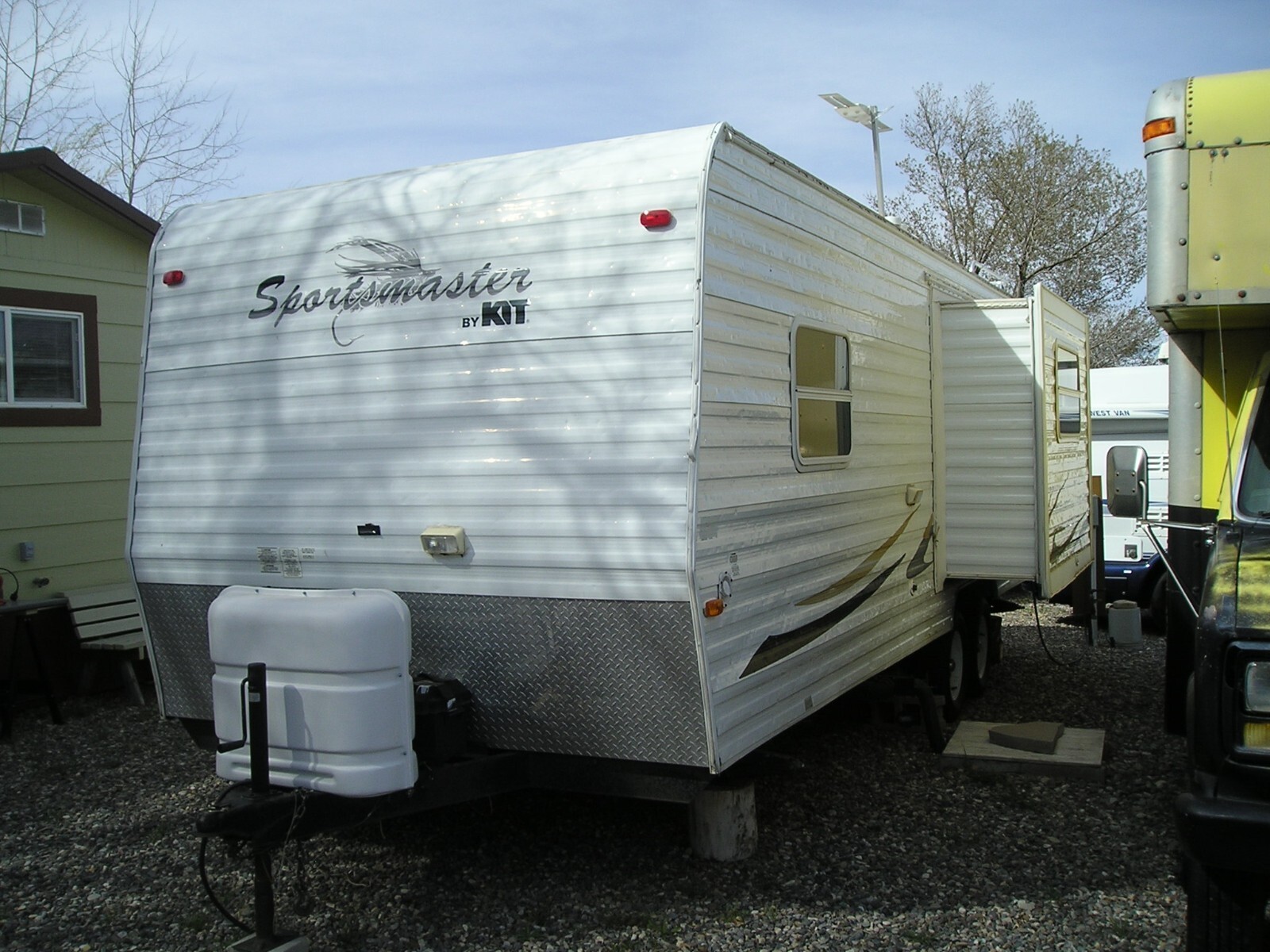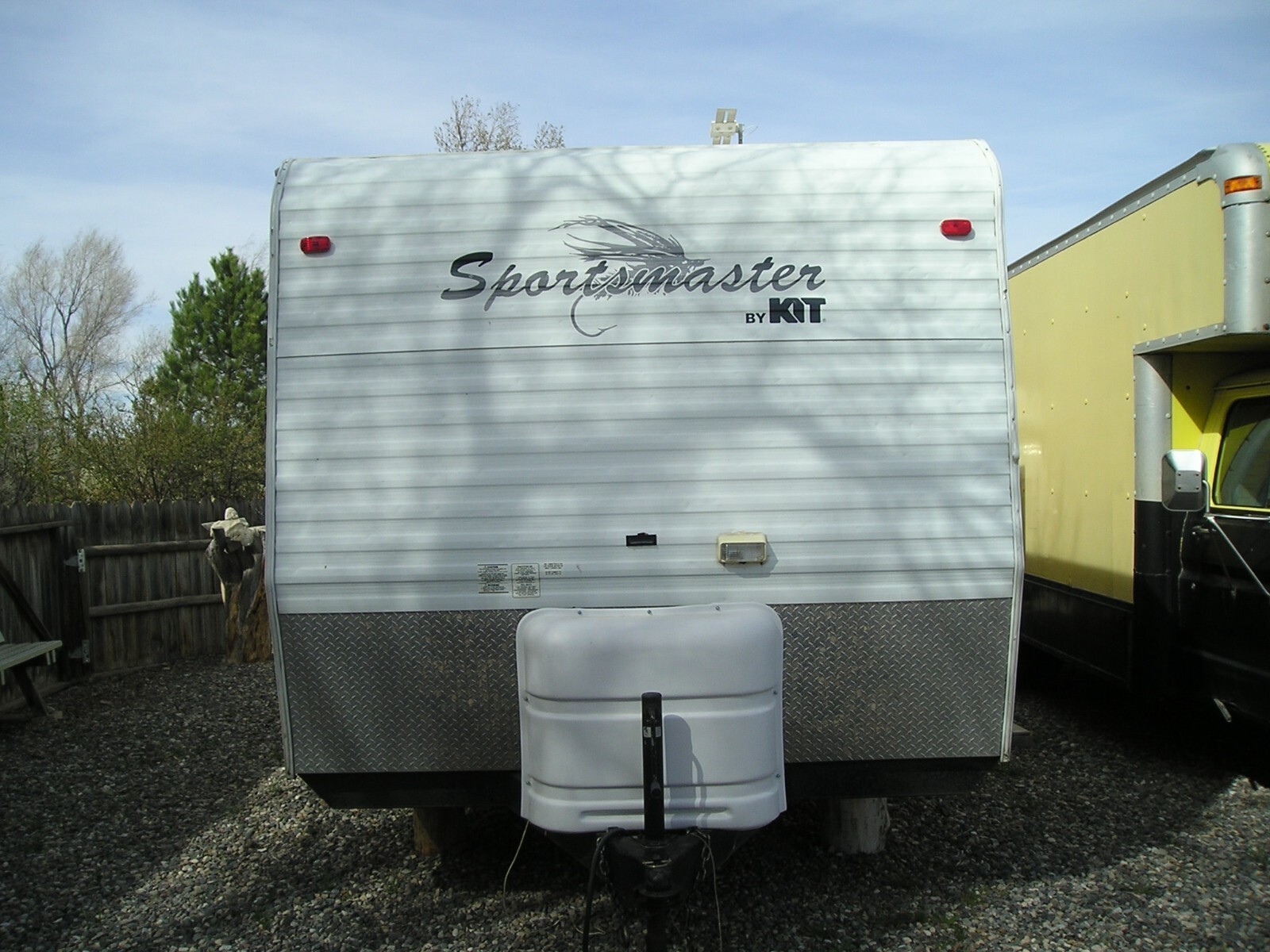 2003 Kit Sport Master Travel Trailer, 26 feet (including hitch), Very Good overall condition. New roof installed in excellent water tight condition. Minor hail damage on slide out side of trailer. Some damage to outer edge of awning. Tires in fair to good condition. Interior in very good to excellent condition. Everything works great. Very large fridge. Cook stove and kitchen sink. Microwave oven. A/C and heater work great. Bathroom with tub, shower and toilet. Small sink next to bathroom. Large Queen size bed. Couch (in slide out) and kitchen table. Flooring and carpet in very good condition. TV w/ DVD player and stereo system. Two deep cycle batteries and two large propane tanks. Do not have the spare tire. Heavy Duty 7 prong trailer connector. Very easy to tow.