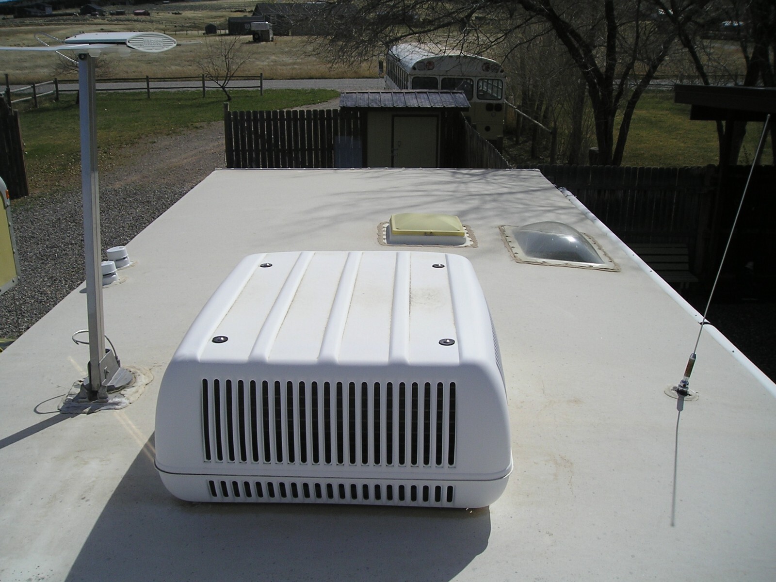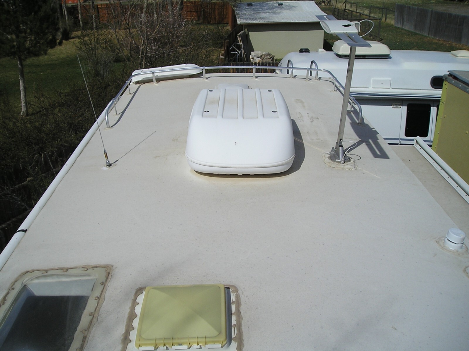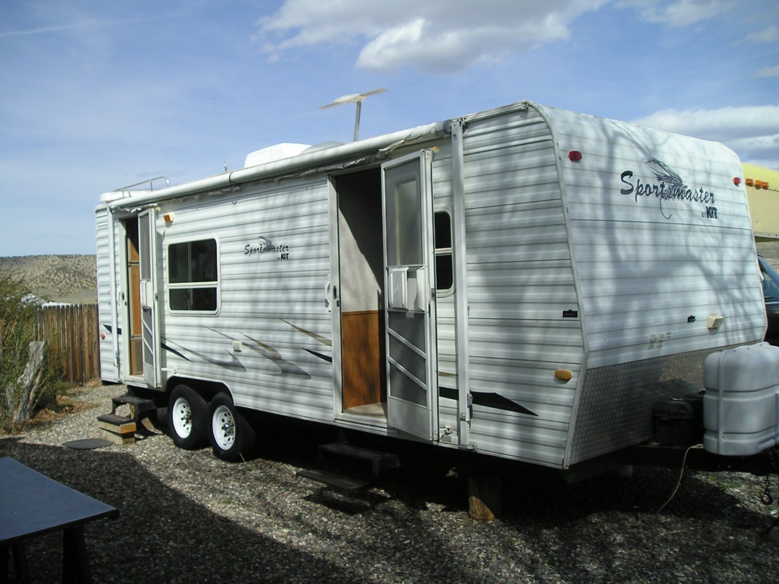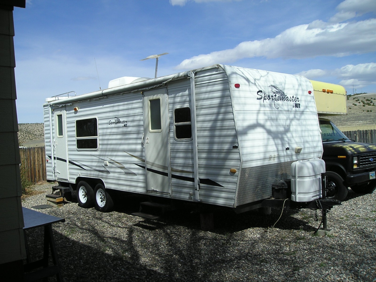 2003 Kit Sport Master Travel Trailer, 26 feet (including hitch), Very Good overall condition. New roof installed in excellent water tight condition. Minor hail damage on slide out side of trailer. Some damage to outer edge of awning. Tires in fair to good condition. Interior in very good to excellent condition. Everything works great. Very large fridge. Cook stove and kitchen sink. Microwave oven. A/C and heater work great. Bathroom with tub, shower and toilet. Small sink next to bathroom. Large Queen size bed. Couch (in slide out) and kitchen table. Flooring and carpet in very good condition. TV w/ DVD player and stereo system. Two deep cycle batteries and two large propane tanks. Do not have the spare tire. Heavy Duty 7 prong trailer connector. Very easy to tow.