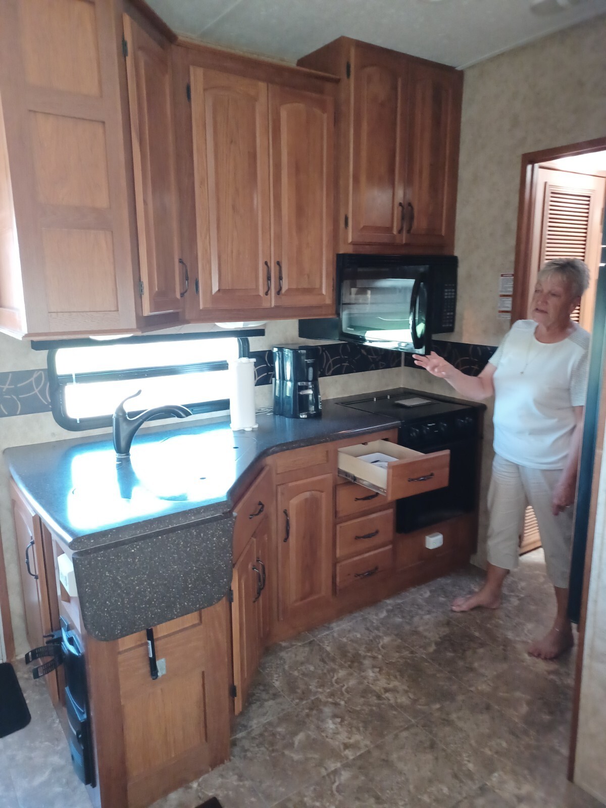 Cabinets, cooktop, kitchen-sink, microwave, stove