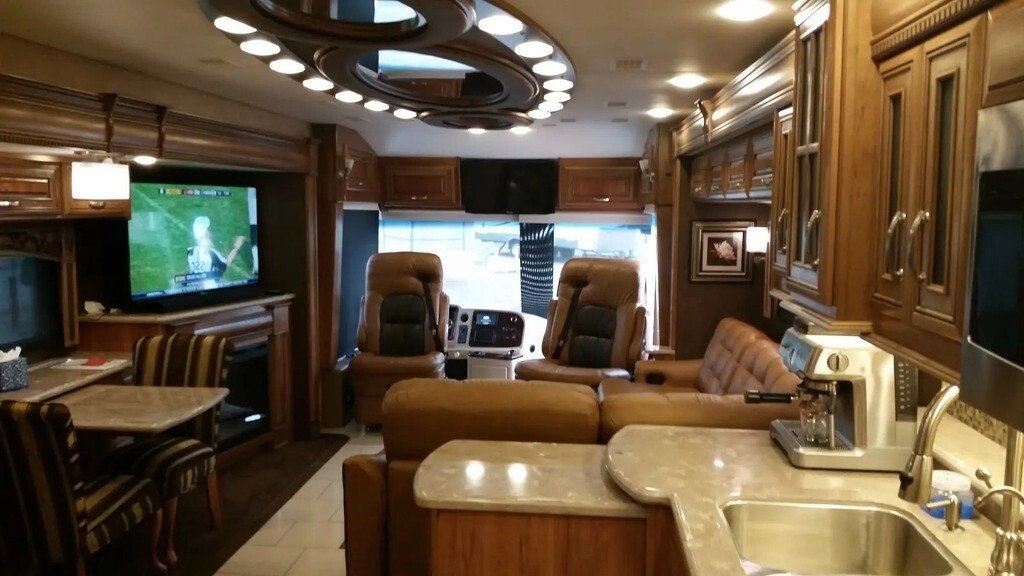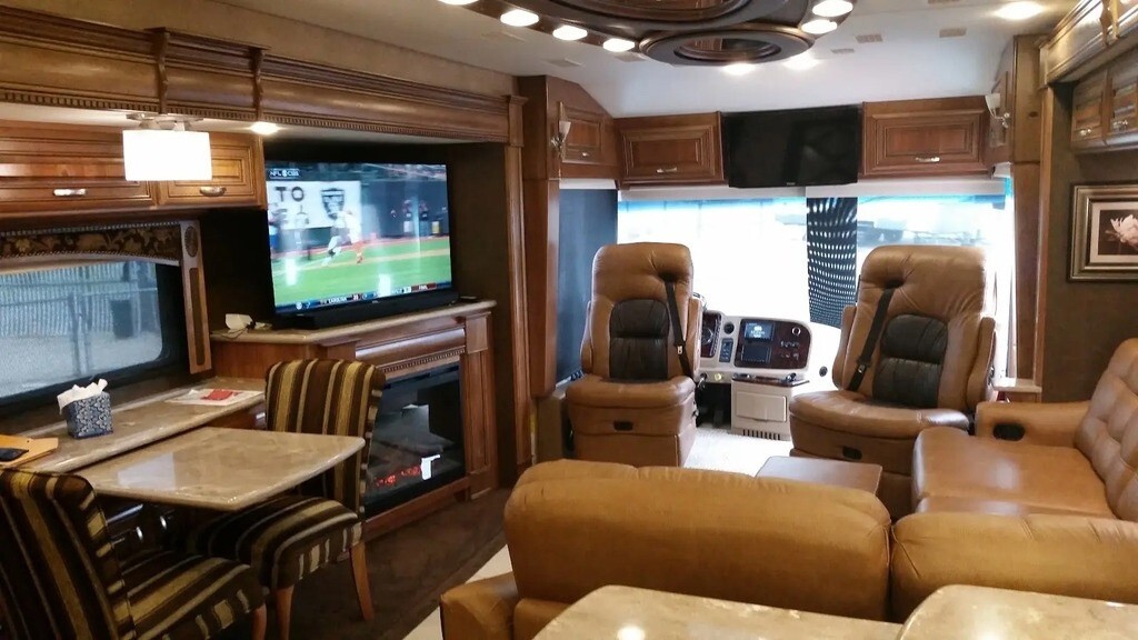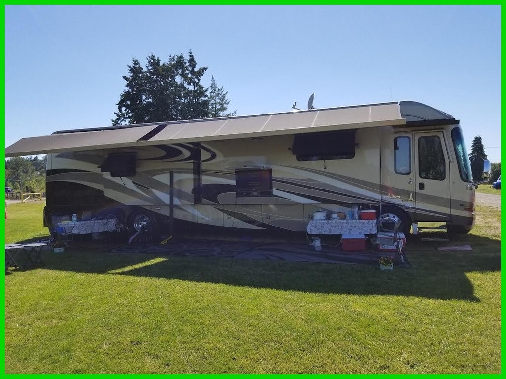 This Entegra is powered by an 8.9L I6 Cummins diesel engine and a 6-speed automatic transmission with 70,690 miles. The overall length is 44.92 feet, and it comes equipped with 4 power-retractable slide-outs, 2 power awning, 3 A/C units, a generator, 1½ baths, a washer & dryer, a fireplace, an outdoor entertainment system, and plenty of room to sleep 4. This unit has been well-maintained.