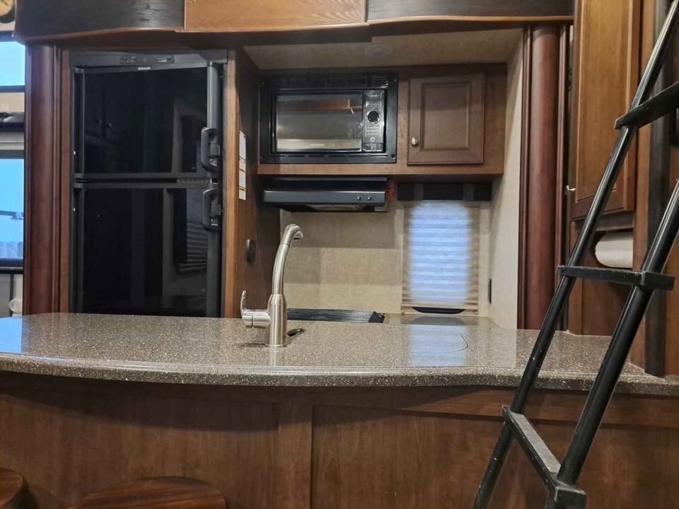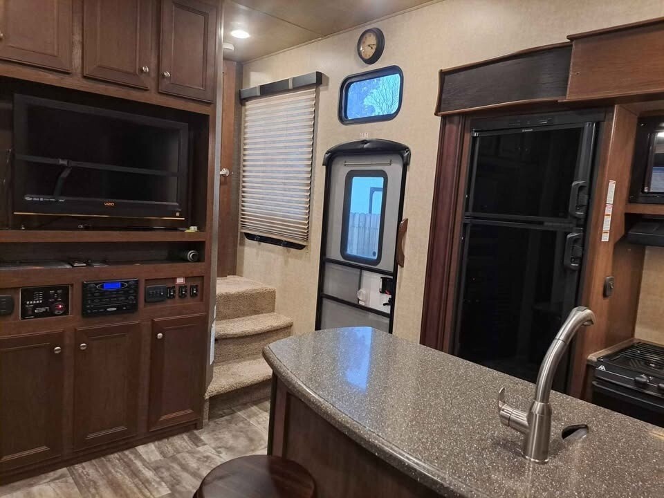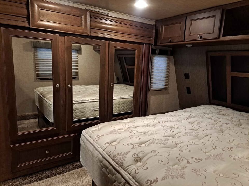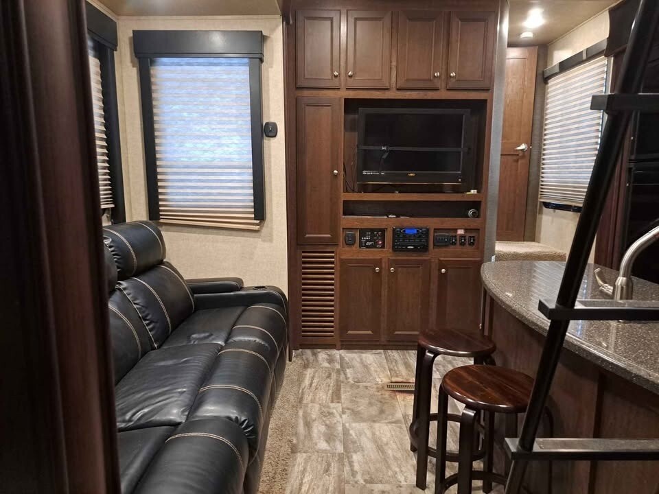 With 3 slide-outs, a large 8’ x 12’ garage (with awning), a 18ft power awning with LED lights, and sleeping for up to 8 people, this toy hauler offers a great combination of living space and functionality.
