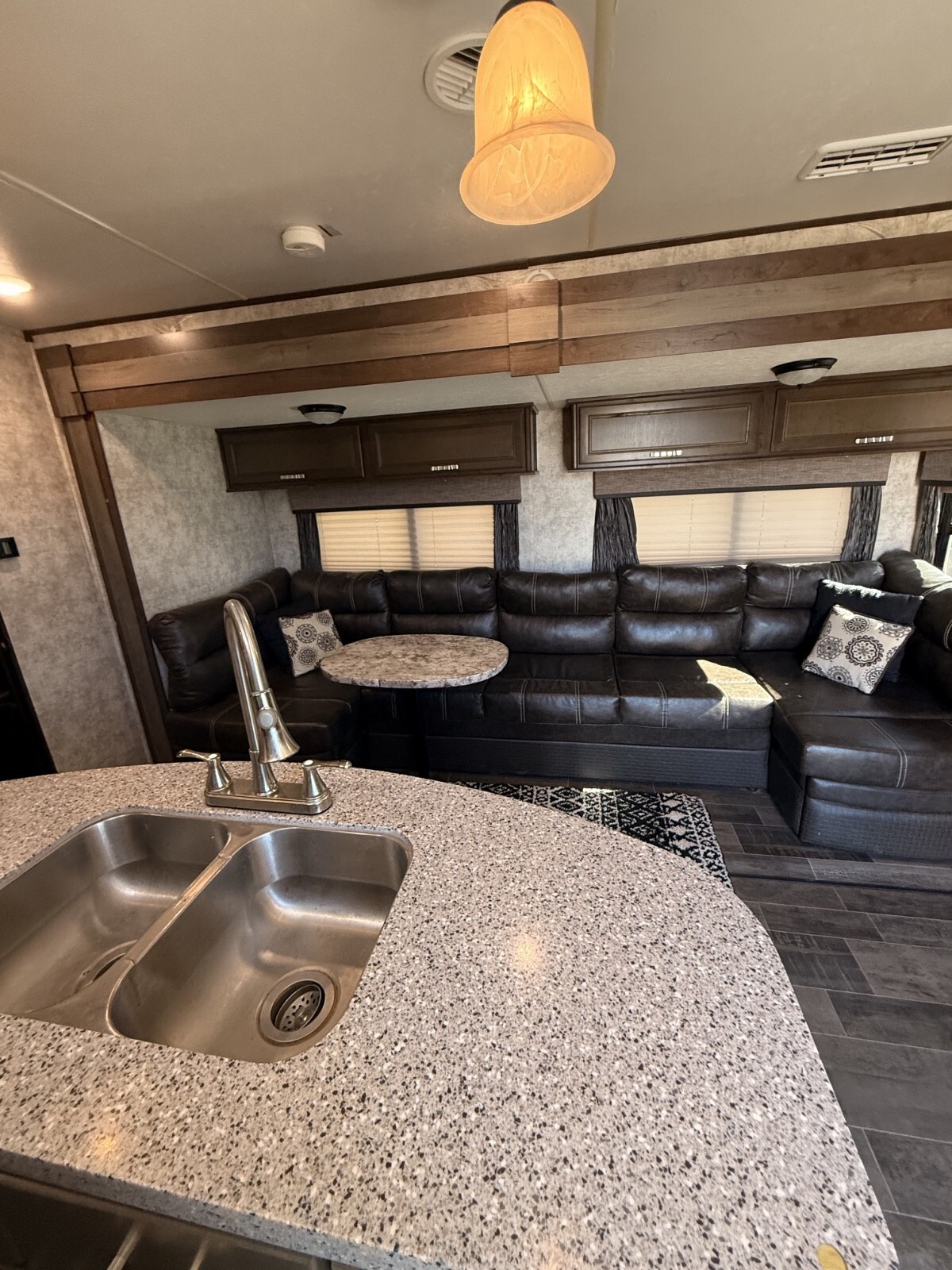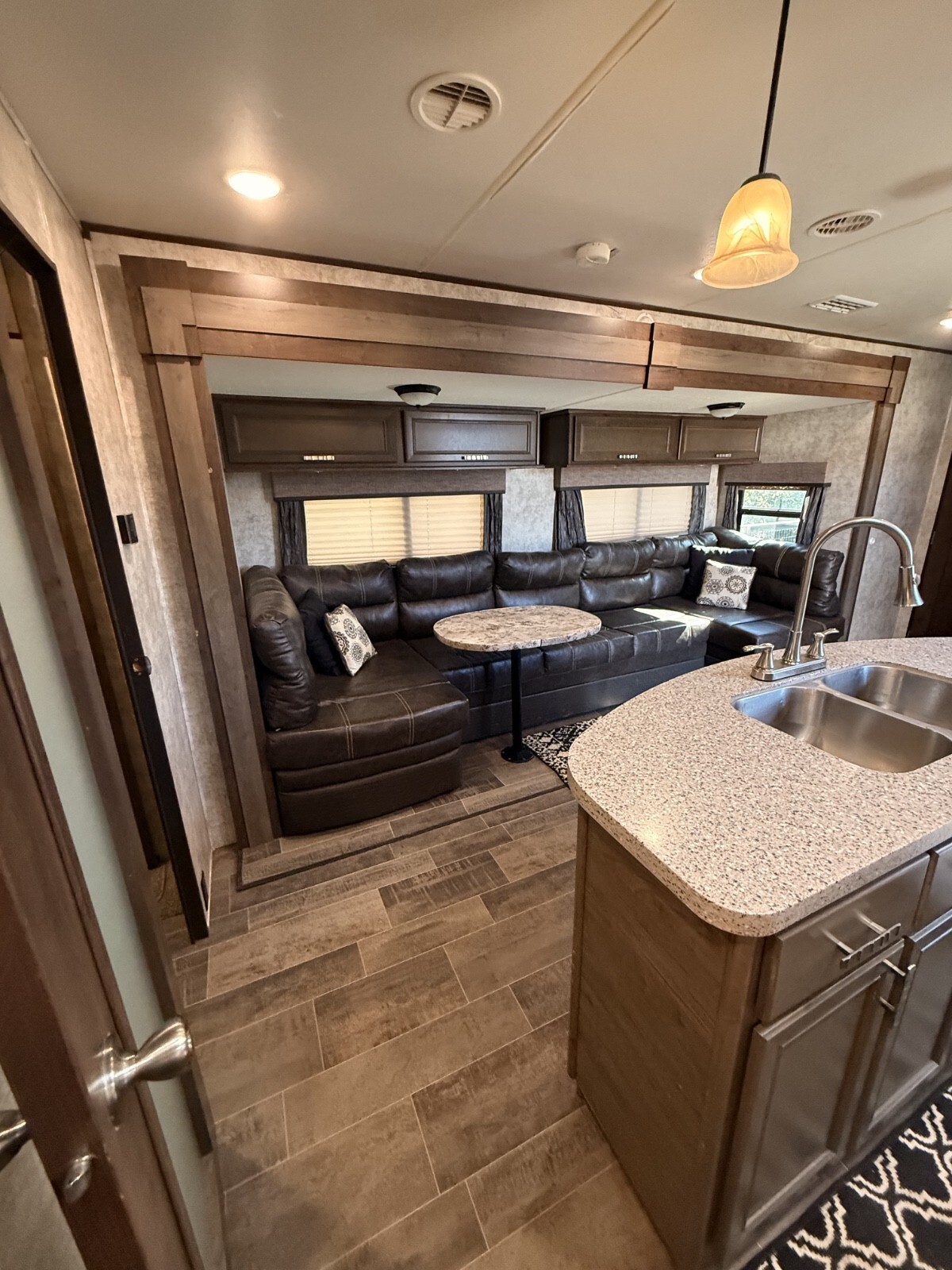- Inside, you will find a beautifully appointed interior with residential-style Corian countertops, aU-shaped dinette, and a large kitchen that makes cooking on the road amazing. The wide-body construction gives every room an open feel that you simply have to see to appreciate. Step outside and you will find a fully equipped outdoor kitchen, perfect for cookouts and evenings under the stars.