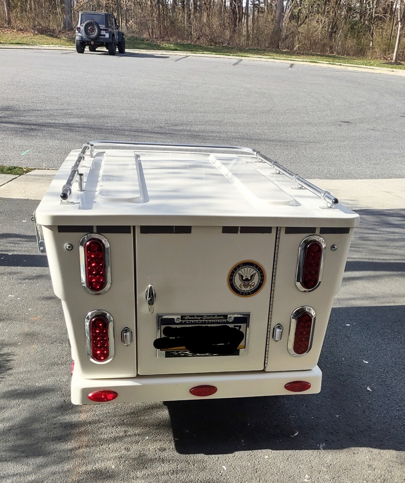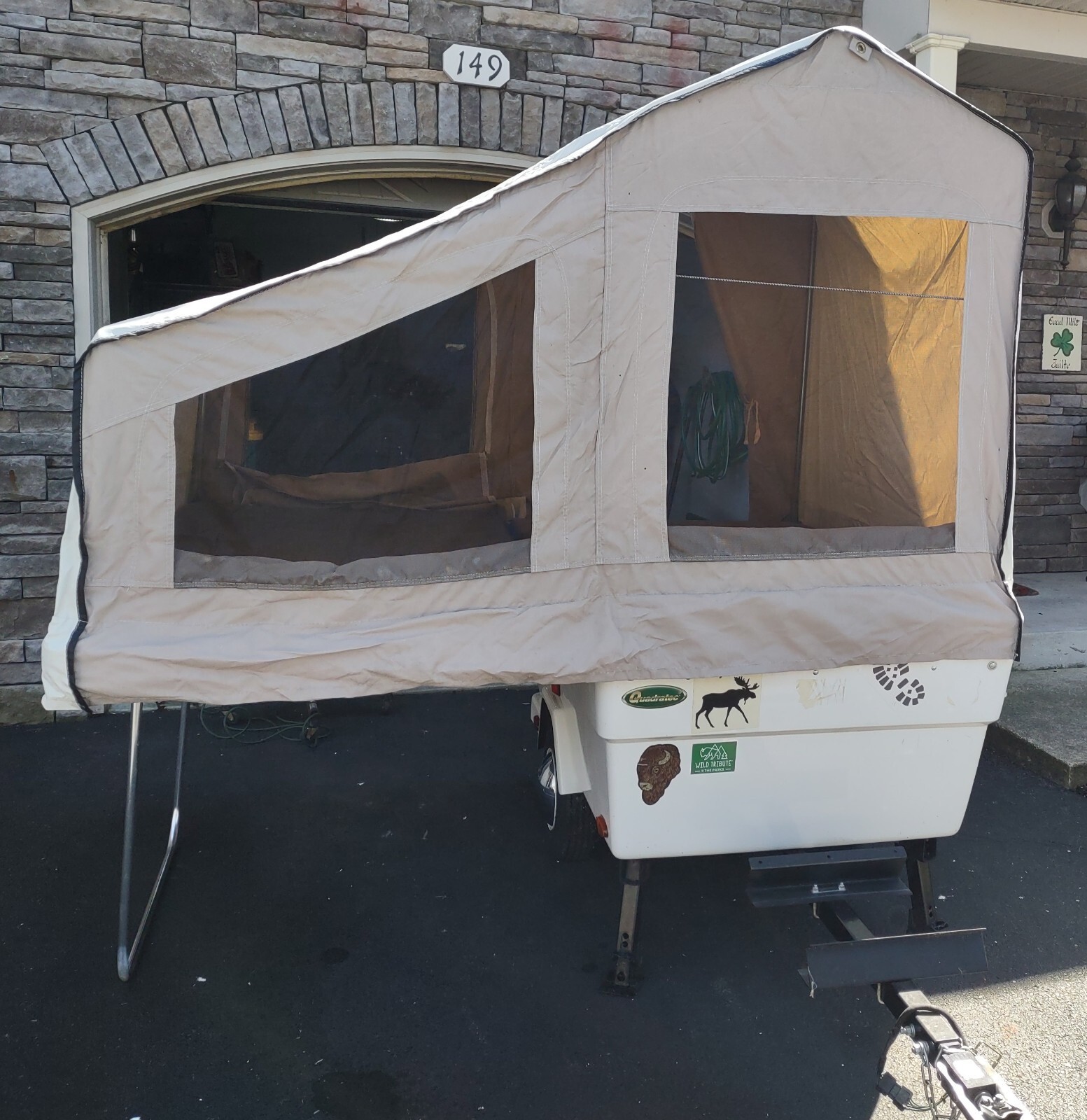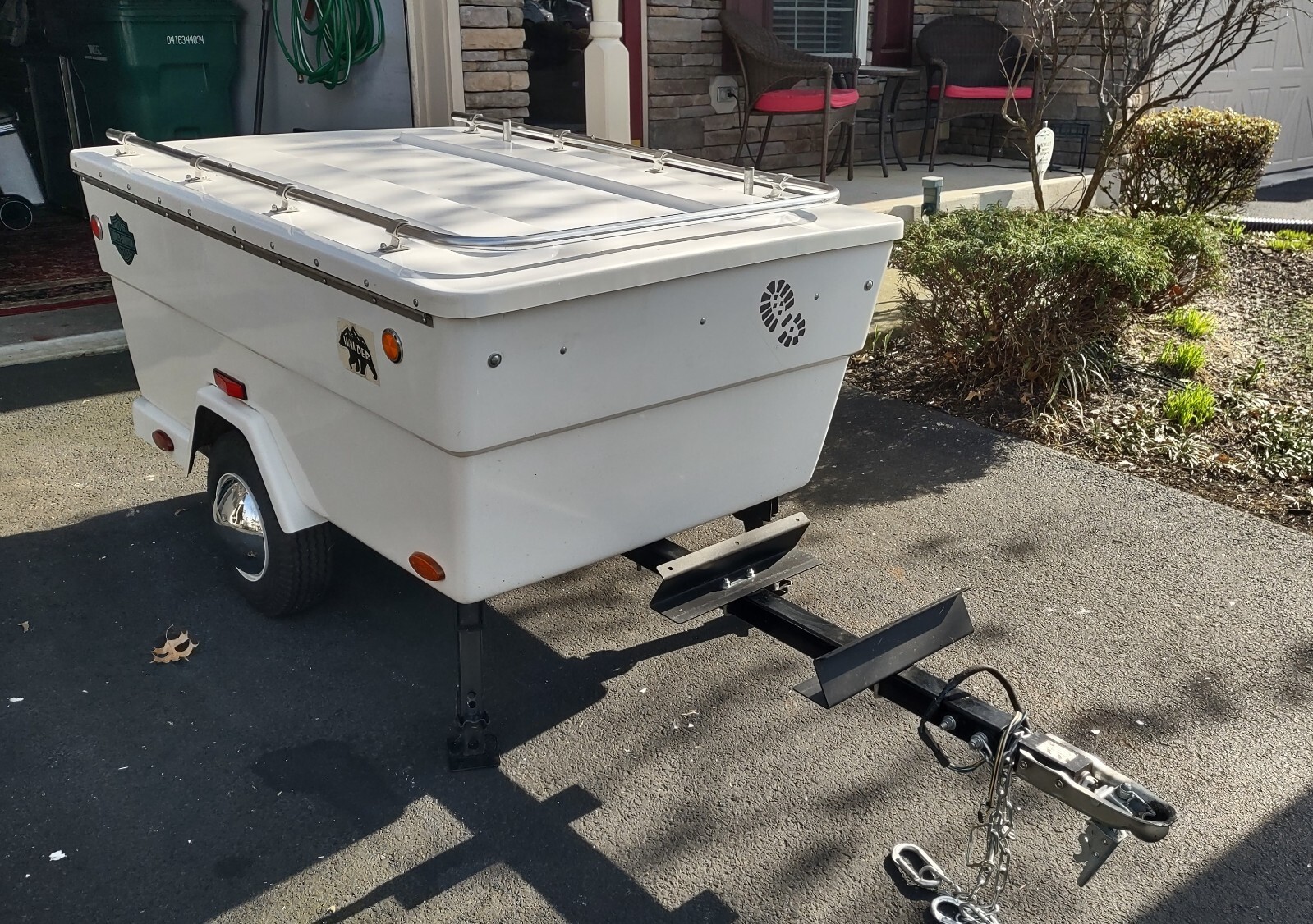 Mileage is roughly 11,300 miles. Weight is approximately 260 total pounds, with an astounding 25-pound tongue weight. Even on a bike, it's like it's not even there. Always pampered, well cared for, and garage-kept when not in use. I have a clear PA title and all sales records available. This camper includes a Fender Lightbar package, Awning package, Swivel Coupler, Cooler Mounting Bracket, Chrome Moon Hubcaps, Alloy Wheels, Chrome Light Bezels, Hitch, and Spare tire/wheel.