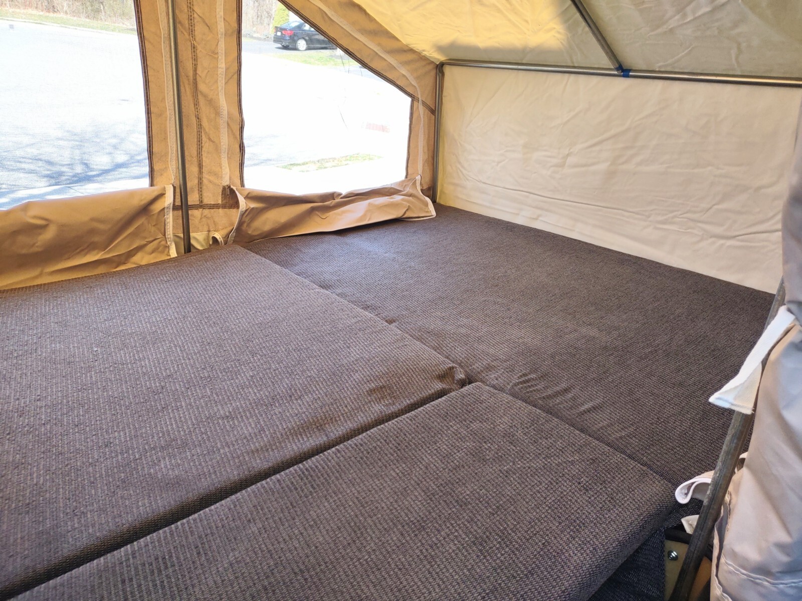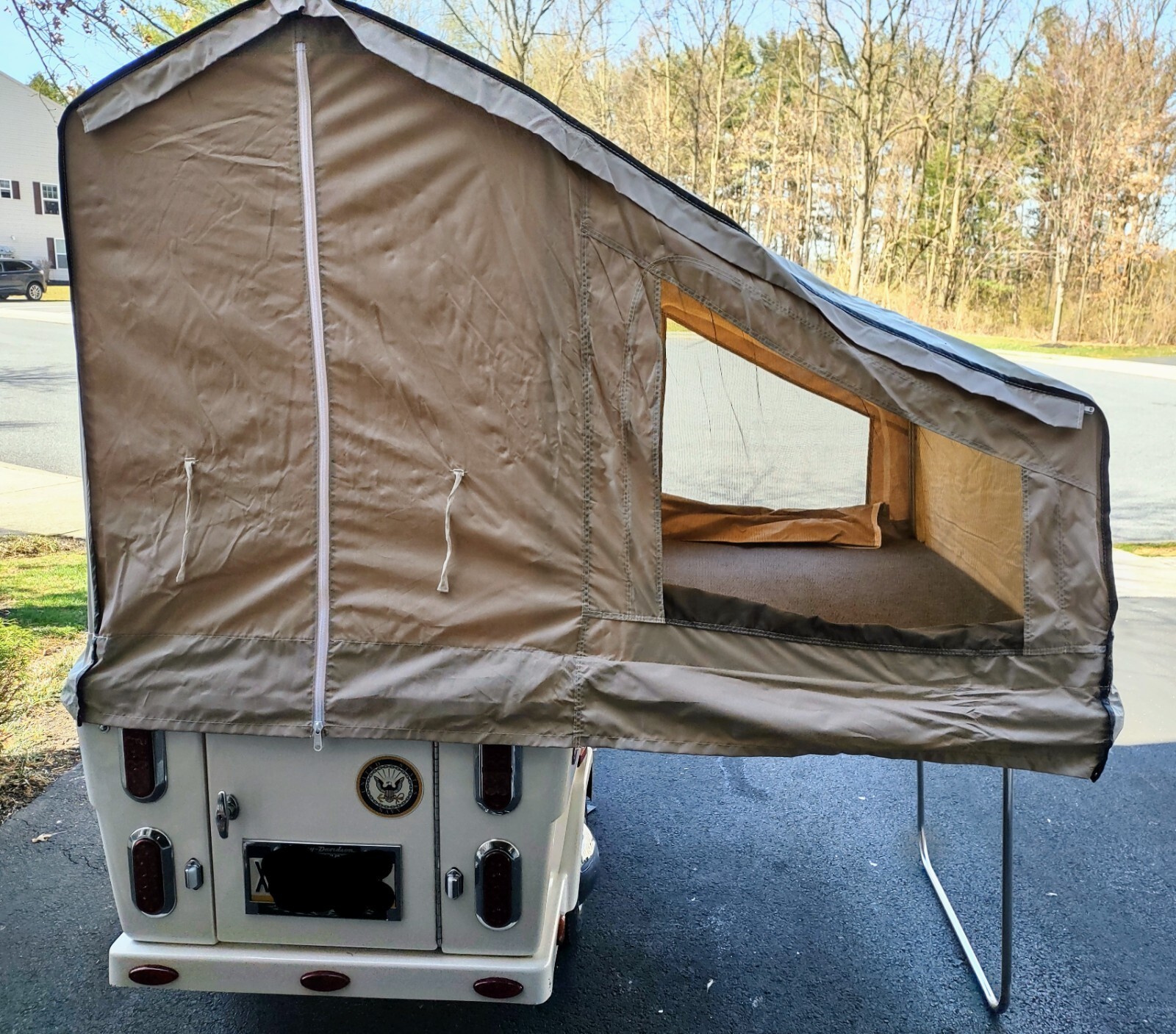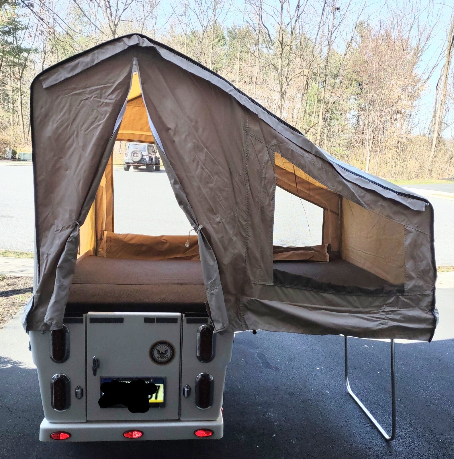All components are sound and free of damage, tears, holes, etc. The Mini Mate sleeps two adults comfortably, one person luxuriously. Sleeping surface measures 6'5" x 4'6", complete with cushions as shown. The Mini Mate has a full fiberglass body and lid, LED lighting, and independent rubber torsion suspension. The under-bed storage space adds 15 cubic feet. It comes with a UV/Water-resistant canvas awning, 4 attached leveling/stabilizer jacks, 6'4" headroom clearance at the peak, and a 2-minute setup time. I encourage you to Google this camper and watch the videos.