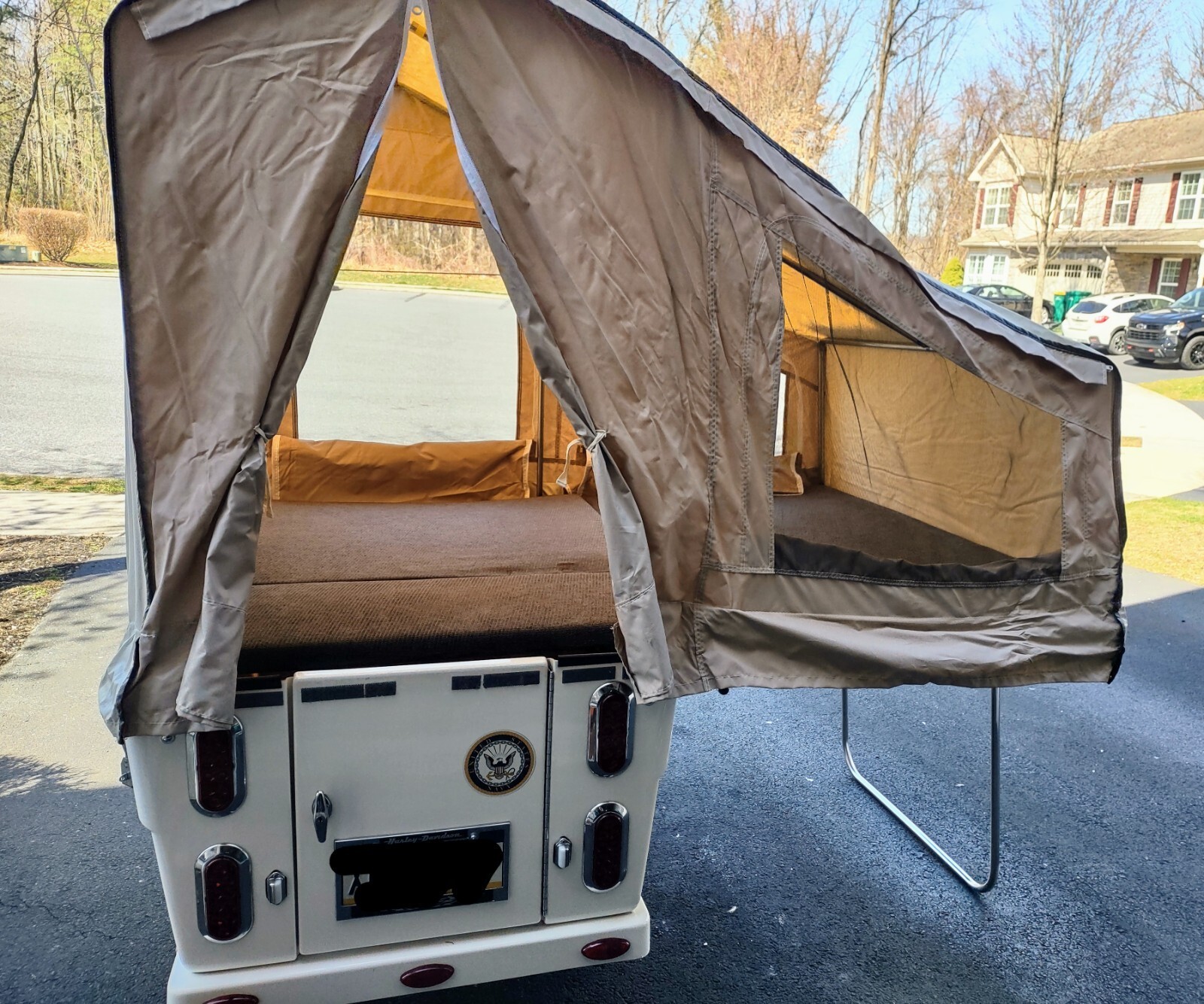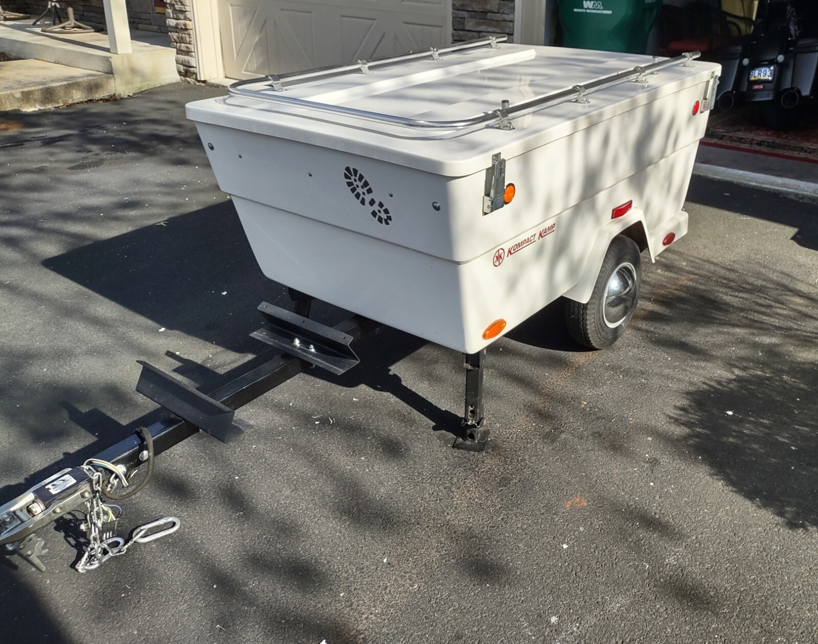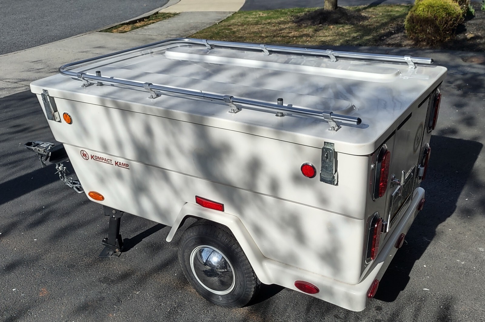 The Kompact Kamp Mini Mate Camper is built by a 2-man, father/son team out of Myerstown, PA. Their site is readily available on the net. This great little camper is built for motorcycle hauling (and I did that) but I can attest that any small/mid-sized vehicle can haul this (because I did that too!) I used this for a solo cross-country, around the country, trip on my Harley Ultra-Glide and also pulled it with my Jeep Wrangler 4-door using a hi/lo hitch on a 10-week USA tour with my daughter. Solid little camper.