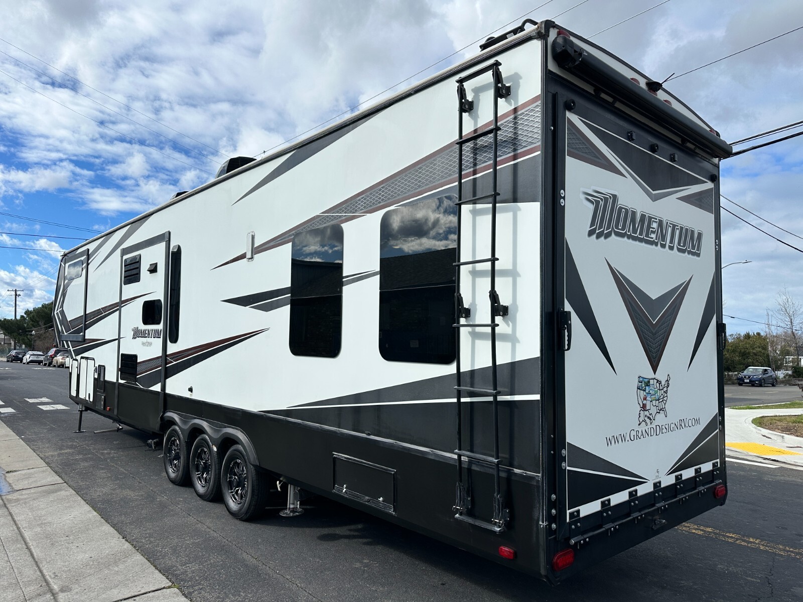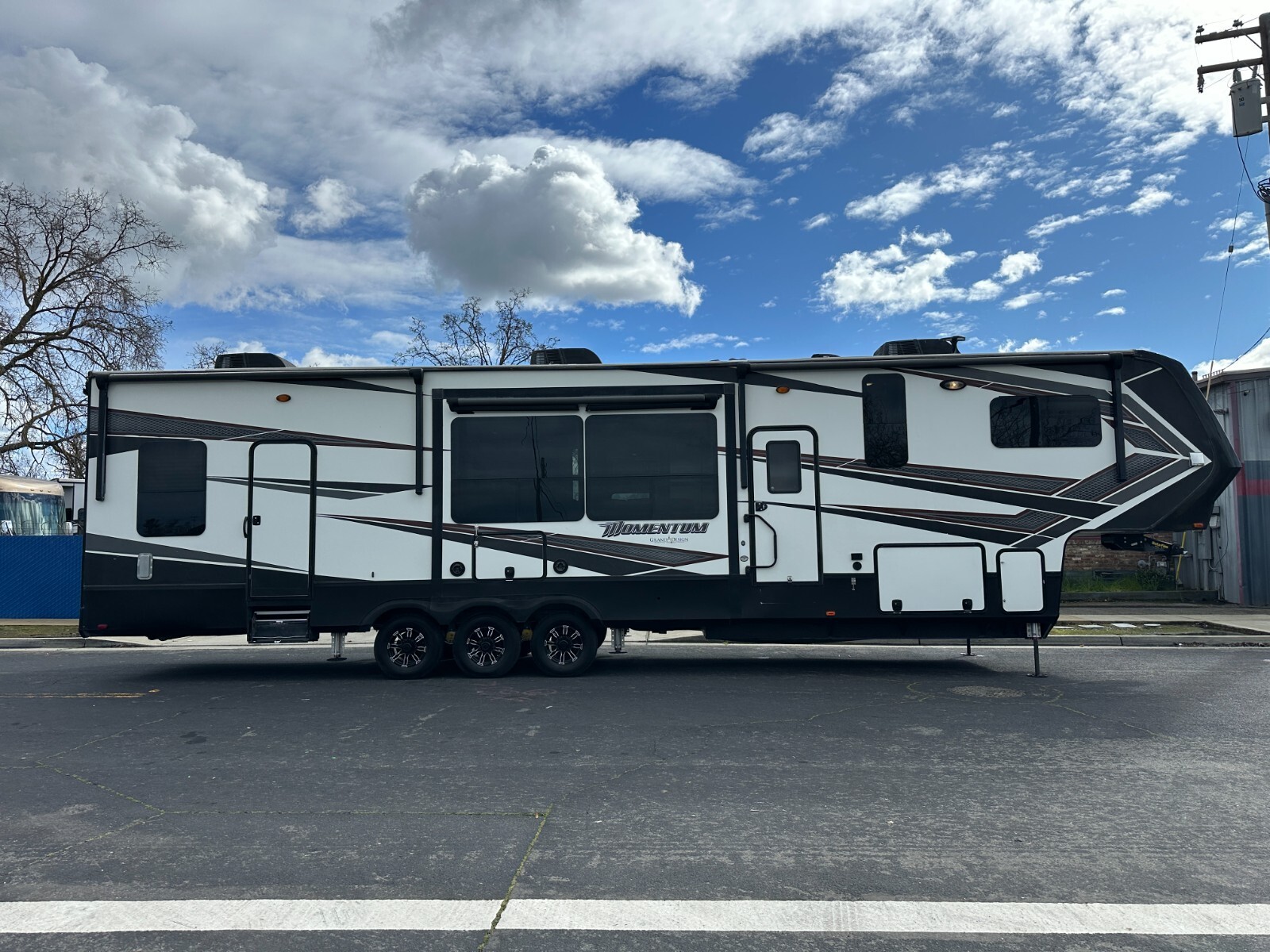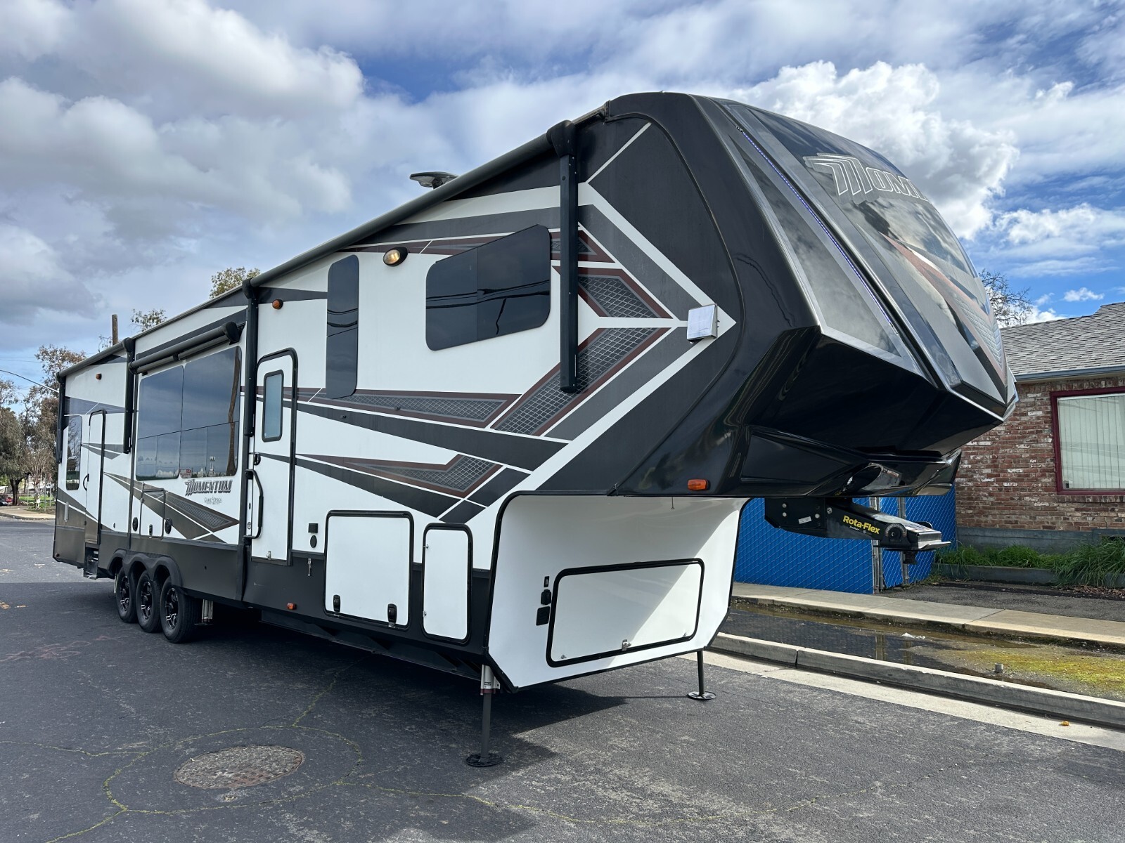 For sale is a 2018 Grand Design Momentum 397TH Toy hauler fifth-wheel trailer. This trailer is unique, offer two full Bathrooms. Rear . Trailer is approximately 43'3" feet long,garage area is 12'6" long,with 3 slide-outs, a GVWR of 20,000 lbs, a dry weight of 15,500 lbs, Fresh water 157gl, Grey 104gl, 104gl black tank and 60gl fuel station on board. This trailer comes with a 6-point leveling system, three air conditioners, rear patio, Led under lighting, Four awnings with LEDs, solar prep, washer/dryer combo in bedroom, window shades, real wood interior, solid counter tops, and much more. Inside features a large bedroom area in the front with a Queen bed can fit King. Large full bathroom has a spacious shower. In the middle is the kitchen with island, a large double refrigerator, large pantry, a recliner couch for four, fireplace and TV. In the rear of the garage is one more compact full bathroom, and two electrically operated beds/couches with table. Please see over 210 pictures below.
