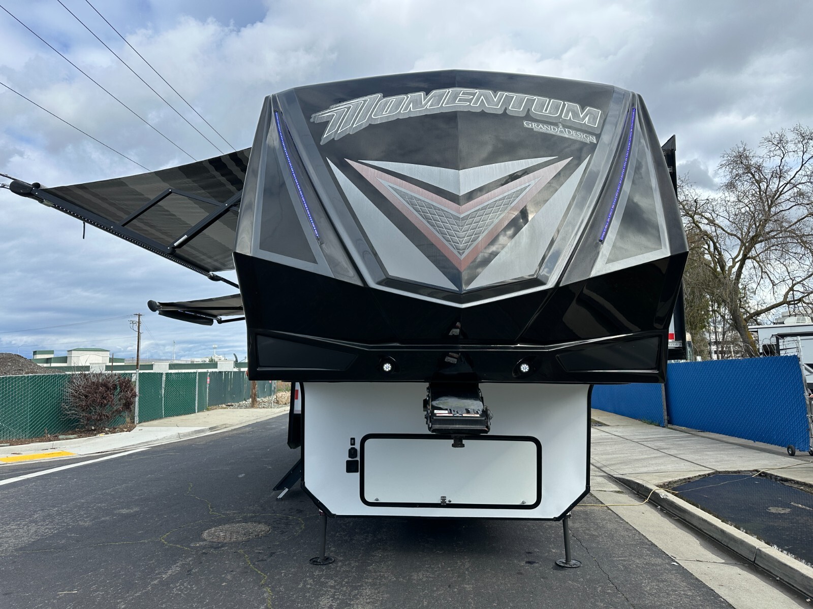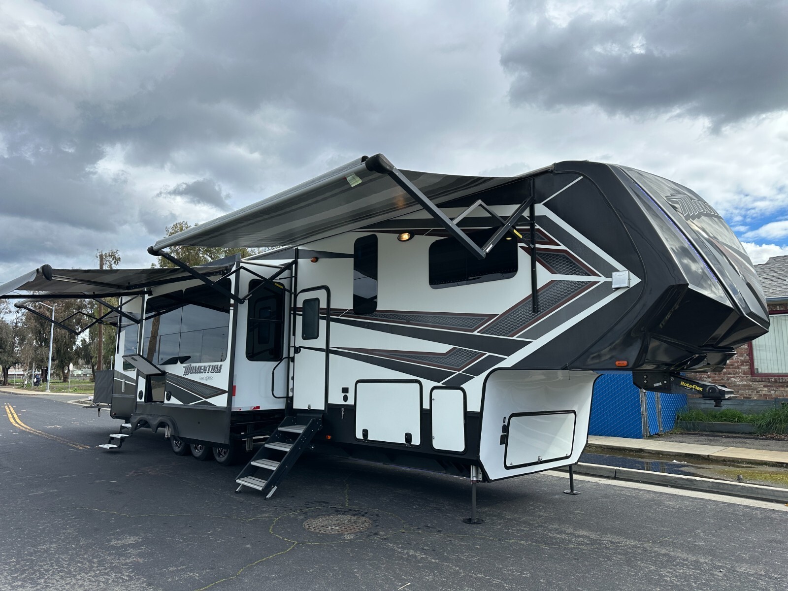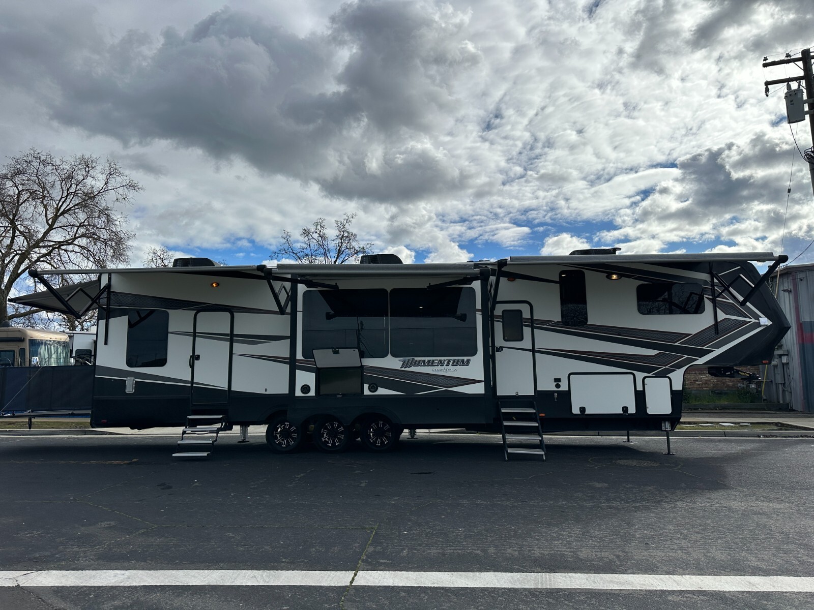 For sale is a 2018 Grand Design Momentum 397TH Toy hauler fifth-wheel trailer. This trailer is unique, offer two full Bathrooms. Rear . Trailer is approximately 43'3" feet long,garage area is 12'6" long,with 3 slide-outs, a GVWR of 20,000 lbs, a dry weight of 15,500 lbs, Fresh water 157gl, Grey 104gl, 104gl black tank and 60gl fuel station on board. This trailer comes with a 6-point leveling system, three air conditioners, rear patio, Led under lighting, Four awnings with LEDs, solar prep, washer/dryer combo in bedroom, window shades, real wood interior, solid counter tops, and much more. Inside features a large bedroom area in the front with a Queen bed can fit King. Large full bathroom has a spacious shower. In the middle is the kitchen with island, a large double refrigerator, large pantry, a recliner couch for four, fireplace and TV. In the rear of the garage is one more compact full bathroom, and two electrically operated beds/couches with table. Please see over 210 pictures below.
