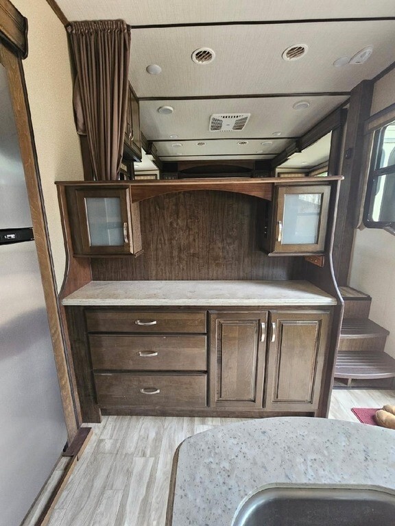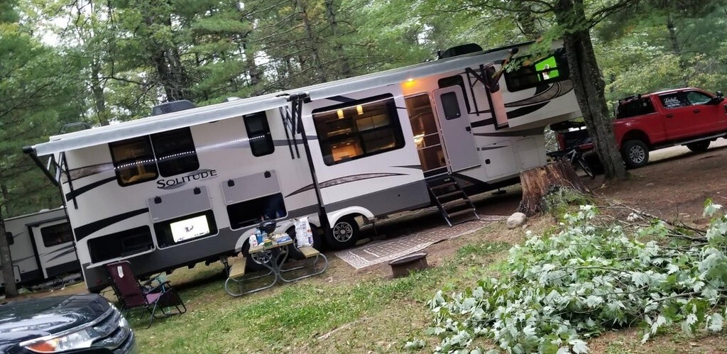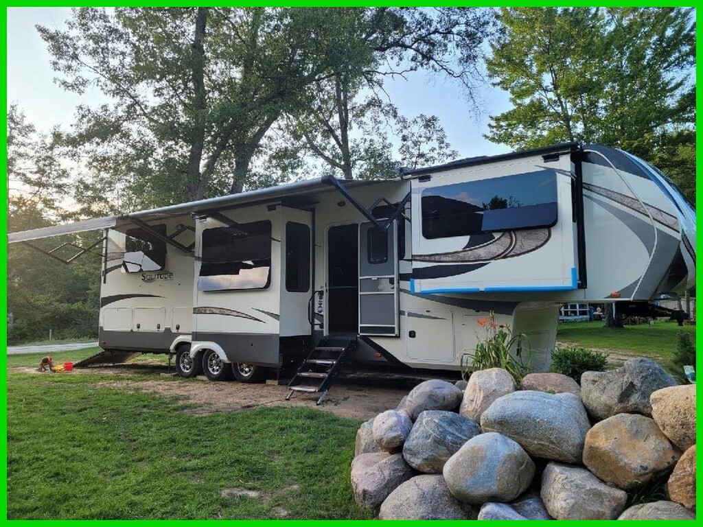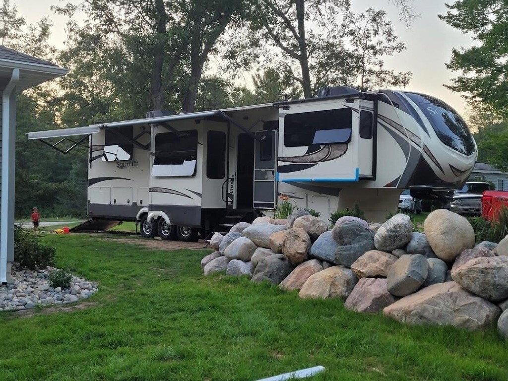 2018 Grand Design Solitude 374TH Fifth Wheel Toy Hauler For Sale in Prescott, MI 48756 This Grand Design has an overall length of 41.25 feet and comes equipped with 5 power-retractable slide-outs, 2 power awnings, 2 A/C units, a 9.25-foot garage area, a fireplace, an outdoor kitchen & entertainment system, and plenty of room to sleep 6. This unit has been well-maintained. VIDEO: Interior Kitchen Features Hutch/Coffee Bar Area 3-Burner Stove/Oven Microwave Full-Size Fridge/Freezer Sink & Faucet on Island Pa