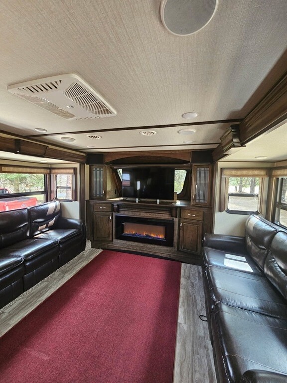 This Grand Design has an overall length of 41.25 feet and comes equipped with 5 power-retractable slide-outs, 2 power awnings, 2 A/C units, a 9.25-foot garage area, a fireplace, an outdoor kitchen & entertainment system, and plenty of room to sleep 6. This unit has been well-maintained.