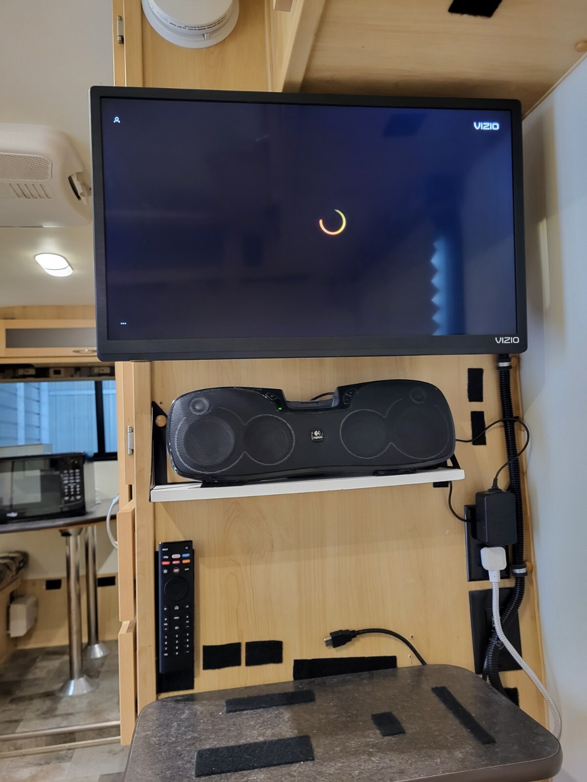 - TV at foot of bed with swing-out arm, stereo speakers and DVD player.