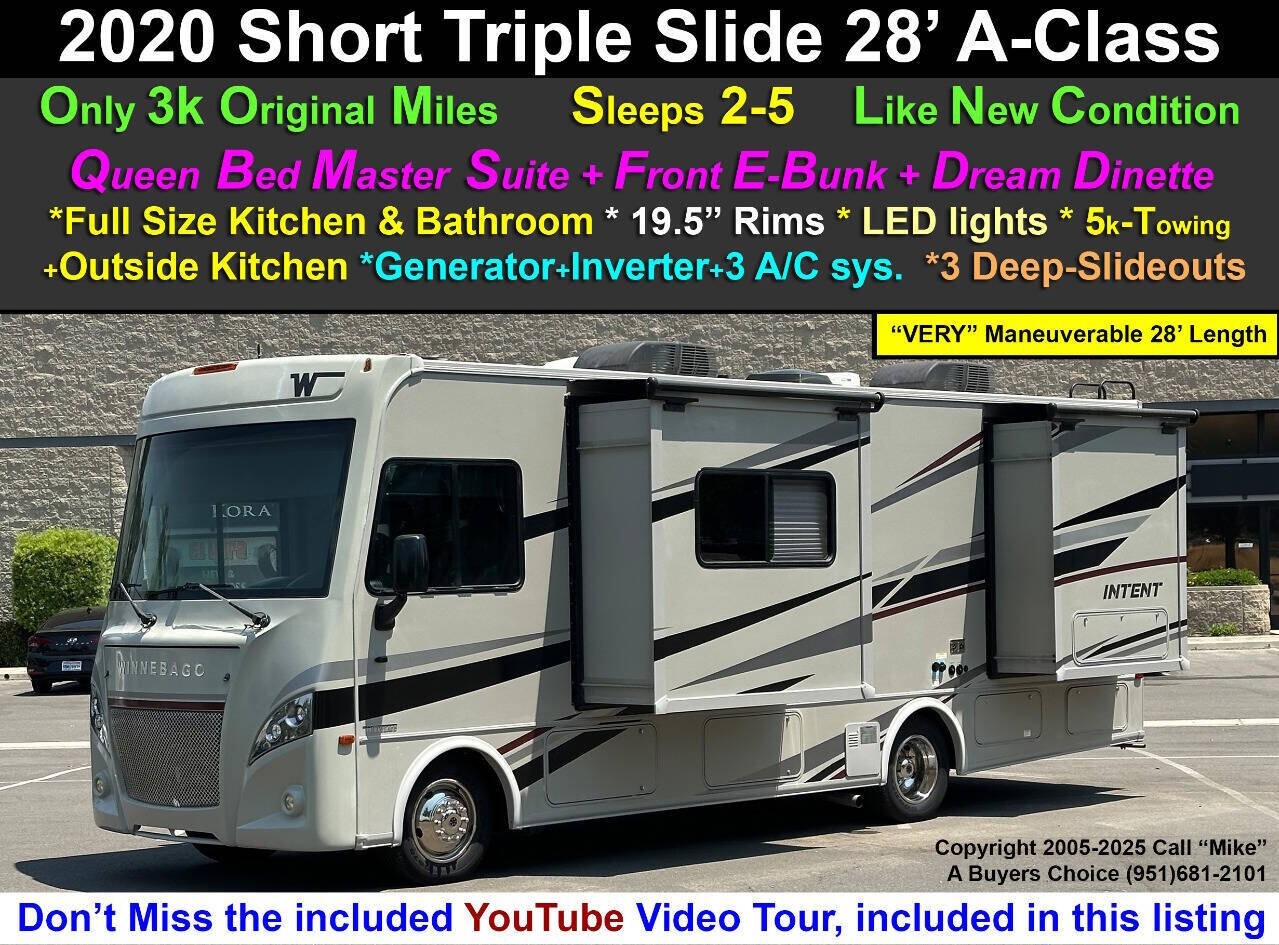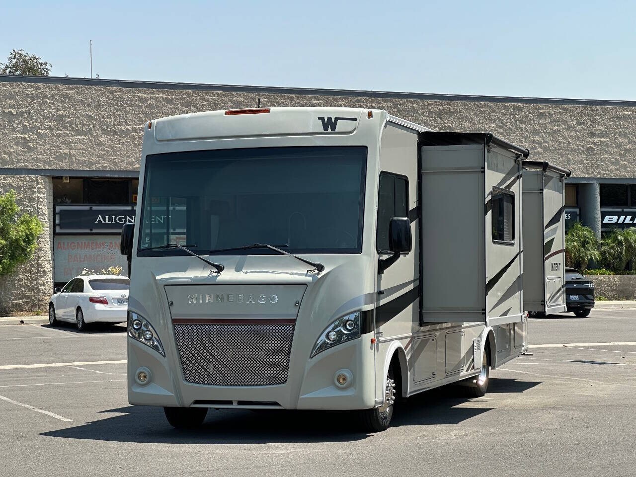 **View the Included YouTube Video in this listing of this ACTUAL RV that you are negotiating to potentially purchase. The Video is professionally filmed and edited with a Steady-cam and is informative and will quickly give you an efficient virtual visit and test drive with this motorhome. The RV featured in this Video is THIS actual motorhome and we currently have well over 1 million views of our YouTube channel. Now Available is this Super Smooth Driving Short A-class with 3 Slide-outs. The Shorter length lets you access popular campgrounds on holiday weekends at a lower cost and higher availability such as Beach Front or State park campgrounds. This one has an Extra Outside Kitchen and large power Shade awning so you are able to enjoy yourself at an affordable cost This unit is almost brand new with under 3-thousand original miles. It is super clean inside and out with a glossy exterior finish. Winnebago is one of the most Durable brands in the RV industry. This nice coach has Rear Queen Bed, Front Electric Bunk Bed, Dream Dinette offering sleep capacity for as many as 5-6 people with enough room to move around inside. The 3 Slide-outs open up the interior with abundant storage and personal space inside. Many other Class A RVs are as long as 38' but this one is 10' shorter and thus much simpler to drive and maneuver. it also uses less fuel because it is lighter weight. Under the Queen bet is a large storage area but it is also set up so if you have pets you can use that area for the pets retreat. The front windshield is in excellent condition. The paint is in great shape and condition. No dings are visible on this vehicle. The interior was well maintained and is extra clean. The exterior was well maintained and is extra clean. The engine is functioning properly and has no issues. This vehicle has no previous collision damage. The transmission shifts very smoothly. The brakes are in great condition. The battery is in excellent condition. The car was previously owned by a non smoker. This vehicle comes with a spare key. This vehicle had one previous owner.