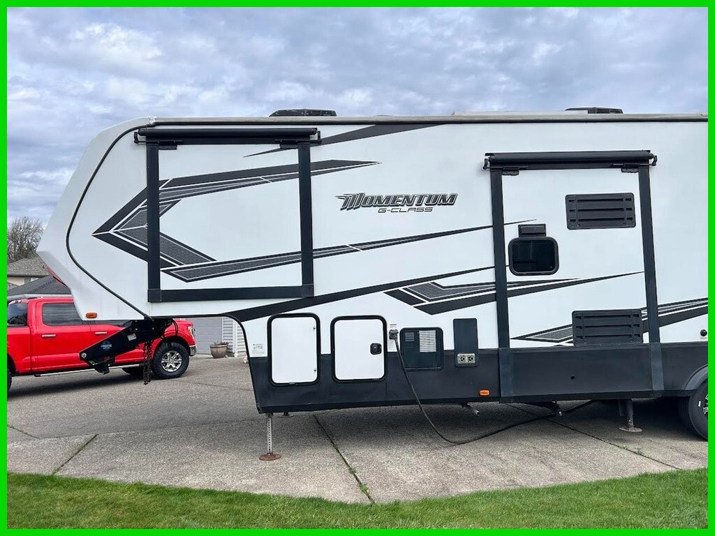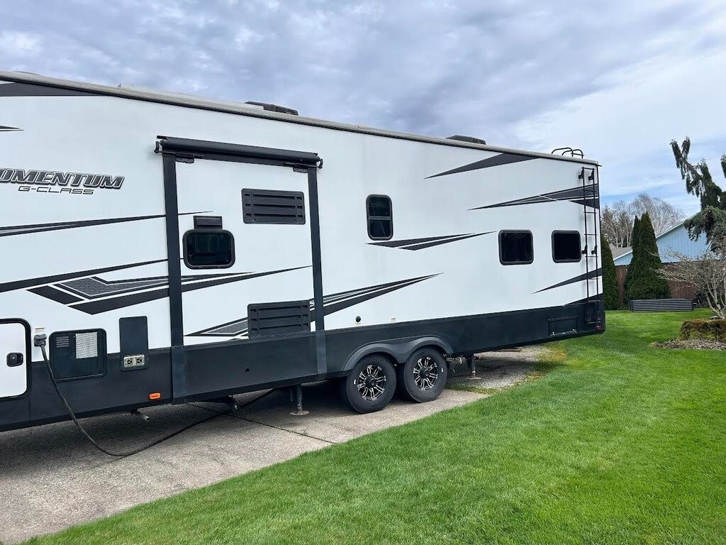 2019 Grand Design Momentum G-Class 350G Fifth Wheel Toy Hauler For Sale in Battle Ground, WA 98604 This Grand Design has an overall length of 39.75 feet and comes equipped with 3 power retractable slide-outs with toppers, 2 power retractable awnings, 3 A/C units, an Onan 5500 generator, a 14’6” garage, and plenty of room to sleep 8. This unit has been well-maintained. Kitchen Features 3-Burner Stove/Oven Overhead Fan Microwave Full-Size Fridge/Freezer Sink & Faucet Pantry Storage Space &