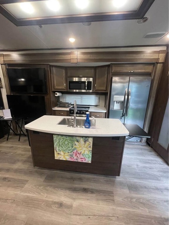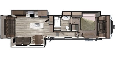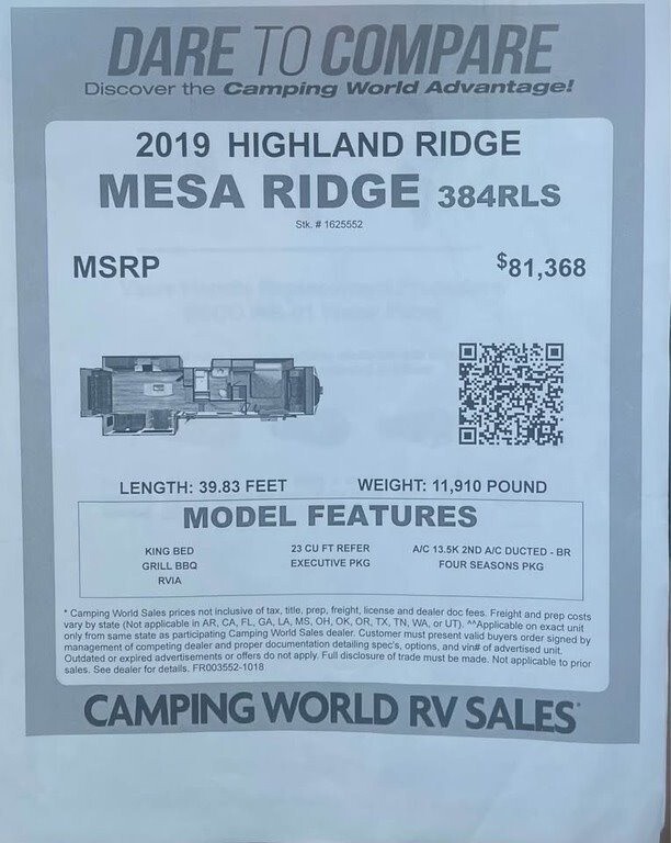 This 2019 Highland Ridge Mesa Ridge MF384RLS has an overall length of 39.8 feet and comes equipped with 3 power retractable slide-outs, 1 power retractable awning, and plenty of room to sleep 4–6 comfortably. This unit has been well-maintained, used very little, and comes loaded with extras.