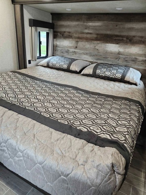 This Keystone has an overall length of 41.33 feet and comes equipped with 4 power retractable slide-outs, 6-point leveling system, 1 power retractable awning, 2 A/C units ( 1 is heat pump), and plenty of room to sleep 8. This unit has been well-maintained.