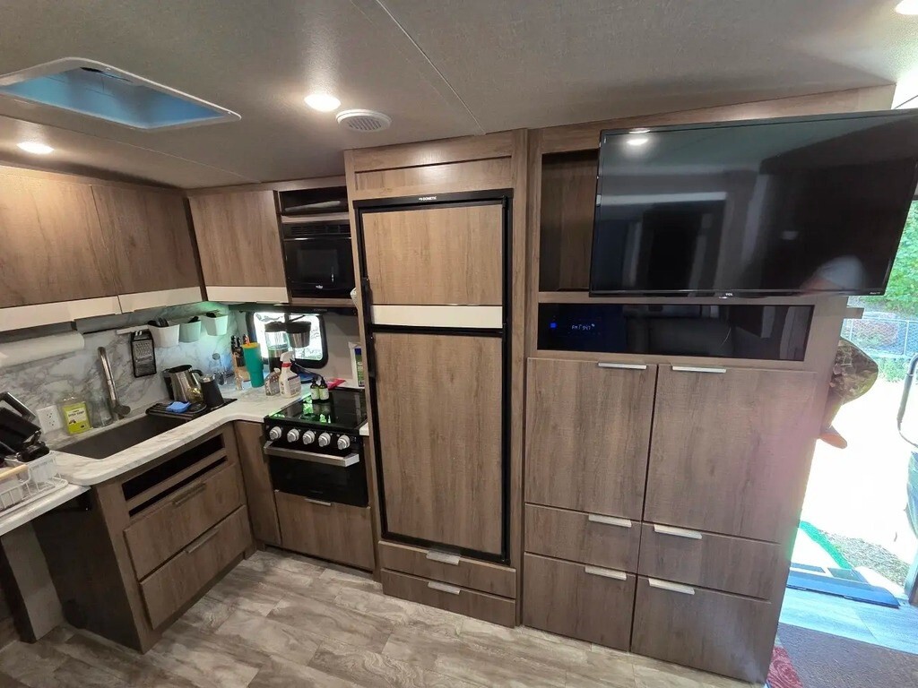 This Grand Design has an overall length of 33.92 feet and comes equipped with 1 power-retractable slide-out, a 21-foot power awning, 1 A/C unit, a bunkhouse, an outdoor kitchen, and room to sleep up to 8. This unit has been well-maintained and has 1 year remaining on the transferrable warranty.