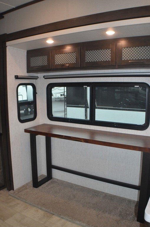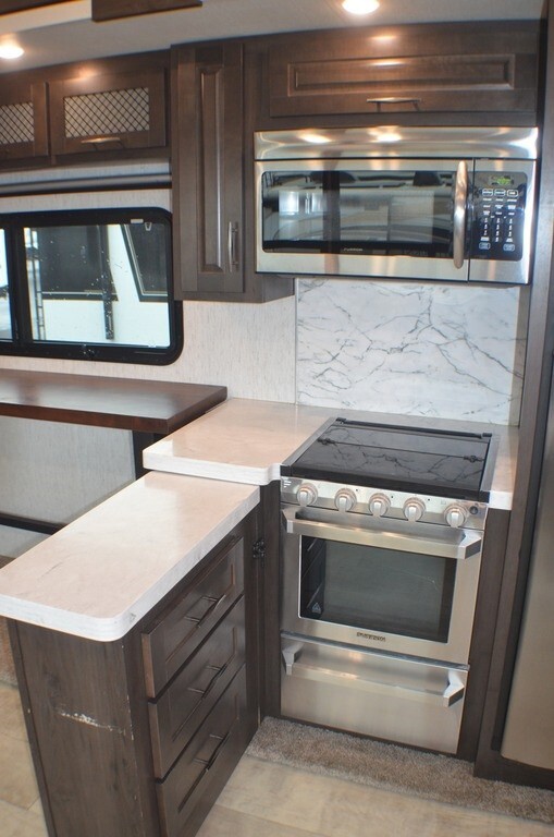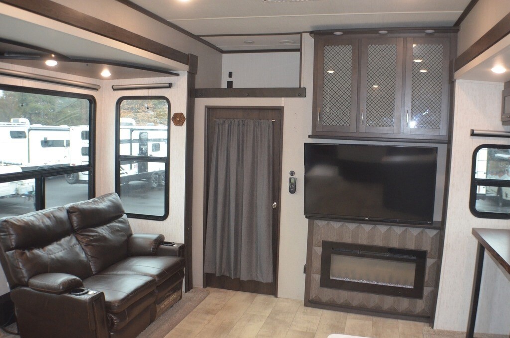 Loft Opposing Slides L-Shaped Sofa Dual Entry Pull-Out Cutting Board 12' 6" Separate GarageIf relaxation and off-road fun have been calling your name, this Momentum M-Class toy hauler fifth wheel will provide the luxury you love along with toy storage. From the separate garage featuring 12' 6" of space for an ATV and dirt bikes and the front private bedroom that features a queen-size bed and a wardrobe slide to the fabulous kitchen and living area with theatre seating, an L-shaped sofa, and a fireplace with a 49" LED TV above, you can relax indoors when you aren't having fun outdoors. You will also thoroughly appreciate the free-standing dinette when it comes time to sit down with a full plate of spaghetti for dinner.