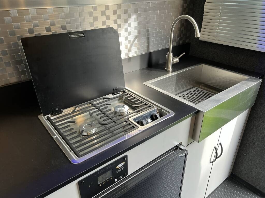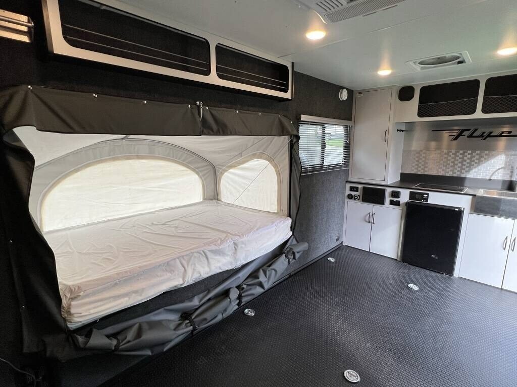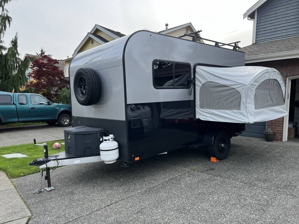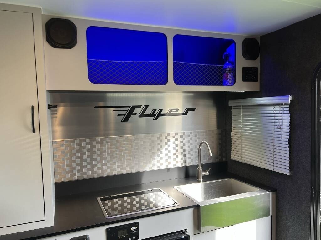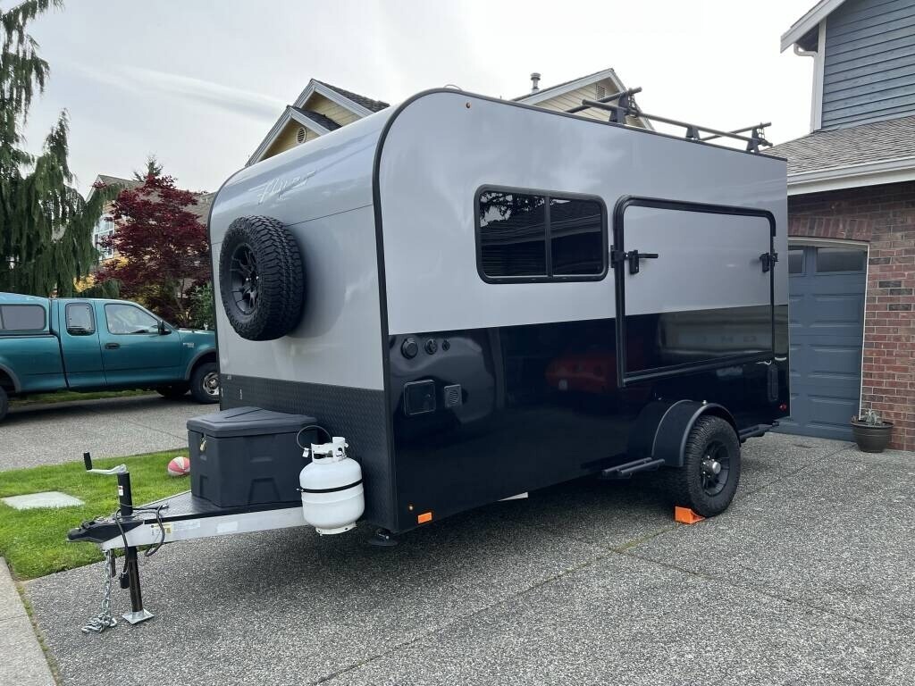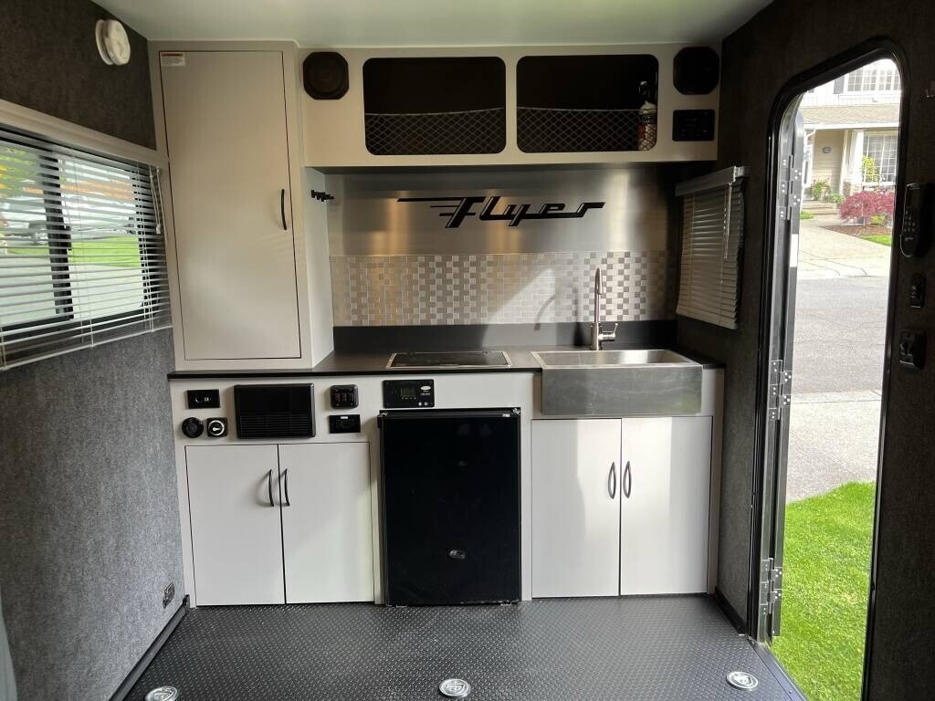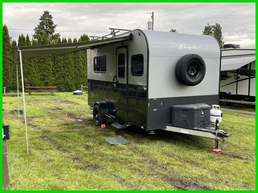 2021 inTech Flyer Discover Travel Trailer For Sale in Kenmore, WA98028 This Flyer has an overall length of 18 feet and comes equippedwith 1 power awning, 1 A/C unit, garage space with tie-downs, roof-mounted solarpanels, and room to sleep up to 4. This unit has been well-maintained. Interior Features 2-Burner Stovetop with Cover Compact Fridge Sink & Faucet Storage Cabinets Expandable Soft-Shell Bunk Bed Bluetooth Stereo System MaxxAir Vent Fan 9 Tie-Downs Rear Ramp Door