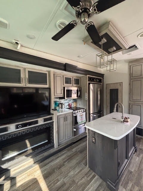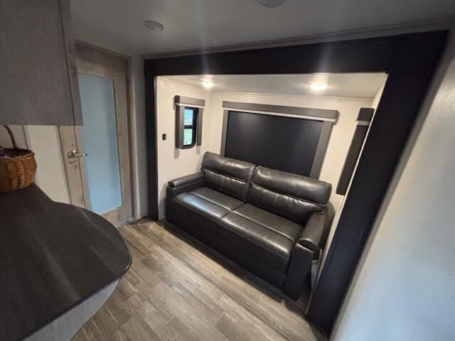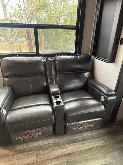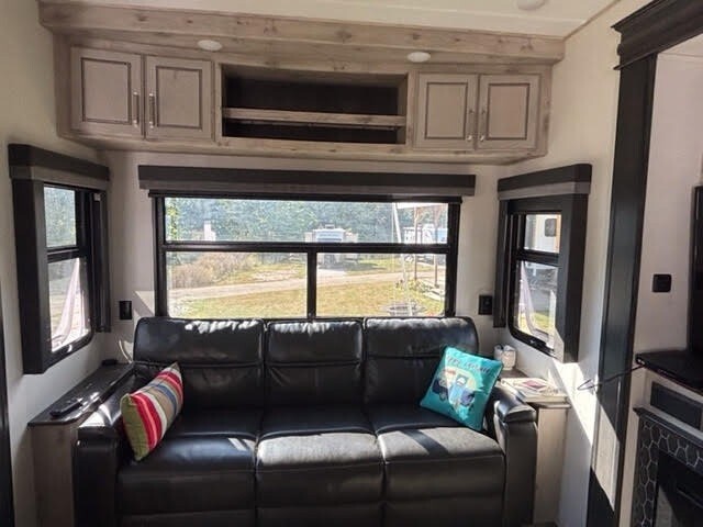 Rear Living Area with Dual Sofas, Recliners, and a Cozy Electric Fireplace