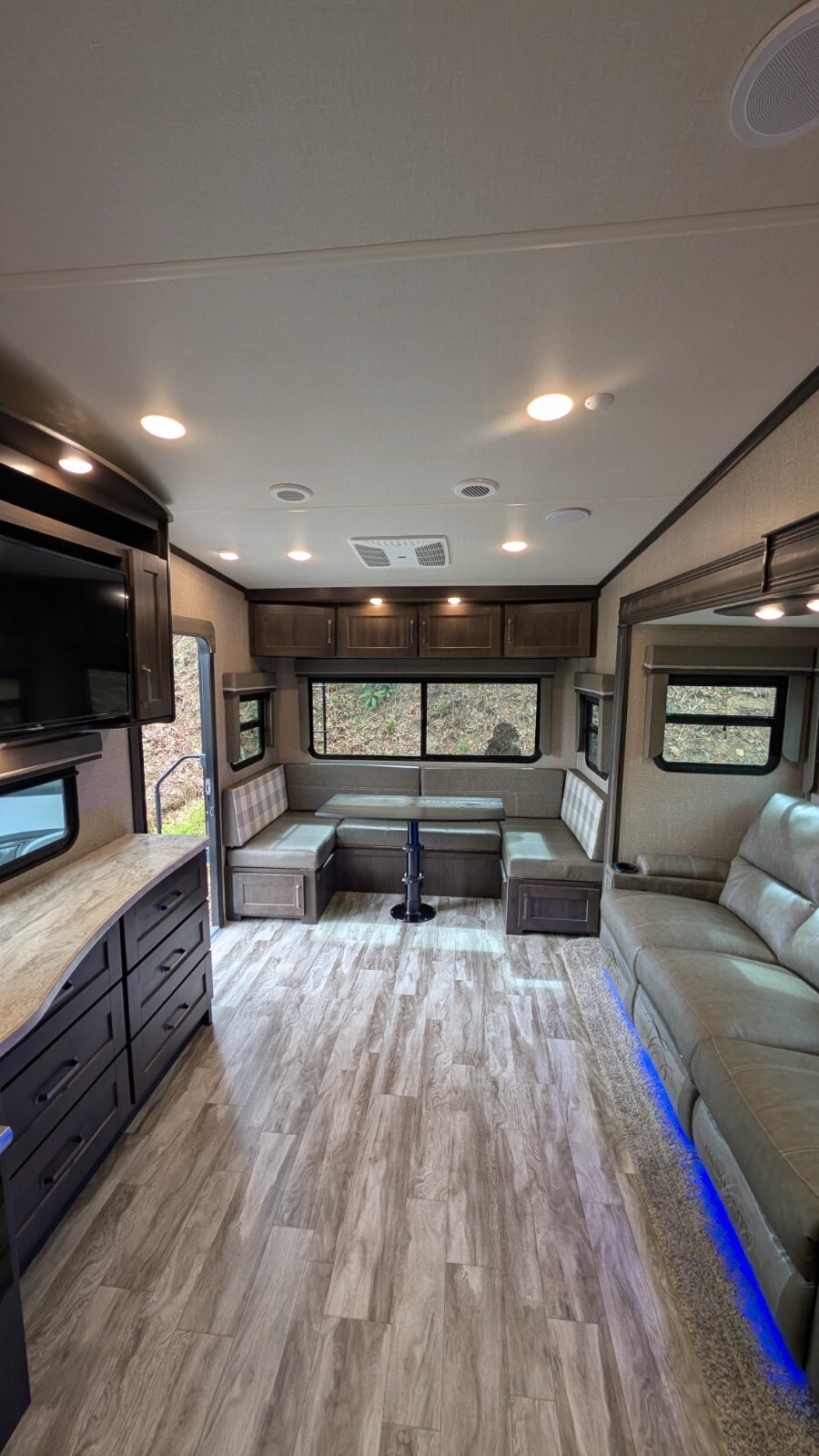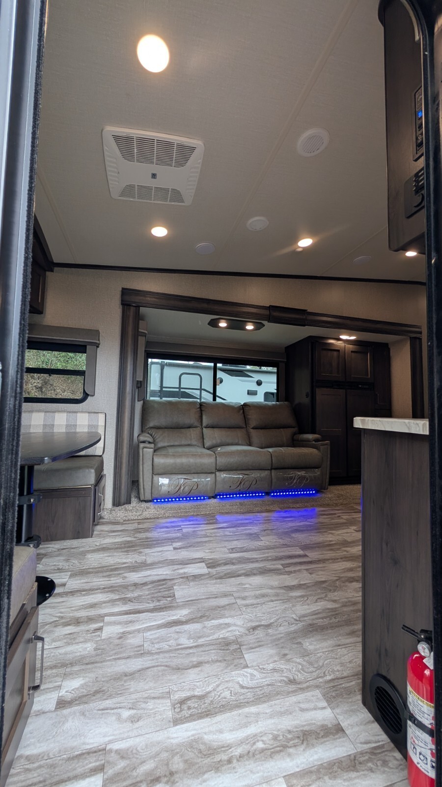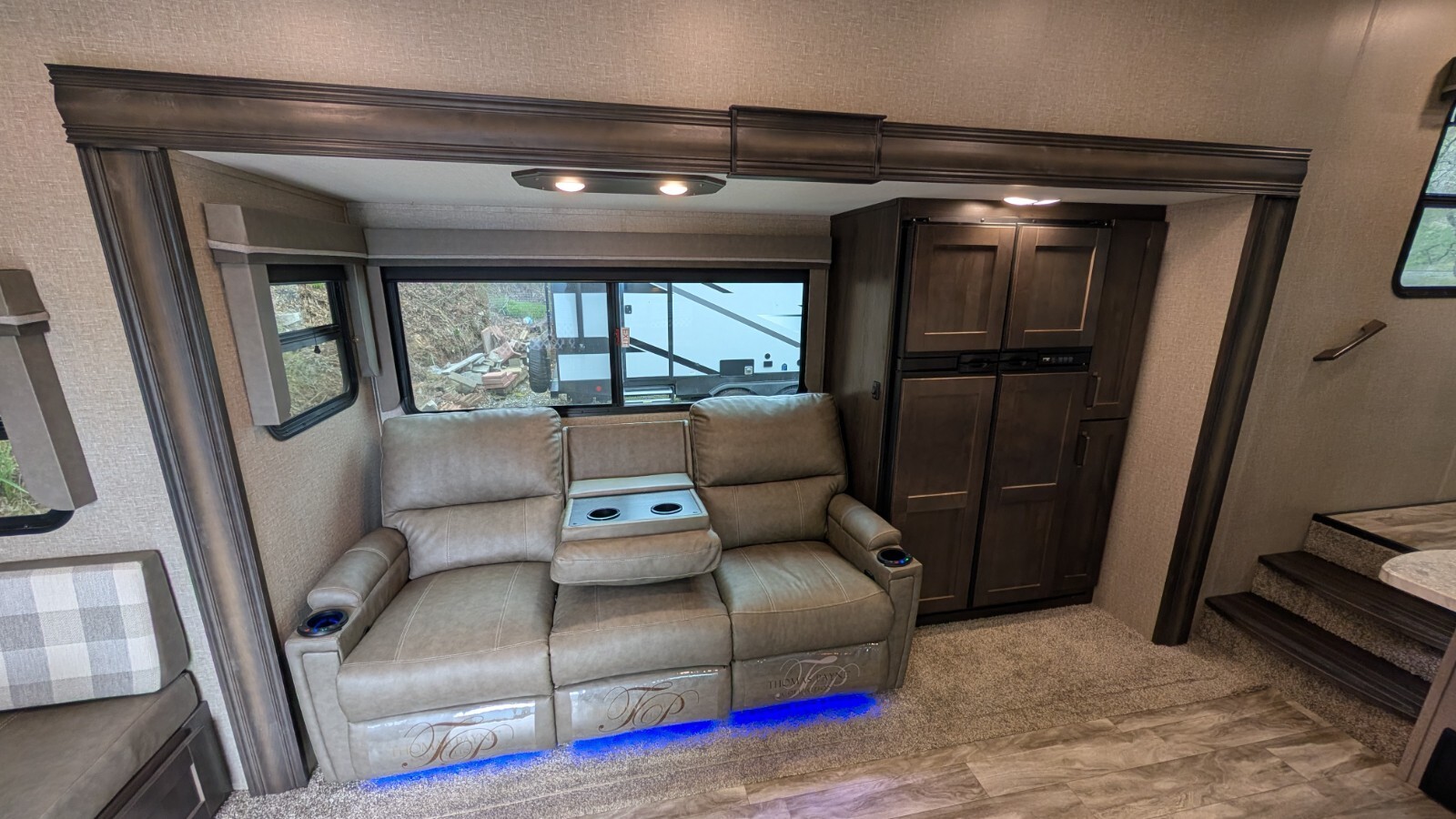 30ft50ampLCD Control Center1/2ton TowableAuto Leveling4 Season InsulationKeyless Remote EntryTankless Water HeaterWinegard Air 360+ Internet/TVMORryde SuspensionTurning Point Pin BoxLarge KitchenPantryResidential FridgePop-up Kitchen Counter ExtentionWood CabinetsHeat/massage/lighted cupholders and 3 reclining theater seats with center drop table.U-shaped dinette that drops down into a bed.Large ShowerTons of StorageQueen BedSmart TVsIndoor/Outdoor Radio w/BluetoothStep StabilizerRear Cargo Hitch