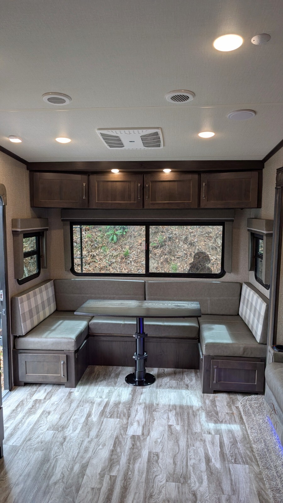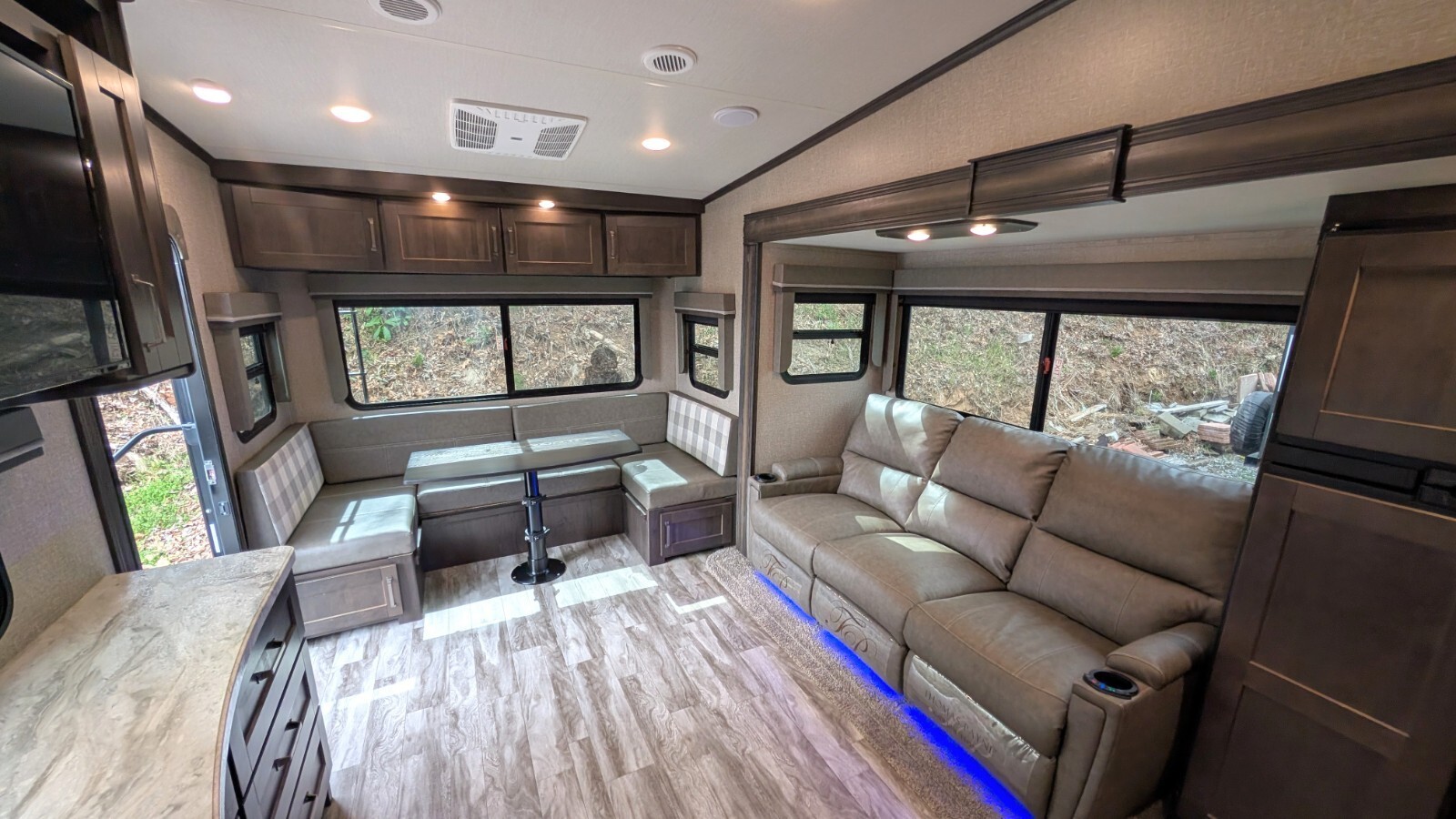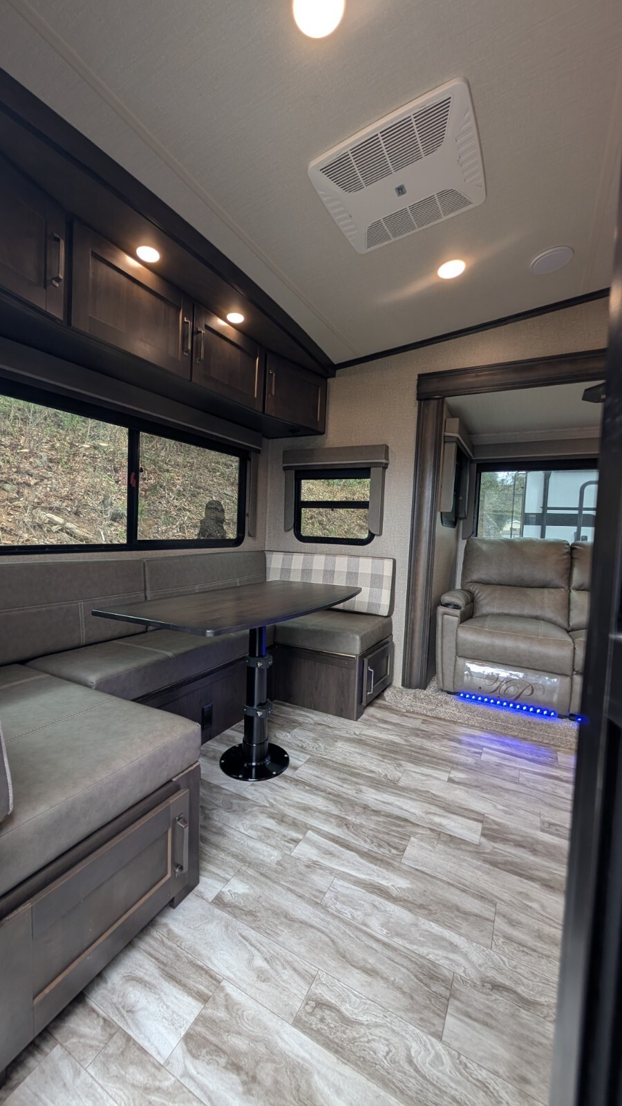 30ft50ampLCD Control Center1/2ton TowableAuto Leveling4 Season InsulationKeyless Remote EntryTankless Water HeaterWinegard Air 360+ Internet/TVMORryde SuspensionTurning Point Pin BoxLarge KitchenPantryResidential FridgePop-up Kitchen Counter ExtentionWood CabinetsHeat/massage/lighted cupholders and 3 reclining theater seats with center drop table.U-shaped dinette that drops down into a bed.Large ShowerTons of StorageQueen BedSmart TVsIndoor/Outdoor Radio w/BluetoothStep StabilizerRear Cargo Hitch