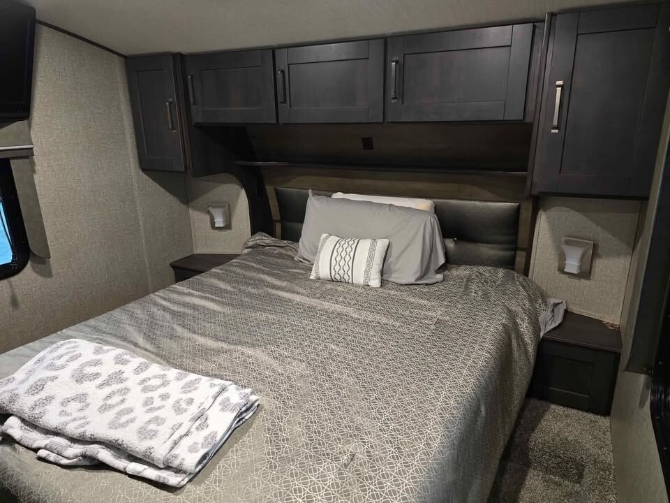 “This 2022 Grand Design Reflection 31MB Fifth Wheel offers a spacious and well-appointed layout with an overall length of 36.17 feet. It features three power retractable slide-outs, a power awning, and dual air conditioning units, providing a comfortable environment for up to six people. The unit has been carefully maintained and is ready for both weekend getaways and extended travel. The thoughtfully designed bunkhouse adds extra sleeping space and versatility, making it ideal for families or guests.