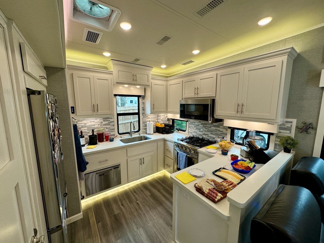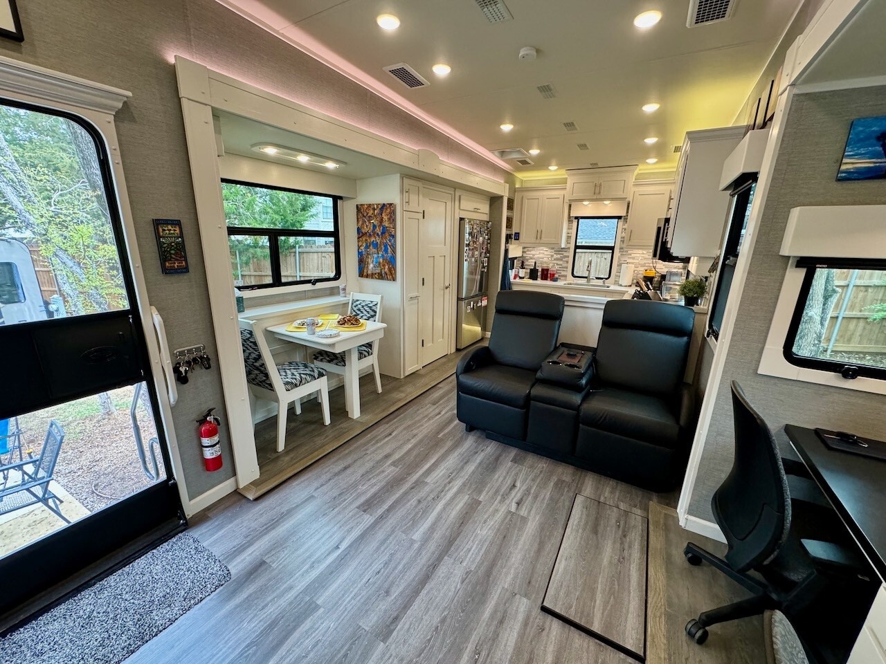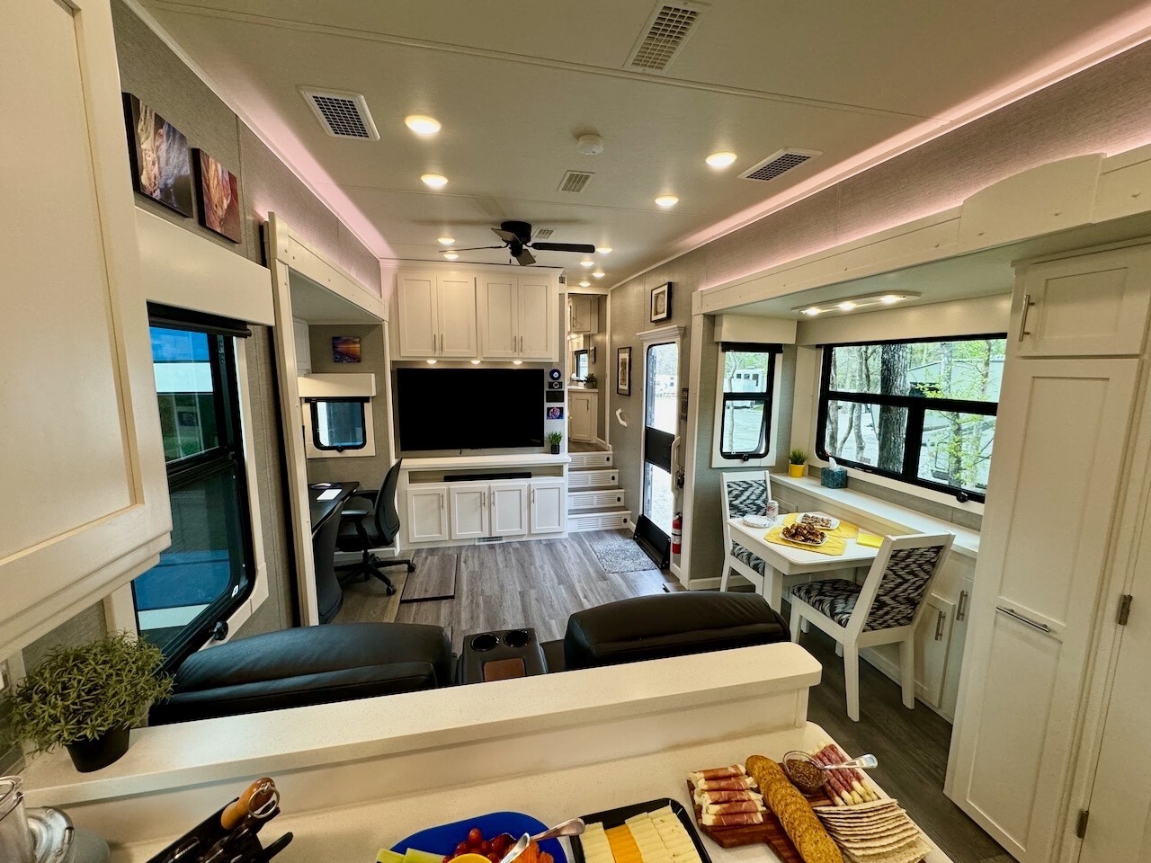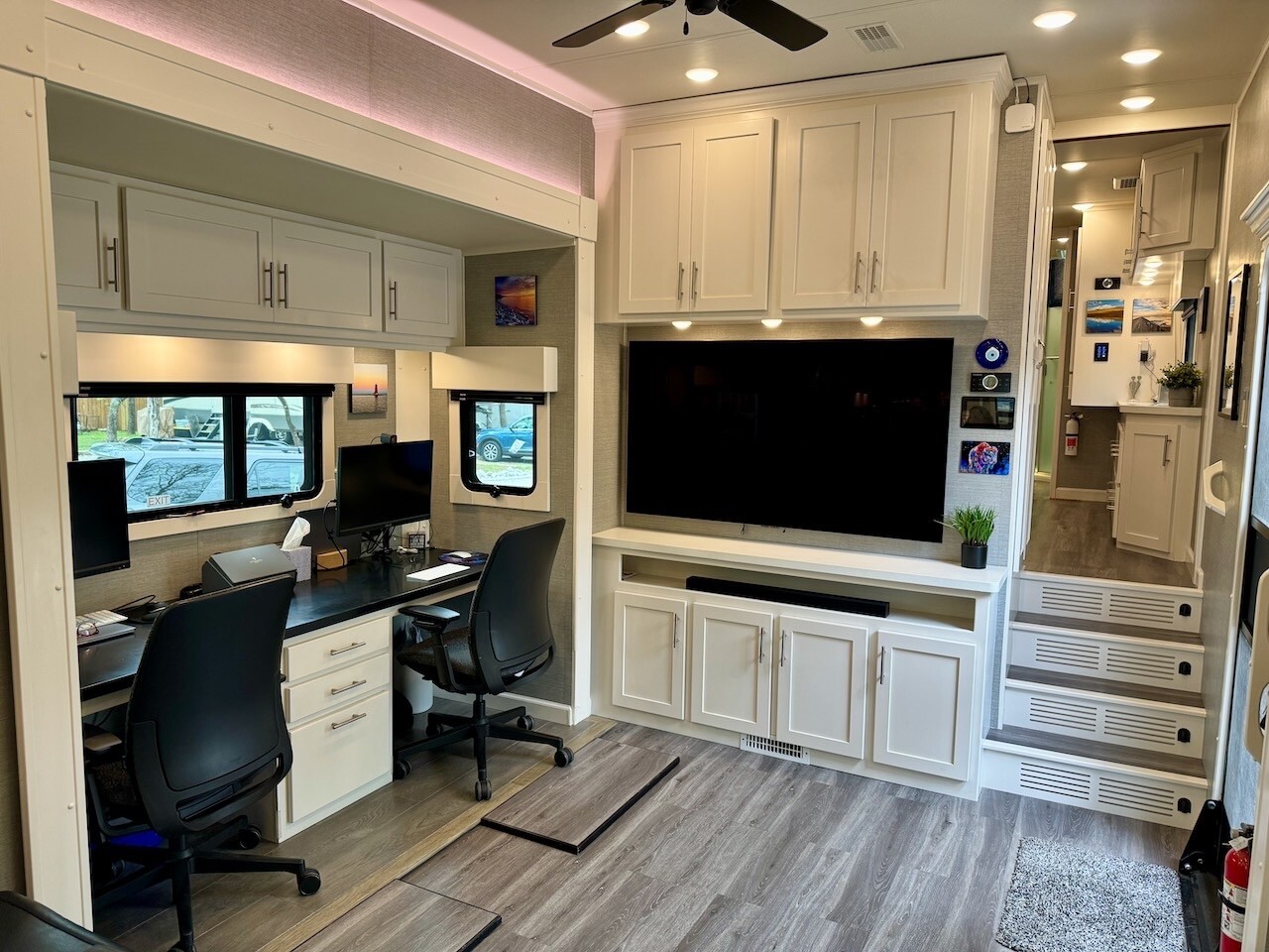 With the help of New Horizons, we meticulously designed this Majestic to maximize storage, convenience, and comfort, whether we were in a campground on full hookups or camping off-grid. It is a true four-season rig optimized for full-time living and frequent traveling. The light and bright interior feels welcoming and even more spacious than its 400 square feet of space would suggest. Some of the special touches include a chef’s kitchen with plenty of counter space and storage and upgraded appliances, including a dishwasher; a residential king size bed with two nightstands; a front bathroom with dual sinks, a spacious corner shower, and a washer and vented dryer; and a two-person desk with extra AC and USB outlets and hidden storage for a laser printer. (While the desk makes this rig ideal for working on the road, it could be removed if desired to make room for a sofa.)