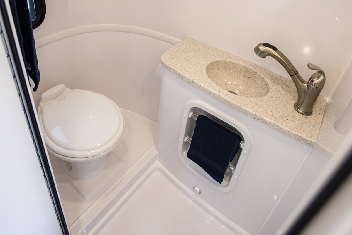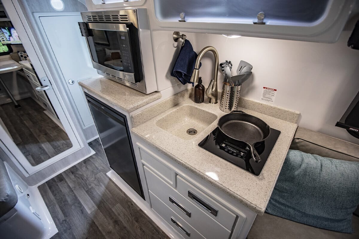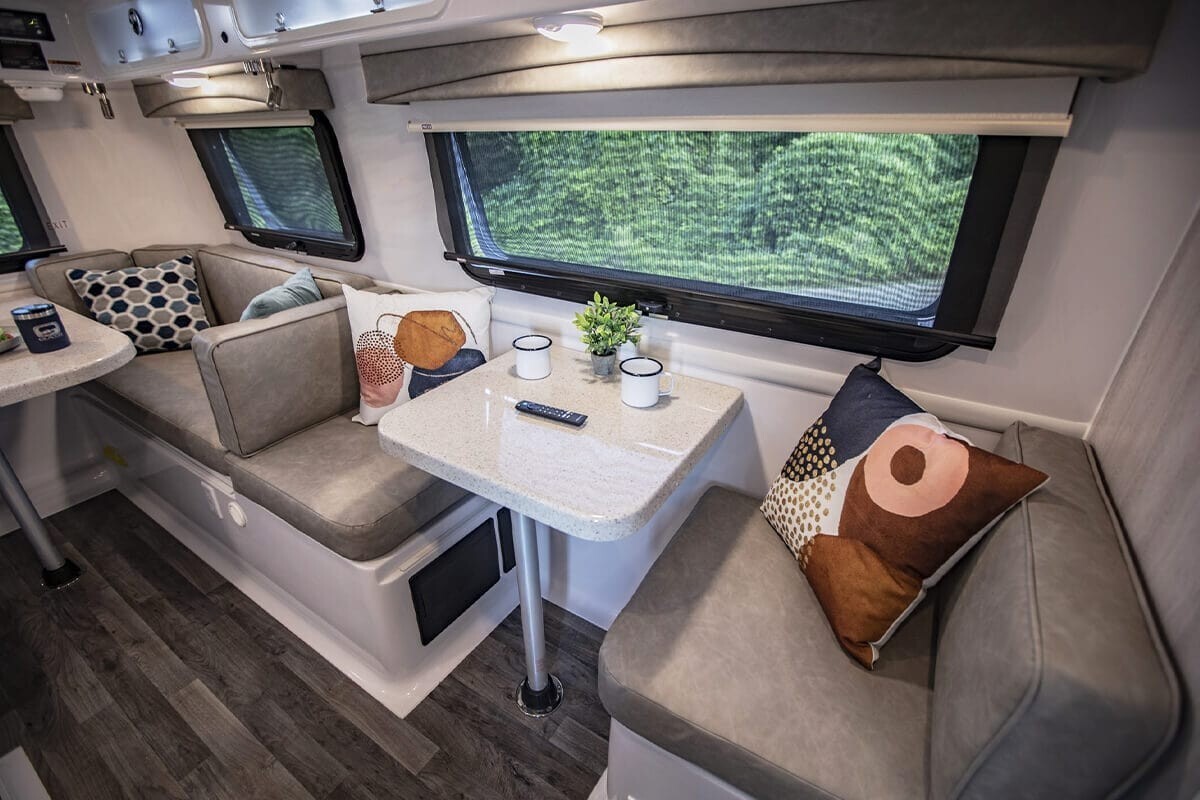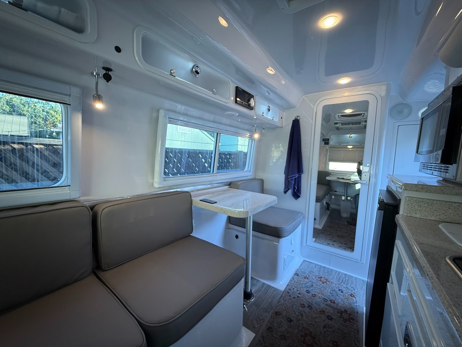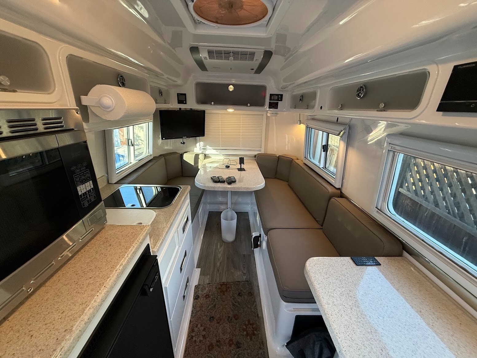 Inside,you’llfind a thoughtfully designed layout featuring a rear dinette that converts into a bed, a fully equipped kitchen with solid-surface countertops, a two-burner stove, microwave, and refrigerator. The wet bath includes a molded fiberglass shower and marine-grade components for easy cleaning and durability.Additionalfeatures includea curb-side power awning, premium windows for natural light, and modern climate control systems.As a life-long boat owner, I findthe Oliverto beultra-efficient,durable,clean, and easy tomaintaininlayout and surfaces.It’sa premium land yachtyou’llfall in love with.