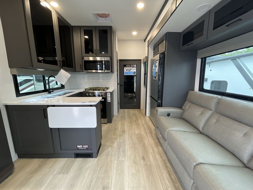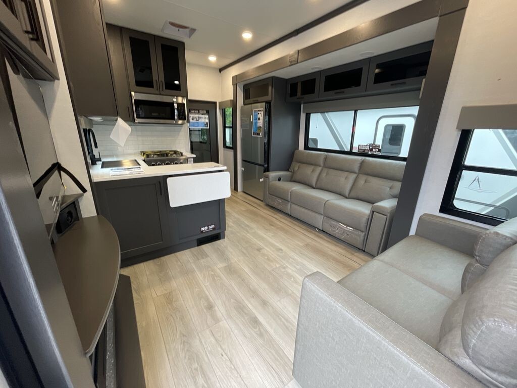 The interior features a thoughtfully designed floor plan that comfortably accommodates up to nine people. The living area includes plush seating arrangements, such as a high-quality sofa and reclining chairs, perfect for relaxation after a day of exploration. The kitchen is equipped with high-end appliances, including a large refrigerator, a convection microwave oven, and a well-designed pantry. Durable countertops ensure longevity and style.
