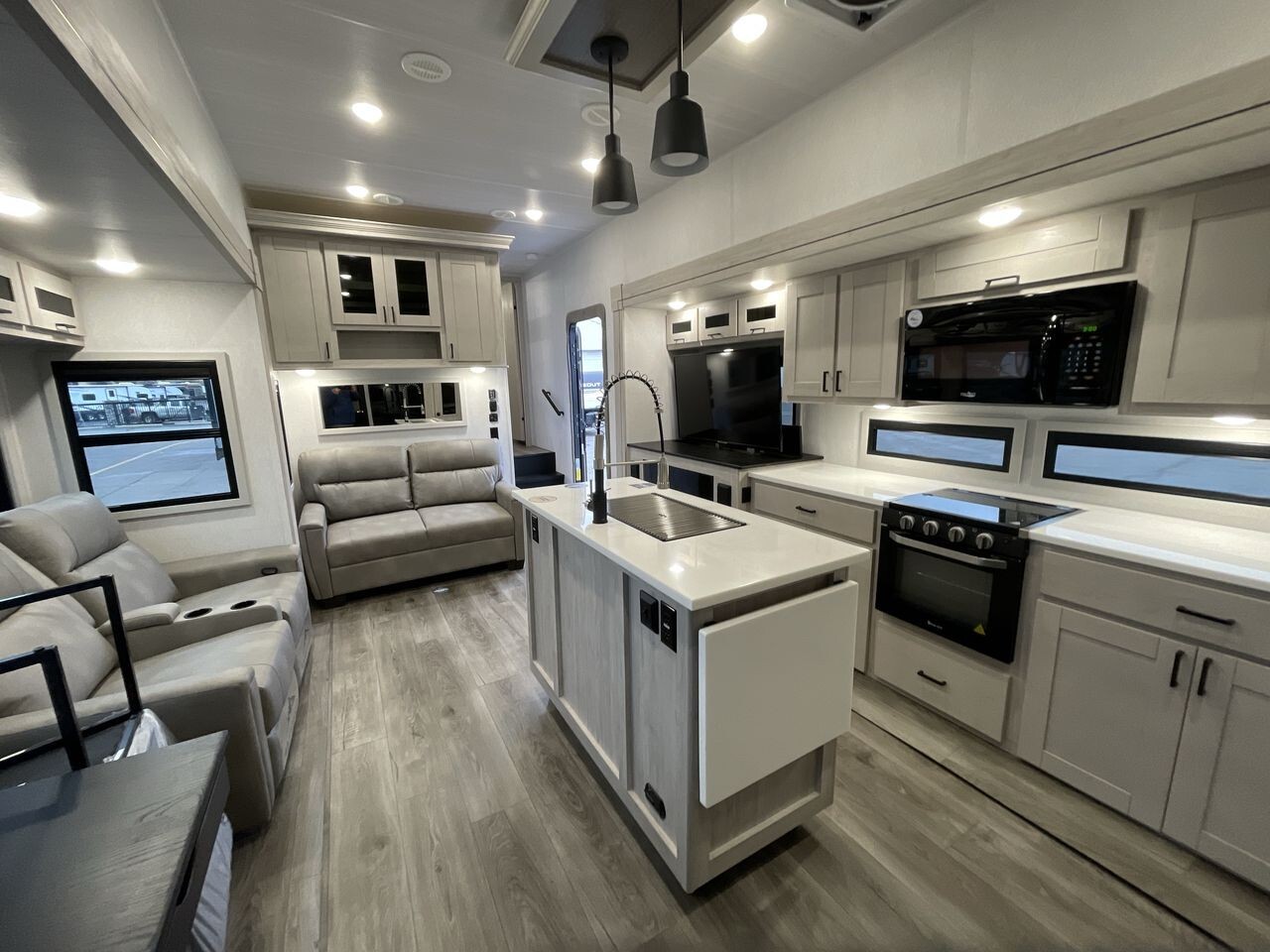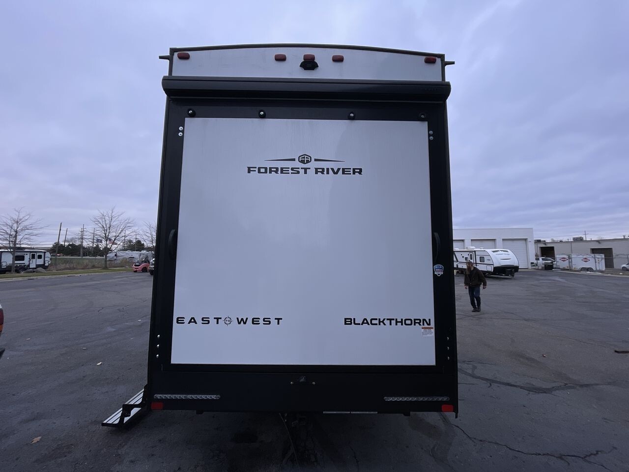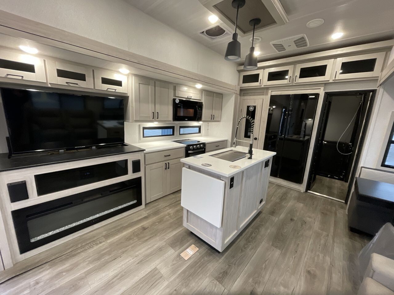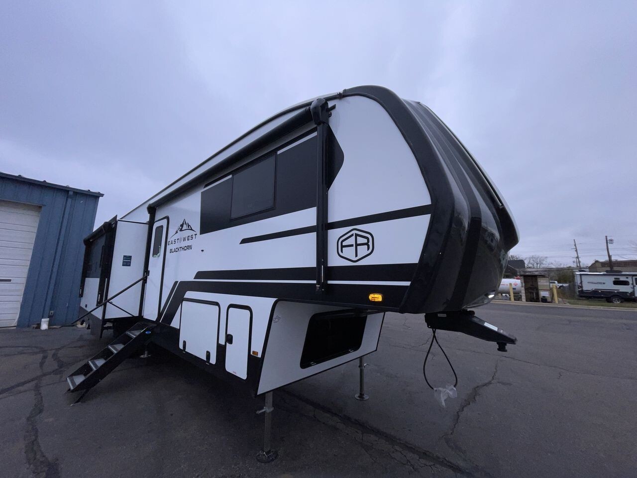 The 2025 East To West Blackthorn 3400R-OK is a luxurious fifth wheel RV designed to elevate your travel experiences. This model seamlessly blends modern design with high-end amenities, making it an ideal choice for both families and couples seeking adventure without sacrificing comfort.One of the standout features of the 3400R-OK is its outdoor kitchen, as indicated by the "OK" in its model name. This fully equipped space includes a mini-refrigerator, cooktop, and ample storage, allowing you to enjoy cooking and dining al fresco. Inside, the chef's kitchen boasts a residential-style refrigerator, a three-burner cooktop, oven, microwave, and a spacious kitchen island, providing plenty of room for meal preparation and entertaining.The living area is designed for relaxation and socializing, featuring theater seating, a tri-fold sofa, and a large entertainment center with a fireplace. Large panoramic windows flood the space