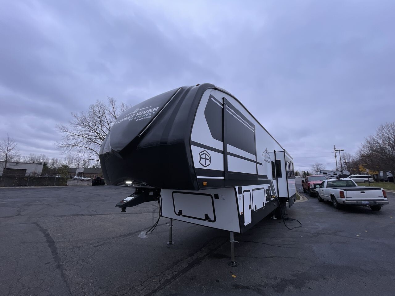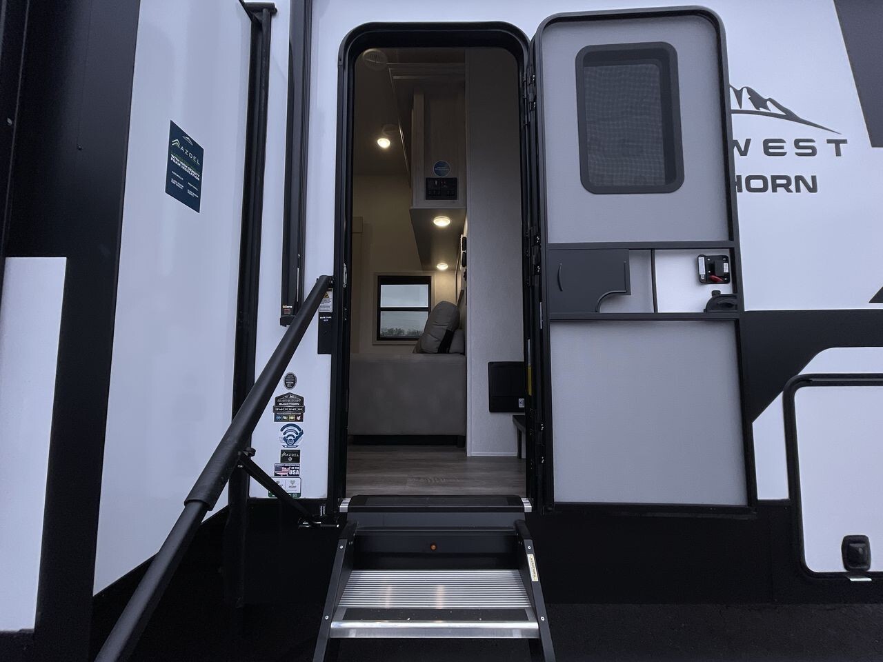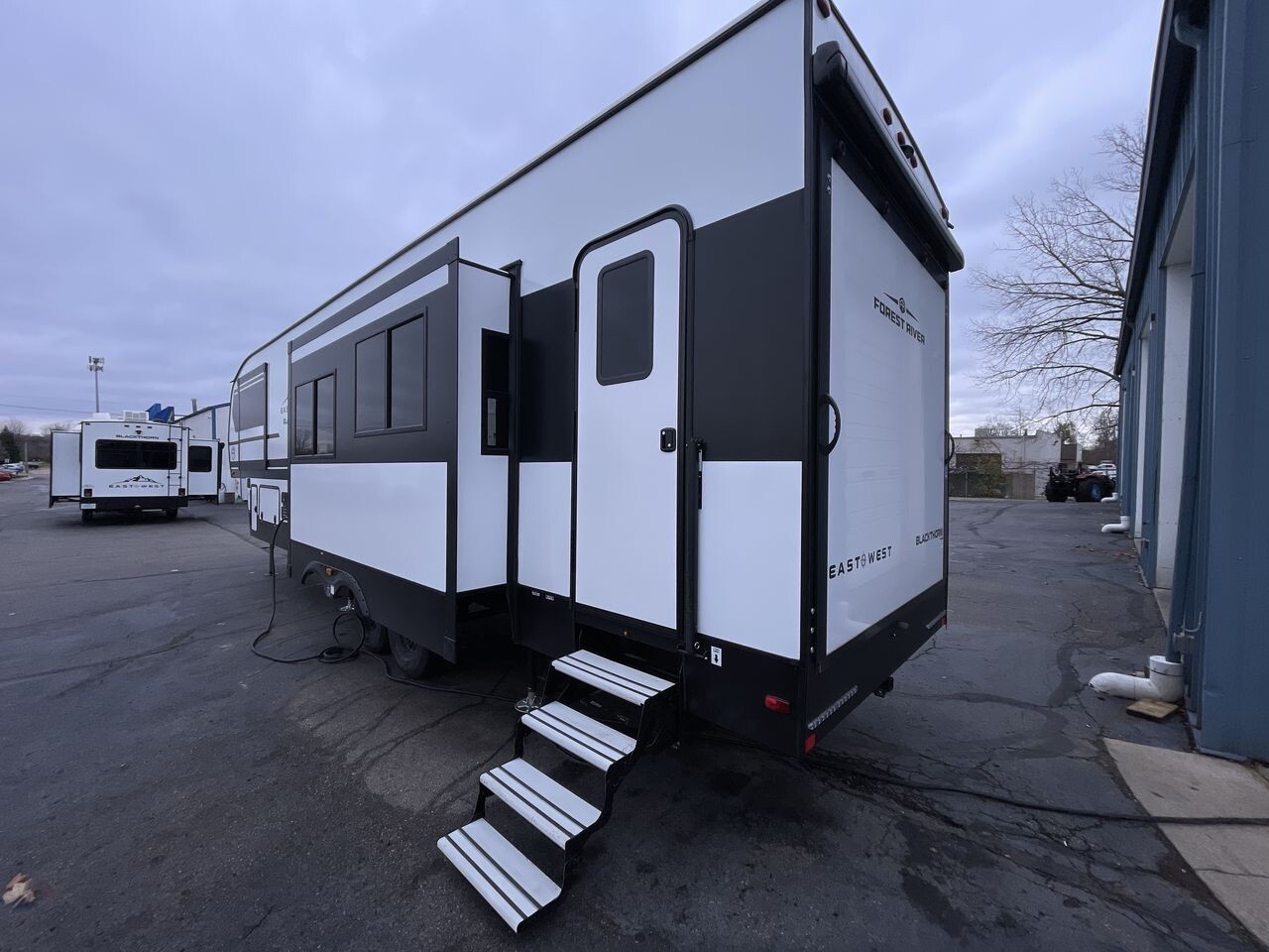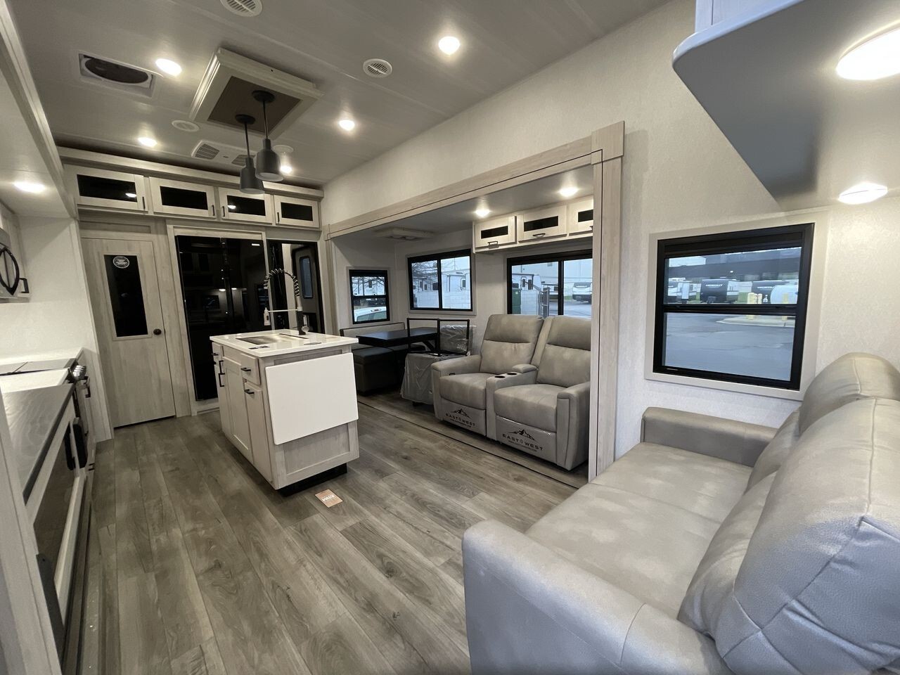 The 2025 East To West Blackthorn 3400R-OK is a luxurious fifth wheel RV designed to elevate your travel experiences. This model seamlessly blends modern design with high-end amenities, making it an ideal choice for both families and couples seeking adventure without sacrificing comfort.One of the standout features of the 3400R-OK is its outdoor kitchen, as indicated by the "OK" in its model name. This fully equipped space includes a mini-refrigerator, cooktop, and ample storage, allowing you to enjoy cooking and dining al fresco. Inside, the chef's kitchen boasts a residential-style refrigerator, a three-burner cooktop, oven, microwave, and a spacious kitchen island, providing plenty of room for meal preparation and entertaining.The living area is designed for relaxation and socializing, featuring theater seating, a tri-fold sofa, and a large entertainment center with a fireplace. Large panoramic windows flood the space