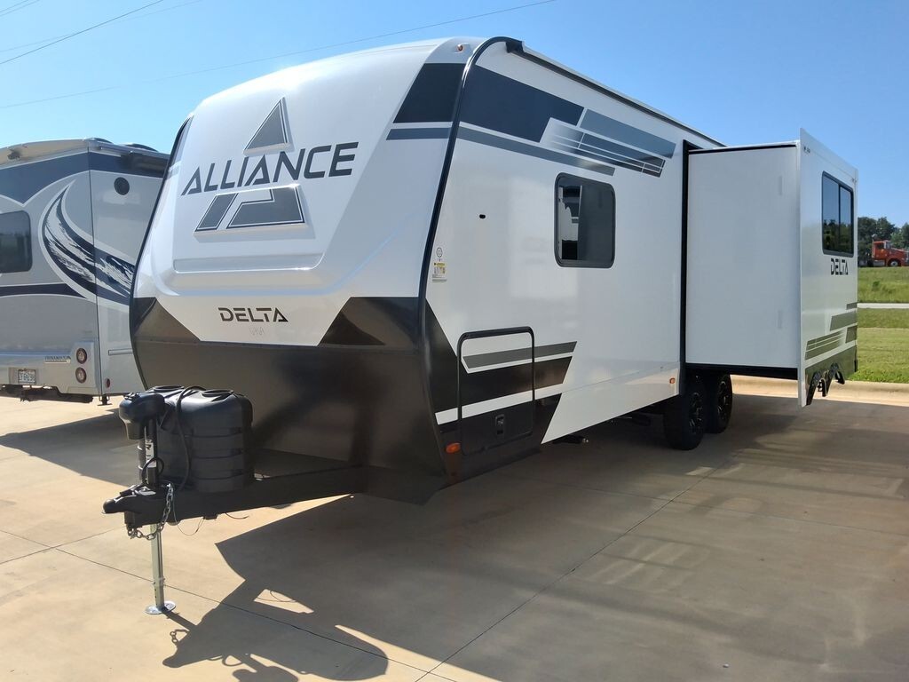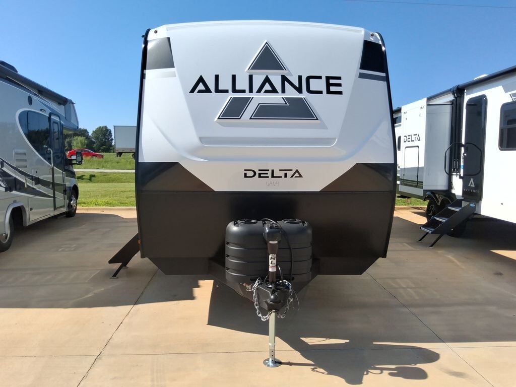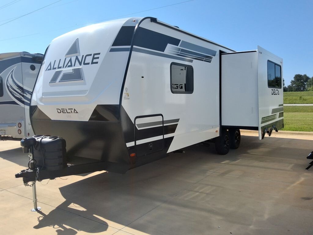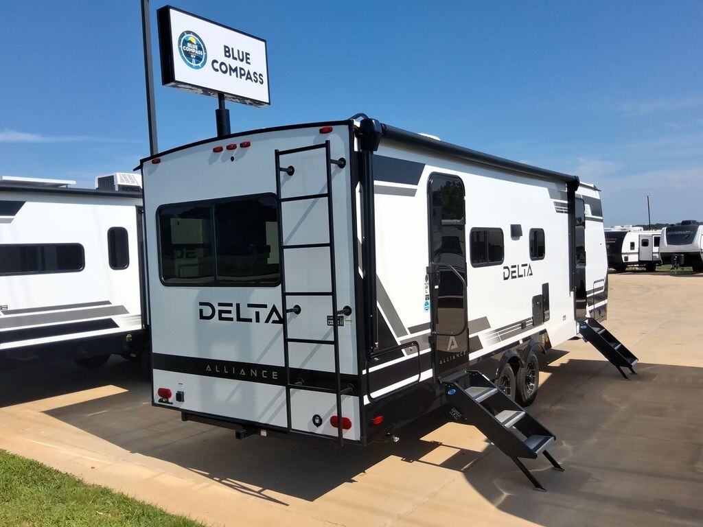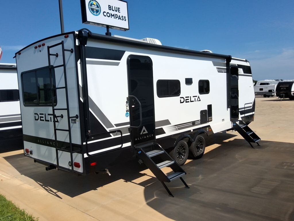 The Alliance RV Delta 252RL is a travel trailer designed to offer comfort and convenience for your camping adventures. Measuring 29 feet 11 inches in length and 11 feet 2 inches in height, it provides ample space while remaining easy to tow. With a dry weight of 6,545 lbs and a GVWR of 8,250 lbs, it ensures a stable and manageable towing experience.Inside, the 252RL features a rear living area equipped with a comfortable sofa and a booth dinette, both of which can convert into sleeping spaces. Large panoramic windows fill the space with natural light, creating an inviting atmosphere. A 40-inch Smart TV on a swing arm and a fireplace enhance the living area, providing entertainment and warmth during your travels.The kitchen is well-appointed with modern appliances, including a 10 cubic foot 12V refrigerator, a three-burner stove, and a microwave. Solid surface countertops and ample cabinetry offer plenty of space for meal preparation and