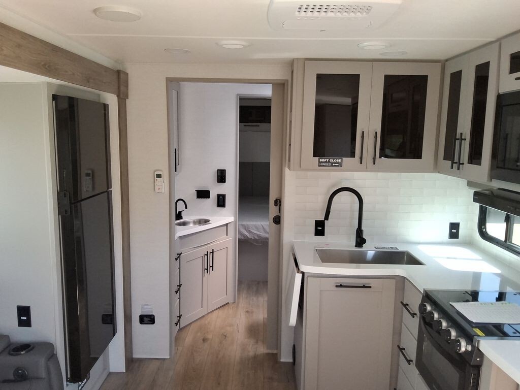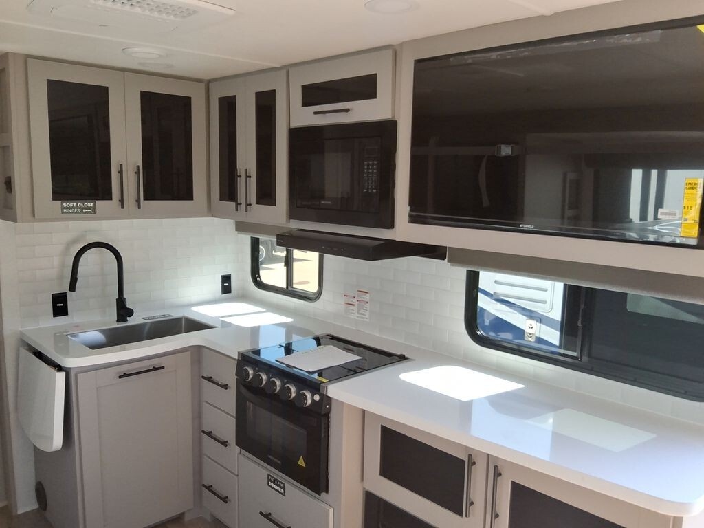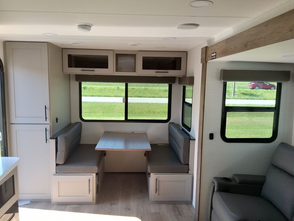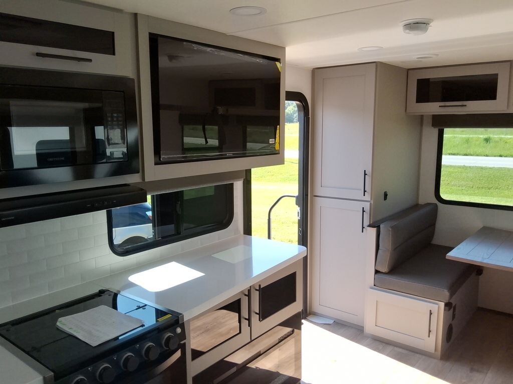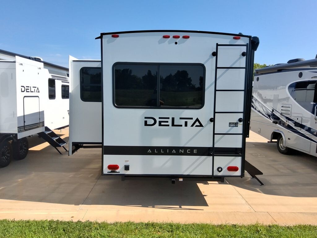 The Alliance RV Delta 252RL is a travel trailer designed to offer comfort and convenience for your camping adventures. Measuring 29 feet 11 inches in length and 11 feet 2 inches in height, it provides ample space while remaining easy to tow. With a dry weight of 6,545 lbs and a GVWR of 8,250 lbs, it ensures a stable and manageable towing experience.Inside, the 252RL features a rear living area equipped with a comfortable sofa and a booth dinette, both of which can convert into sleeping spaces. Large panoramic windows fill the space with natural light, creating an inviting atmosphere. A 40-inch Smart TV on a swing arm and a fireplace enhance the living area, providing entertainment and warmth during your travels.The kitchen is well-appointed with modern appliances, including a 10 cubic foot 12V refrigerator, a three-burner stove, and a microwave. Solid surface countertops and ample cabinetry offer plenty of space for meal preparation and