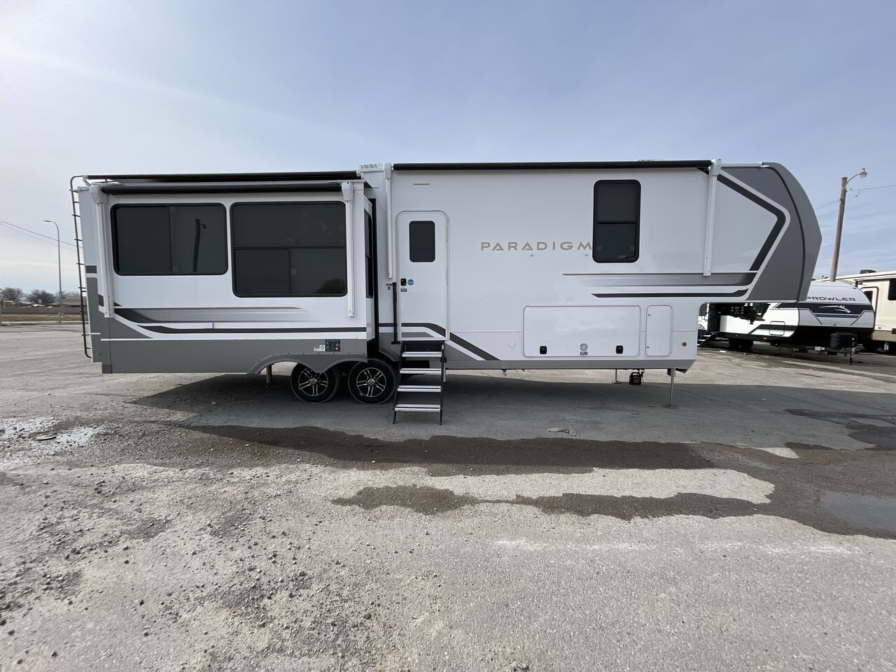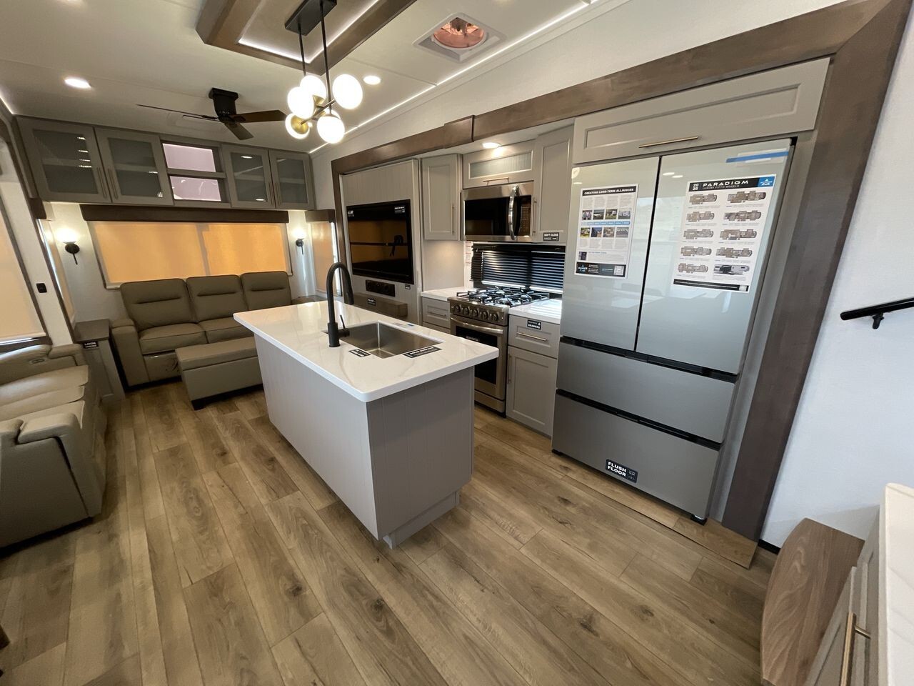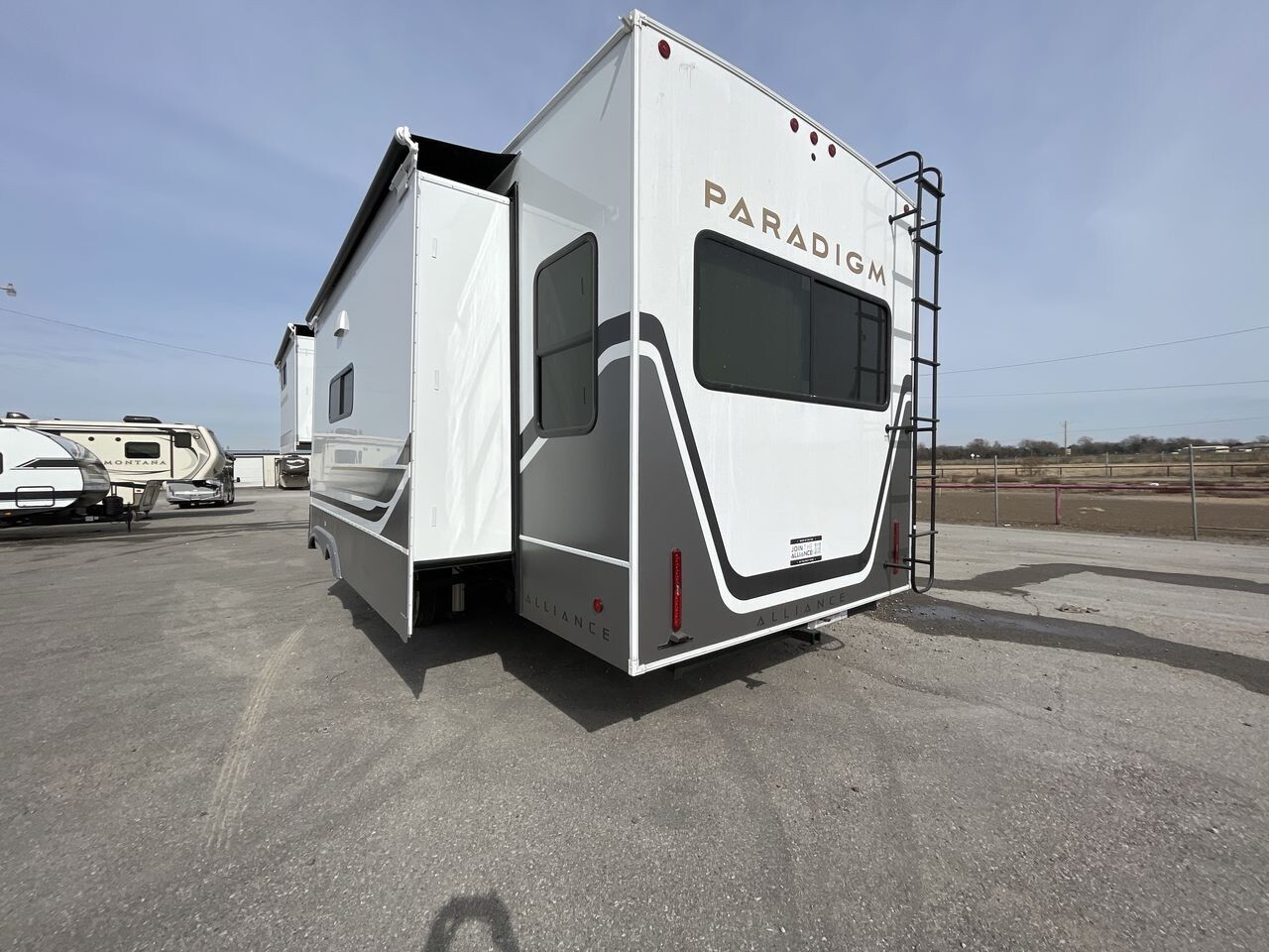 The 2025 Alliance RV Paradigm 340RL is a top choice for travelers seeking comfort and innovation. This fifth-wheel RV offers a spacious interior, providing ample living space for families or groups. Upon entry, you'll find a welcoming living area with plush seating and large panoramic windows that allow plenty of natural light and scenic views. The thoughtfully designed layout maximizes space and comfort, making it a cozy home away from home.