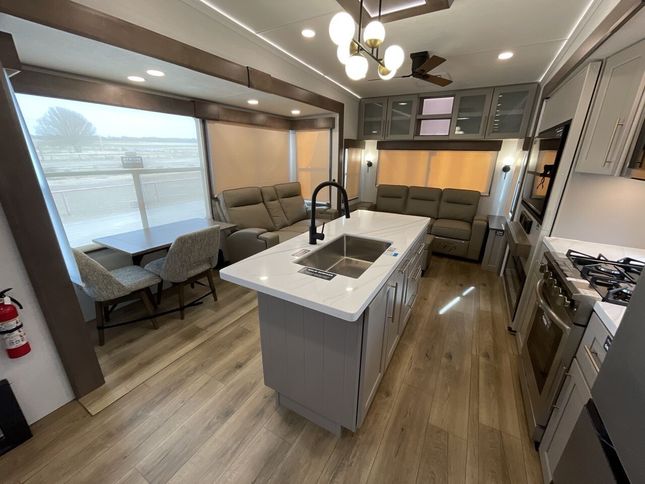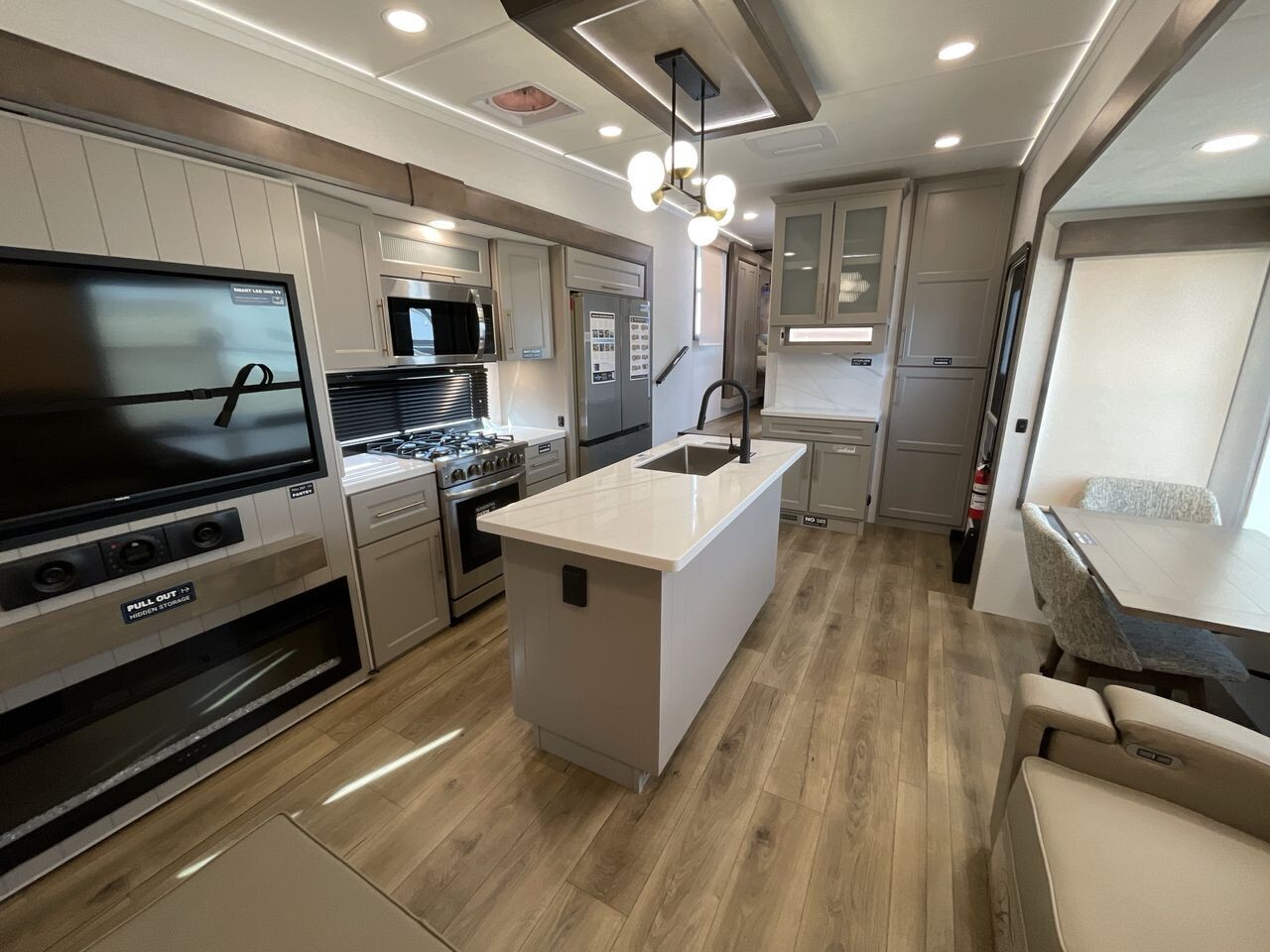 A highlight of the 2025 model is its modern kitchen, equipped with state-of-the-art appliances. The fully equipped kitchen includes a residential-size refrigerator, a four-burner stove, an oven, and a microwave. The solid surface countertops and deep stainless-steel sink make meal preparation and clean-up easy, ensuring you have everything you need to cook up a feast on the go.