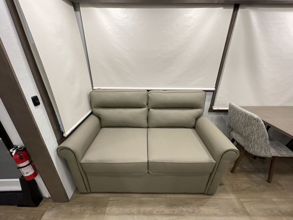 Upon entering the 382RK, you'll appreciate its spacious and open layout, achieved through the use of four slide-outs. The rear kitchen is a highlight, providing ample counter space and storage, along with high-end appliances that make meal preparation convenient. Equipped with a residential refrigerator, a four-burner stove, and a convection microwave, you can enjoy home-cooked meals while on the road.