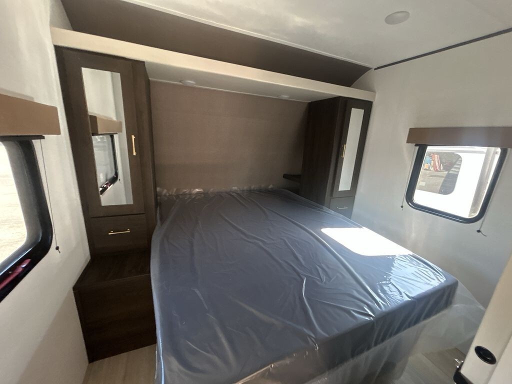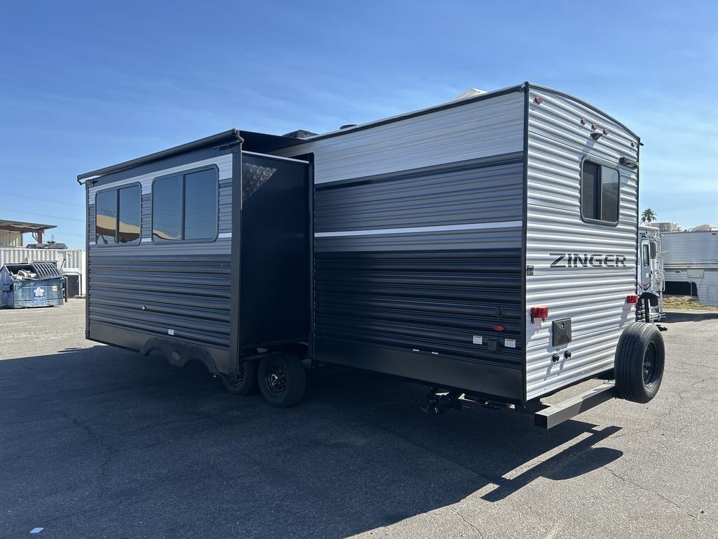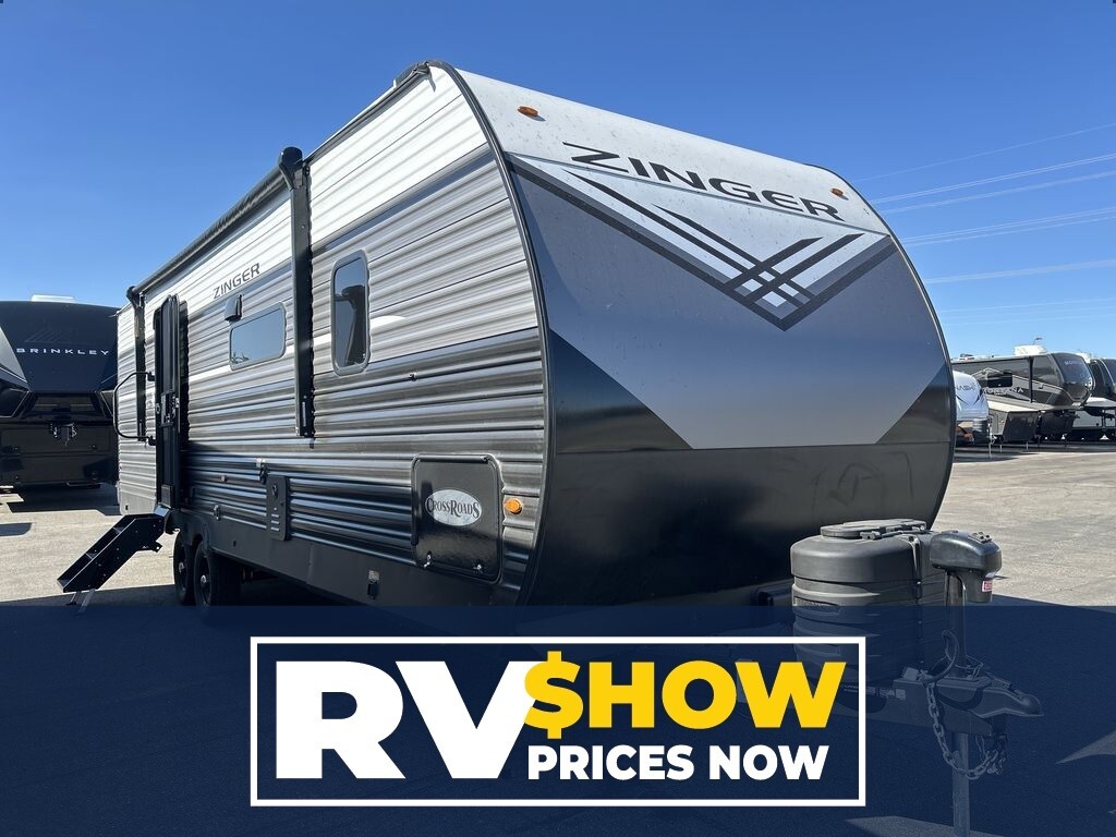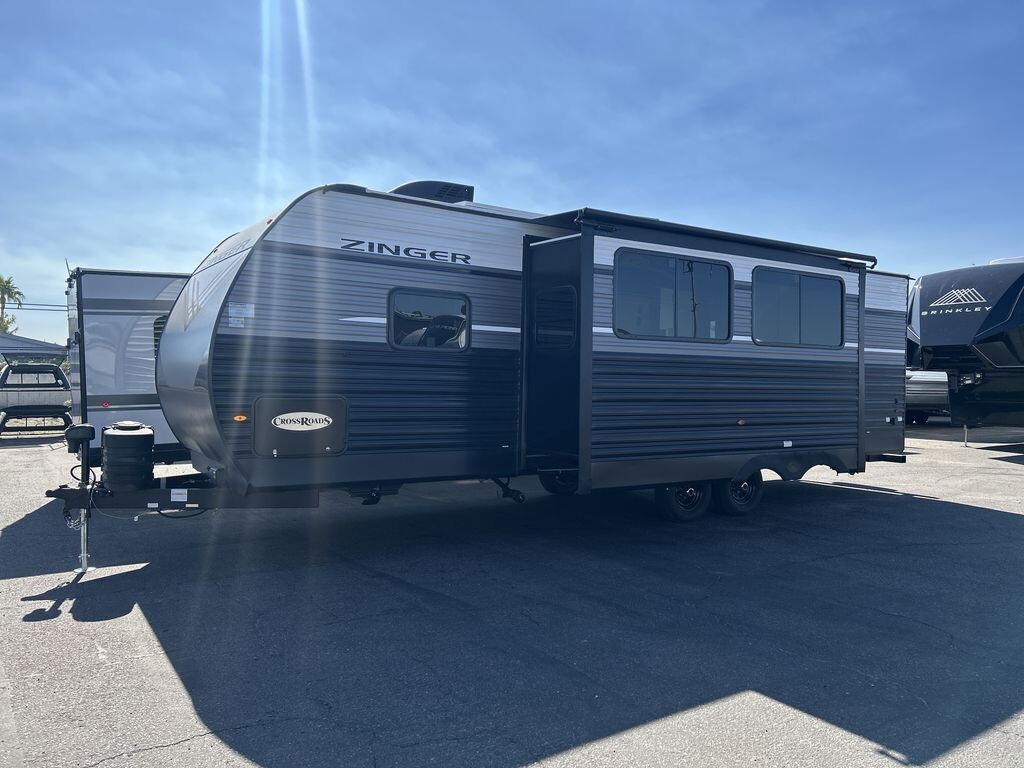The Crossroads Zinger 280RB is a travel trailer designed to provide comfort and convenience for your adventures. Measuring 32.5 feet in length and 8 feet in width, it offers ample space for relaxation and entertainment.Inside, the 280RB features a front private bedroom with a 60" x 74" RV queen bed, complete with shirt closets on either side for your clothing storage needs. The living area includes a 60" jackknife sofa and a 42" x 80" U-shaped dinette, both of which can convert into additional sleeping spaces, accommodating up to six people comfortably.The kitchen is well-equipped with modern appliances, including a three-burner stove, oven, microwave, and a 10-cubic-foot refrigerator, providing all the essentials for meal preparation. The full rear bathroom boasts a dual-sink vanity, a 30" x 36" shower, and ample storage space, ensuring convenience and privacy.Additional features include a fireplace in the living area, enhancing