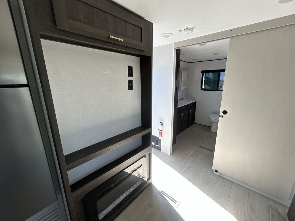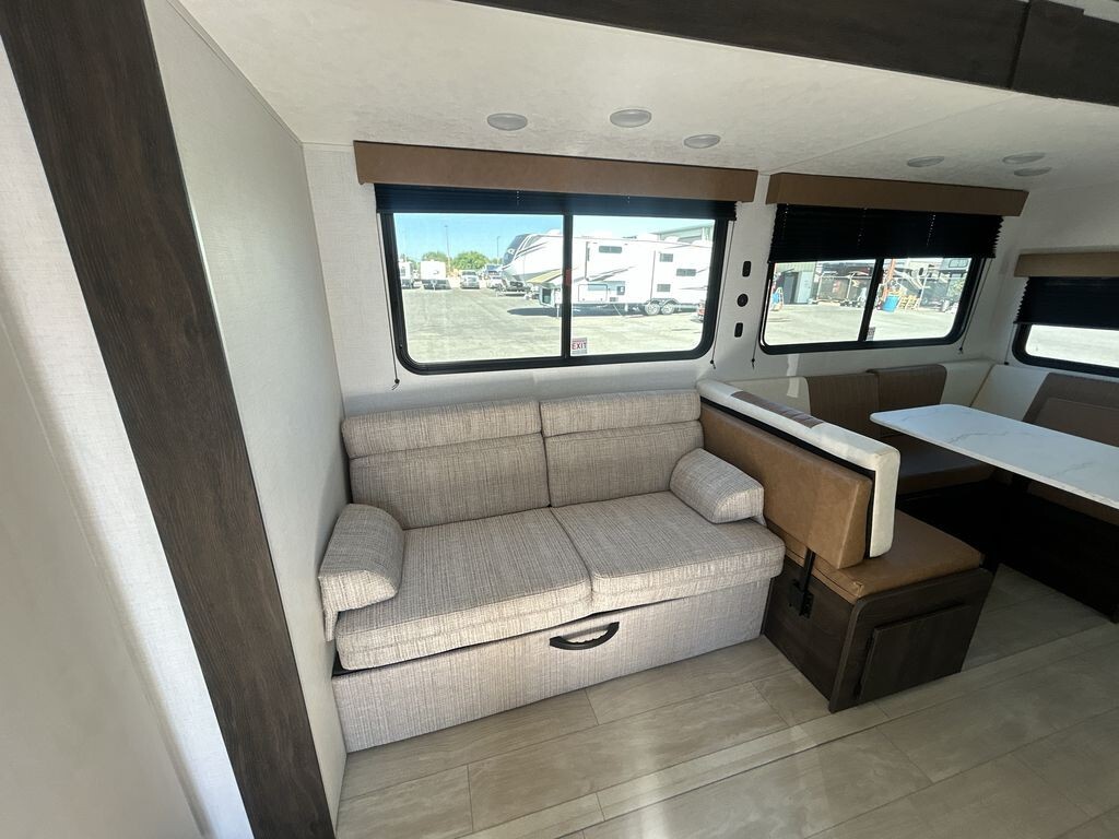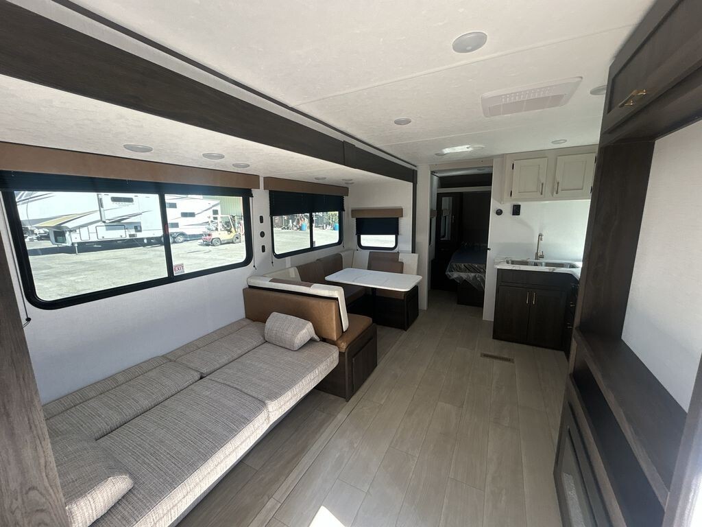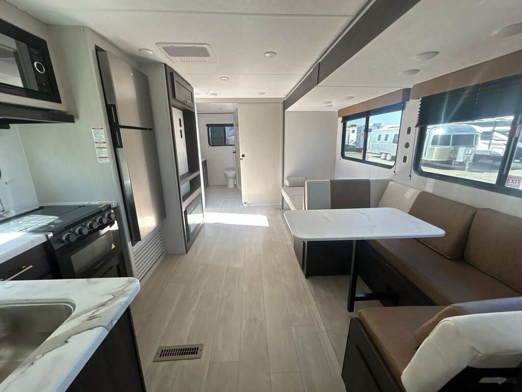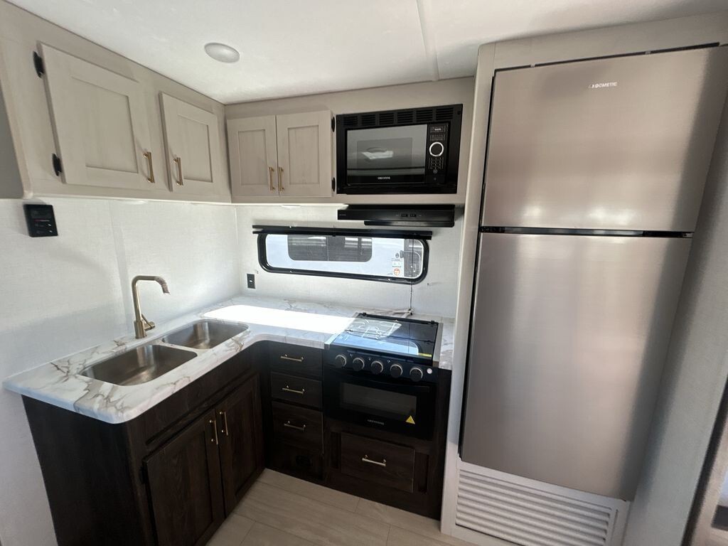 The Crossroads Zinger 280RB is a travel trailer designed to provide comfort and convenience for your adventures. Measuring 32.5 feet in length and 8 feet in width, it offers ample space for relaxation and entertainment.Inside, the 280RB features a front private bedroom with a 60" x 74" RV queen bed, complete with shirt closets on either side for your clothing storage needs. The living area includes a 60" jackknife sofa and a 42" x 80" U-shaped dinette, both of which can convert into additional sleeping spaces, accommodating up to six people comfortably.The kitchen is well-equipped with modern appliances, including a three-burner stove, oven, microwave, and a 10-cubic-foot refrigerator, providing all the essentials for meal preparation. The full rear bathroom boasts a dual-sink vanity, a 30" x 36" shower, and ample storage space, ensuring convenience and privacy.Additional features include a fireplace in the living area, enhancing