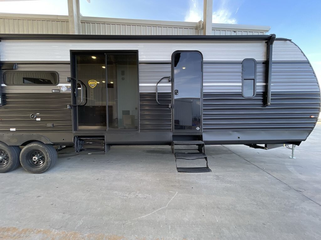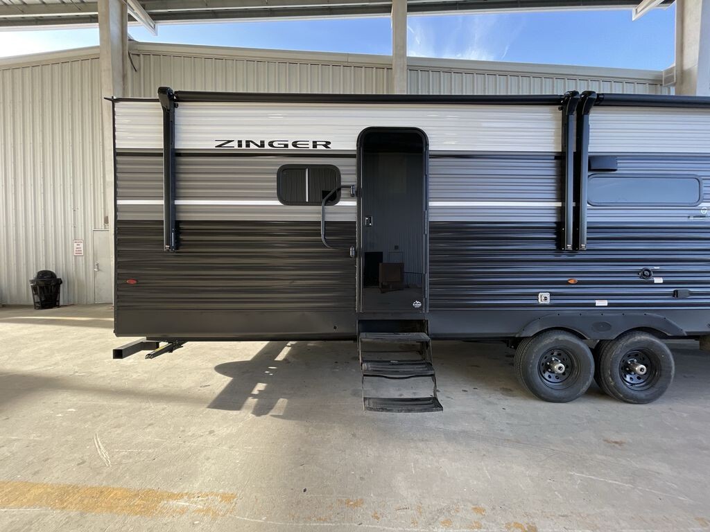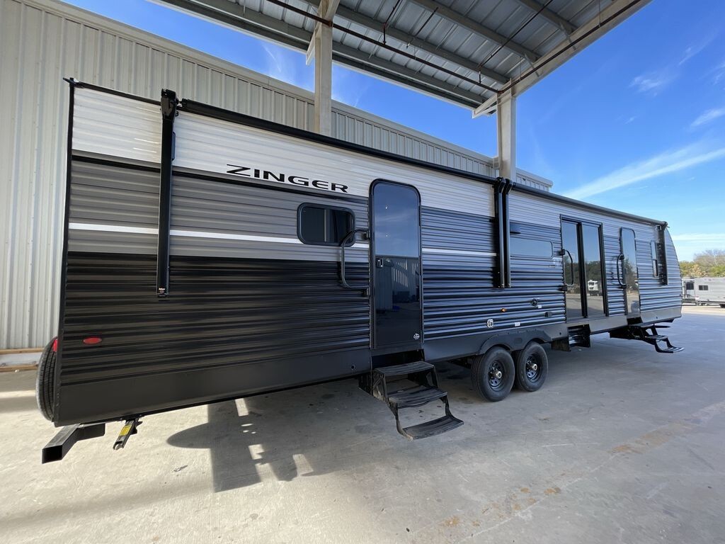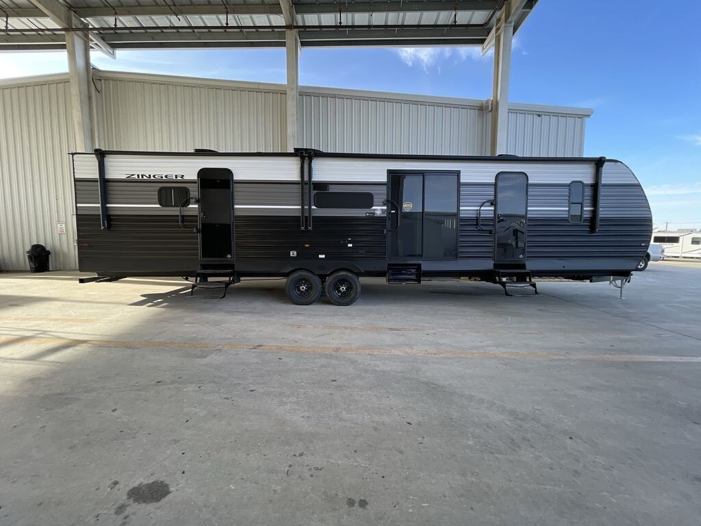 Introducing the Crossroads Zinger 390DB, a top-tier travel trailer crafted to enhance your camping adventures with exceptional comfort and convenience. This model offers a spacious layout, making it an excellent choice for families and groups seeking a home-like atmosphere on the road.The Zinger 390DB features two private bedrooms, each thoughtfully designed to provide restful retreats. The master suite includes a queen-size bed, ample wardrobe space, and direct access to a full bathroom equipped with a 30" x 36" shower. The front bedroom offers a king-size bed, a dresser, a front wardrobe, and washer and dryer prep, along with its own entrance to the second full bathroom, which includes a 34" radius shower.The living area is designed for relaxation and entertainment, featuring a comfortable 60" jackknife sofa and a 38" booth dinette, both perfect for gathering with family and friends. The entertainment center comes equipped with