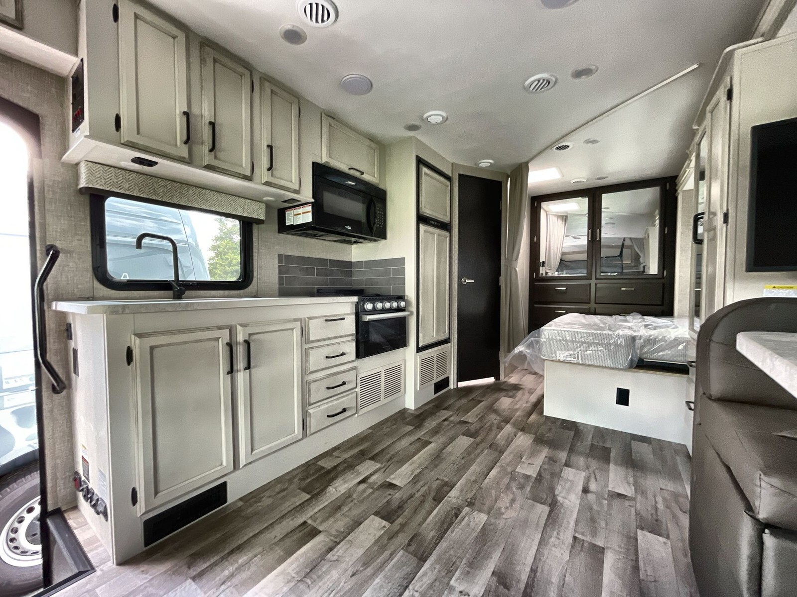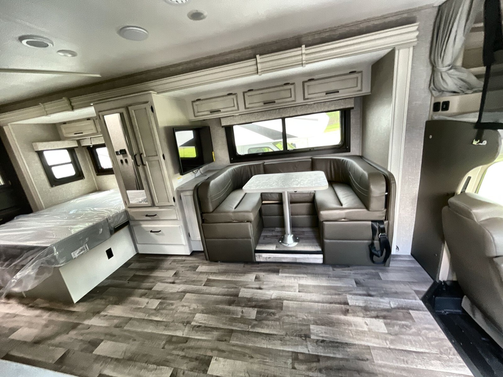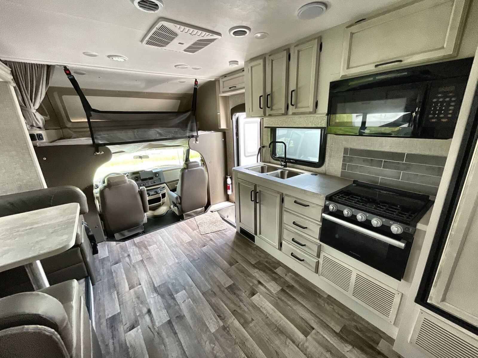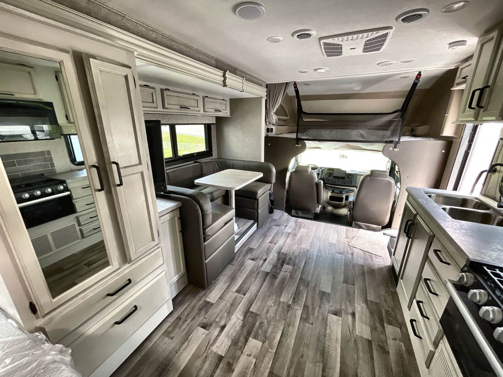 The 2024 Entegra Coach Odyssey 24B is a Class C motorhome designed to provide comfort and convenience for travelers. Built on the dependable Ford E-450 chassis, it features a 7.3-liter V8 engine that delivers 325 horsepower and 450 ft-lbs of torque, ensuring a smooth and powerful drive.Measuring approximately 26.67 feet in length, the 24B offers a spacious interior while remaining easy to maneuver on highways and in campgrounds. A single slide-out expands the living area, creating ample space for relaxation and entertainment. The interior includes a U-shaped dinette, ideal for family meals and gatherings. The rear master bedroom features a comfortable queen-size bed, providing restful nights on the road.The kitchen is equipped with a three-burner cooktop, convection microwave oven, and a full-size electric refrigerator, allowing for easy meal preparation and storage. The residential-style bathroom includes a porcelain
