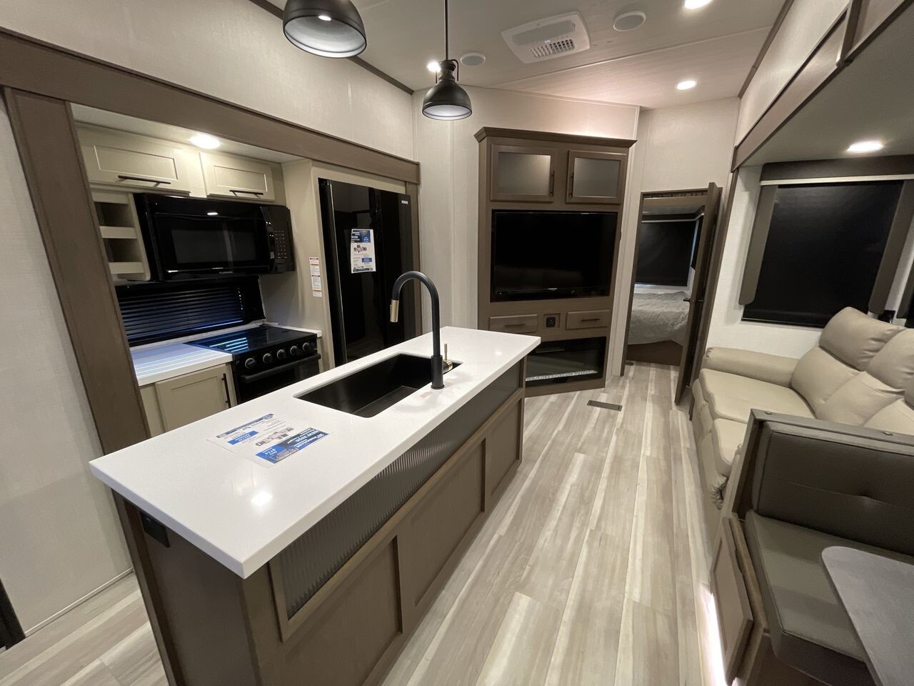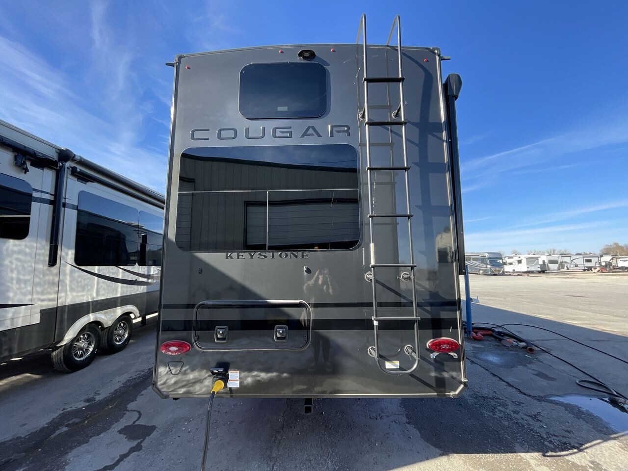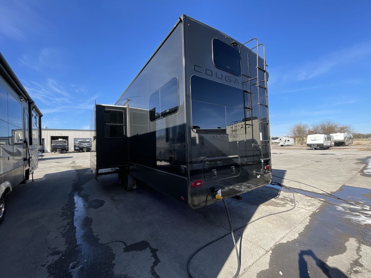 The Keystone Cougar 364BHL is a versatile and family-friendly fifth wheel that's perfect for those who love adventure without giving up comfort. This Cougar model is known for its thoughtful design, spacious interior, and practical features, making it a favorite among RV enthusiasts.Starting with the exterior, the 2024 Cougar 364BHL boasts a modern look with its sleek lines and durable build. Keystone uses high-quality materials ensuring longevity and resilience against the elements. The Cougar comes equipped with an automatic leveling system, making setup quick and easy. The large awning provides ample shade, perfect for outdoor lounging or dining. Additionally, the outdoor kitchen is a great addition, allowing you to enjoy cooking outside with your family under the stars.Inside, the Cougar 364BHL is all about space and comfort. The open floor plan features a cozy living area with comfortable seating options, including