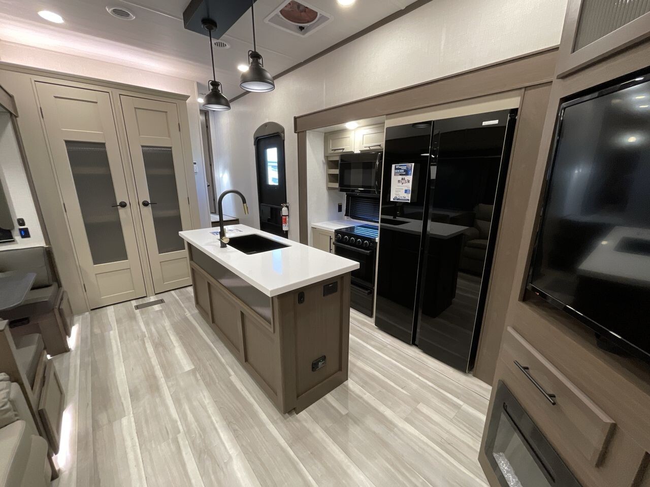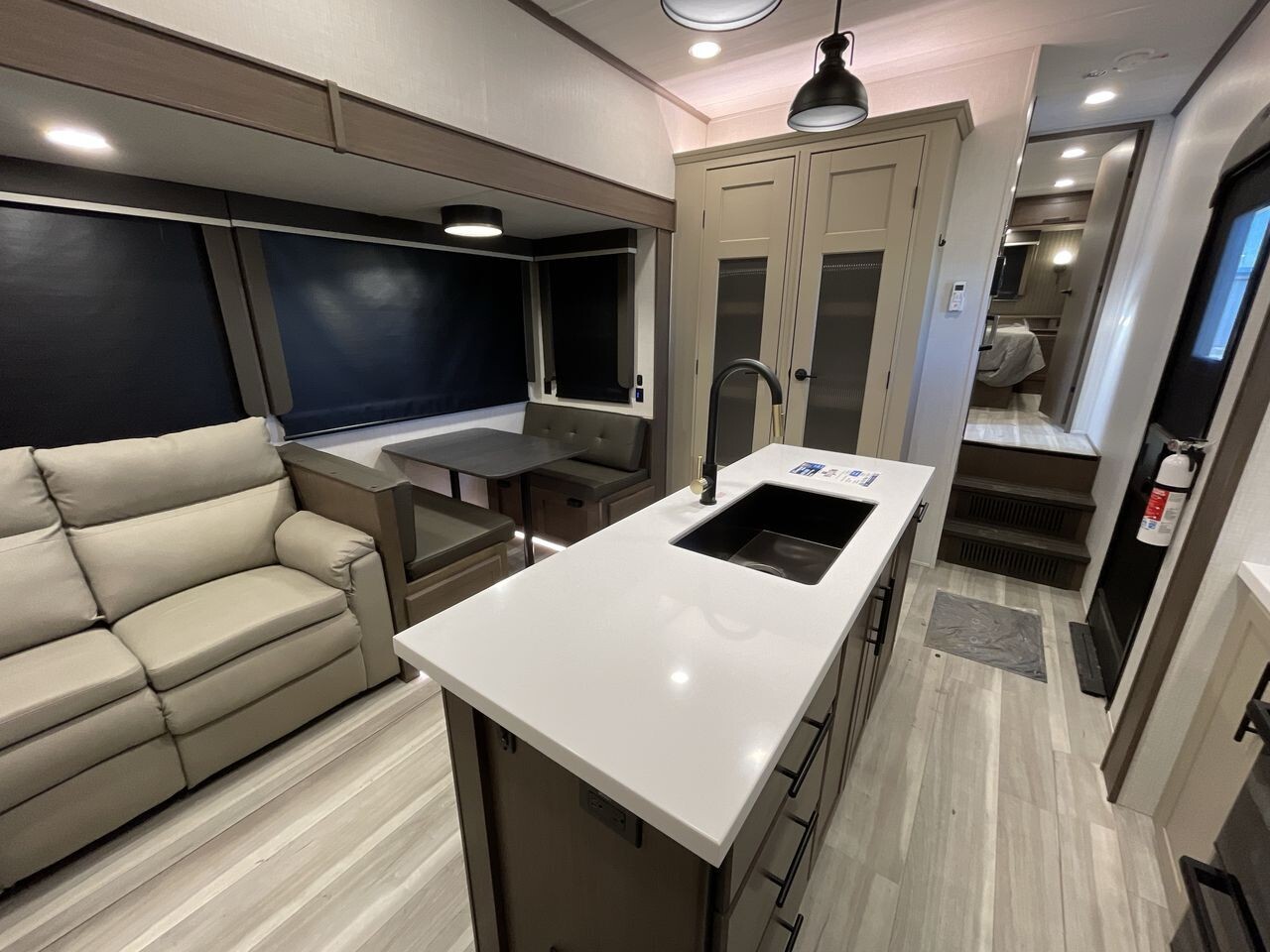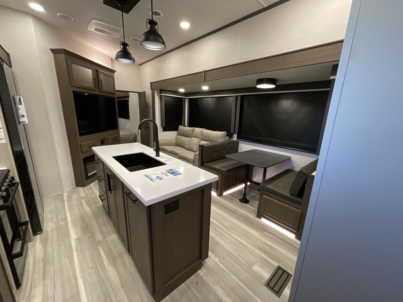 The Keystone Cougar 364BHL is a versatile and family-friendly fifth wheel that's perfect for those who love adventure without giving up comfort. This Cougar model is known for its thoughtful design, spacious interior, and practical features, making it a favorite among RV enthusiasts.Starting with the exterior, the 2024 Cougar 364BHL boasts a modern look with its sleek lines and durable build. Keystone uses high-quality materials ensuring longevity and resilience against the elements. The Cougar comes equipped with an automatic leveling system, making setup quick and easy. The large awning provides ample shade, perfect for outdoor lounging or dining. Additionally, the outdoor kitchen is a great addition, allowing you to enjoy cooking outside with your family under the stars.Inside, the Cougar 364BHL is all about space and comfort. The open floor plan features a cozy living area with comfortable seating options, including