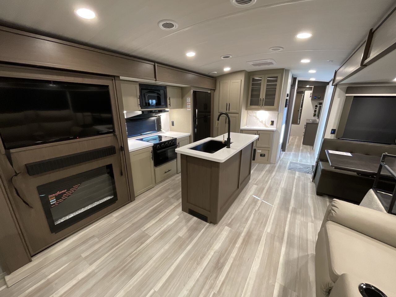 The Keystone Cougar Half-Ton TT 33RLI is a travel trailer that combines comfort and functionality for travelers and families. Its aerodynamic design enhances fuel efficiency and ease of towing, making it suitable for a variety of half-ton trucks. Constructed with durable materials, it is built to handle diverse road conditions and weather.Inside, the 33RLI offers a spacious layout with three slide-outs that expand the living area. The living room features comfortable seating and an entertainment system, providing a relaxing space after a day of travel. The dining area includes a booth dinette, offering ample space for meals and gatherings.The kitchen is equipped with modern appliances, including a full-size refrigerator, a three-burner stove, and a microwave, along with generous storage and counter space to facilitate meal preparation. The cabinetry is designed with quality materials, combining elegance with