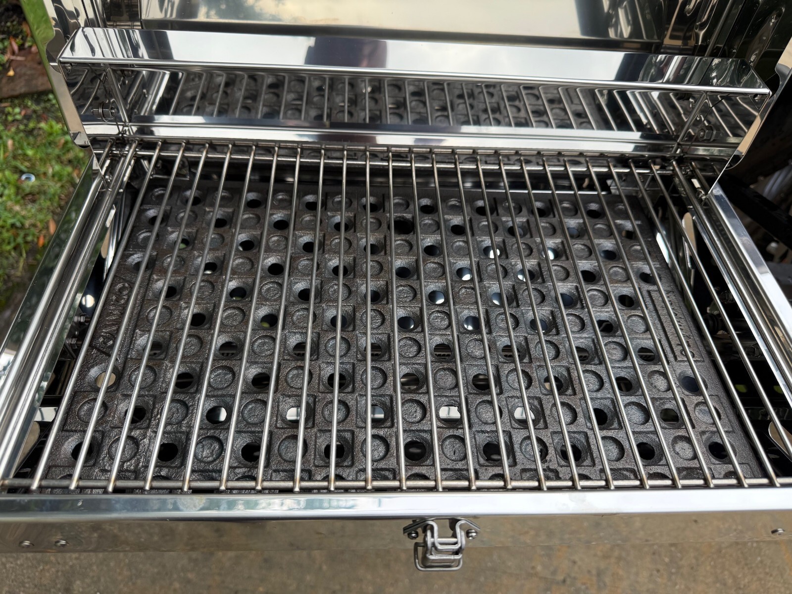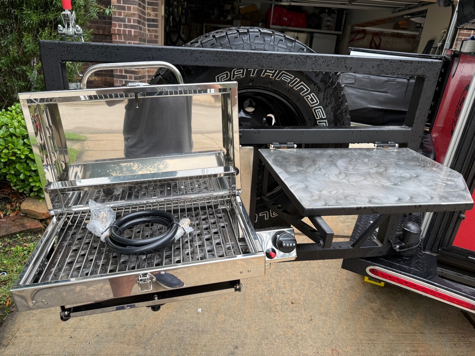 Features include a batwing awning, the largest tent on the market (bigger than a king-size bed), a full outdoor kitchen, a 20‑gallon water tank with hot and cold running water, a water heater, a shower, a fridge/freezer, a stove, a grill, an air conditioner, a propane heater, and solar-powered battery charging capability. Built on a rugged steel frame with off‑road suspension, electric brakes, and all‑terrain tires, it’s equally at home on mountain trails or base‑camp setups.