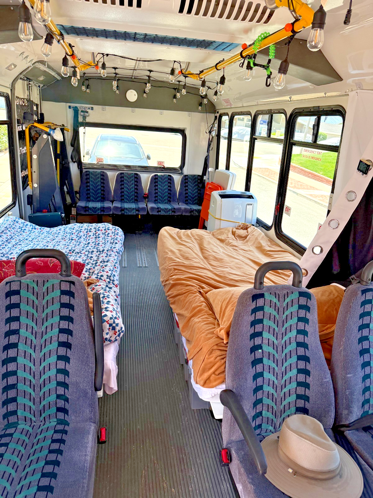 Most seats have been removed to make way for two single beds with 75 x 35 foam mattresses. 8 15 gallon storage containers can be stored under the beds.