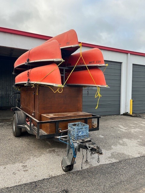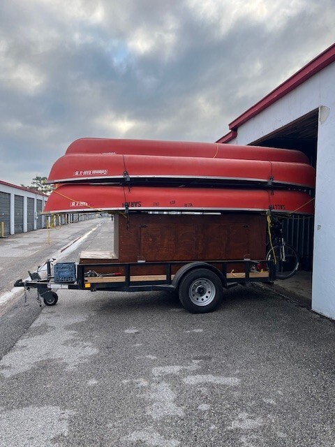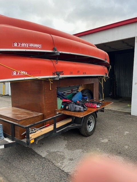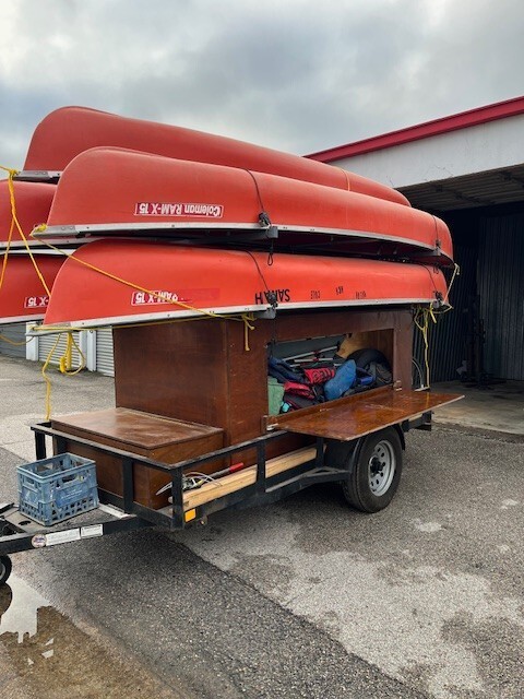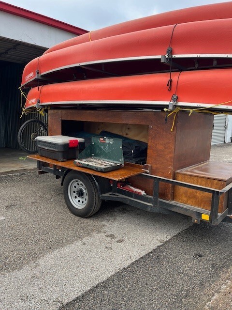 Trailer is about 5 yrs old in good shape. Always stored inside. Paddles and life jackets includedtrailer carries 4 canoes. 5th canoe is loose but included. Bike rack on backcanoes are Coleman RX 15 in reasonably good shape