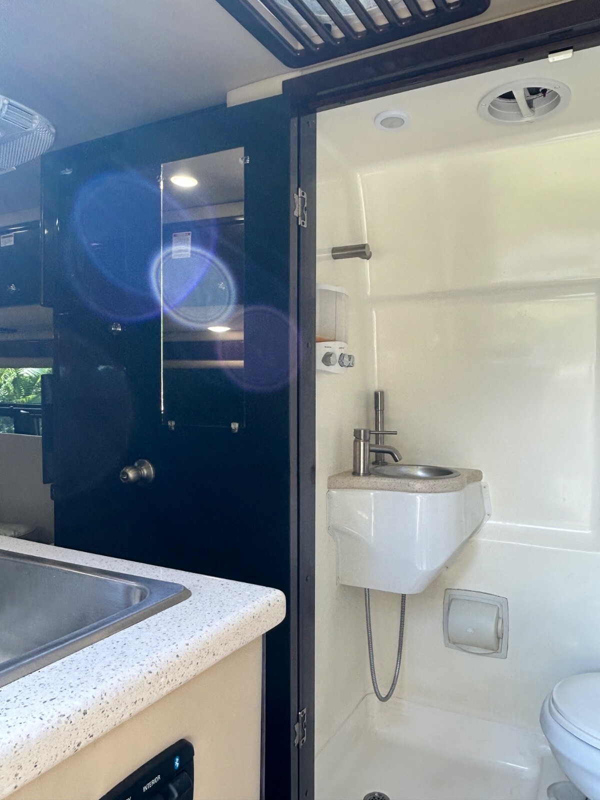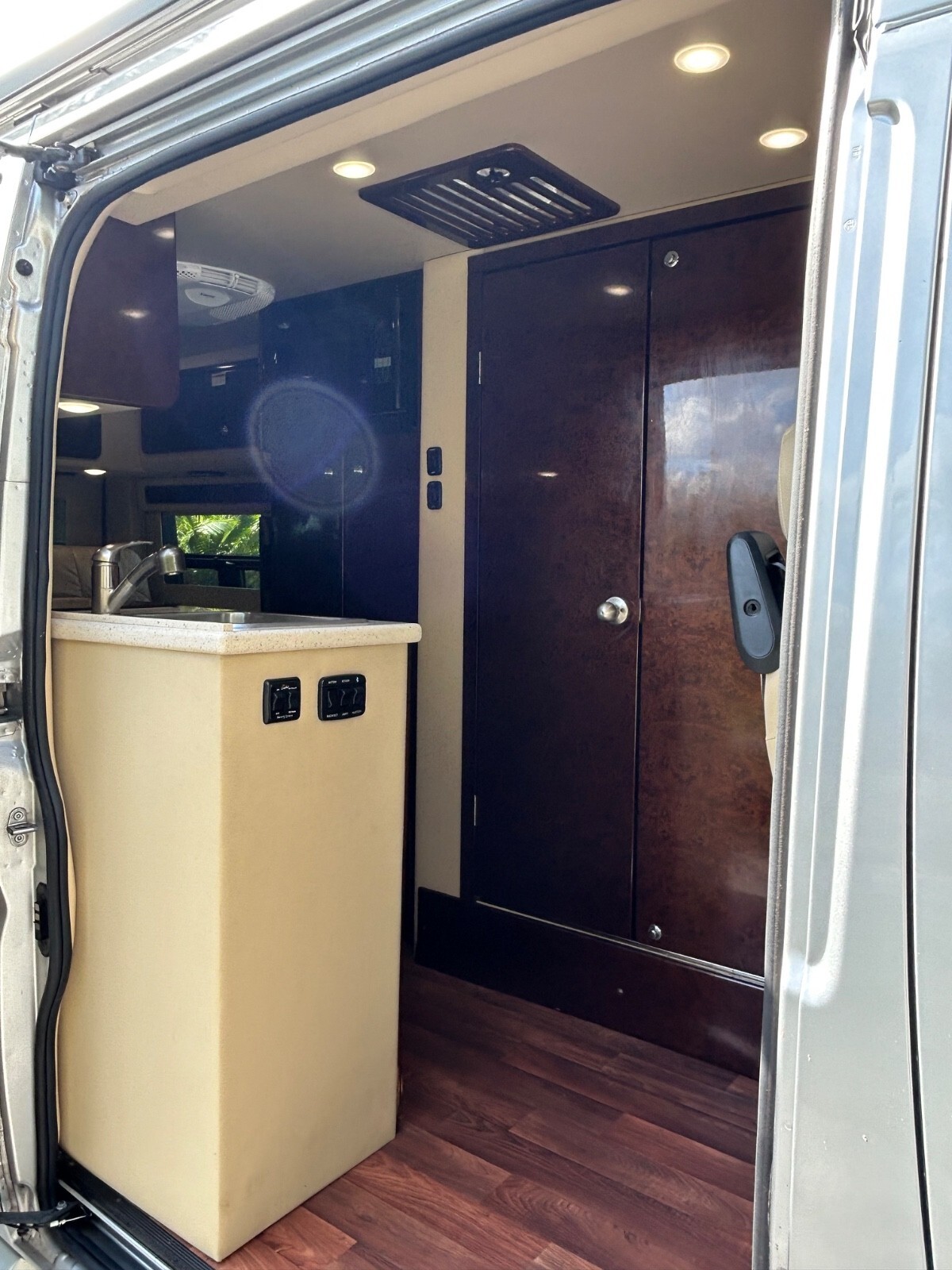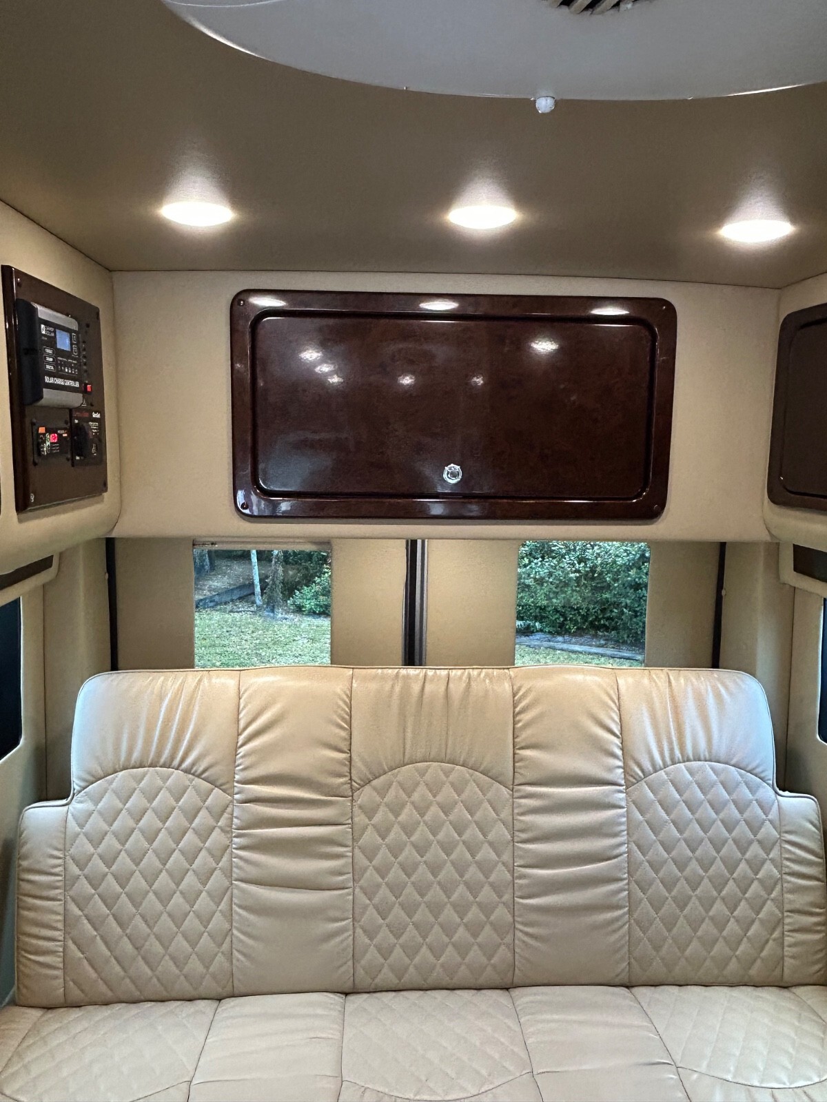 Awesome camper van. Classy and stylish as you can see, with yacht like interior. Solar pane, generator, bathroom exhaust fan. Bed lies flat at touch of a button.