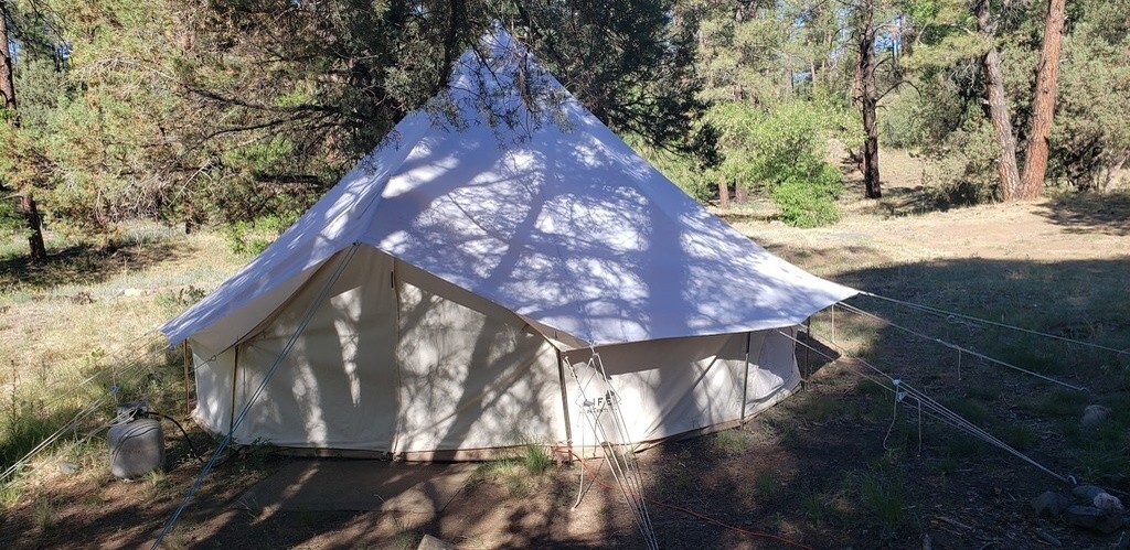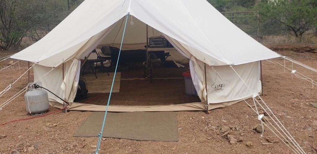 One 16ft. Fernweh Bell Tent (Made by Life in Tents) with Ground Cloth, Fly Cover, & Interior CarpetOne Toaster Oven, One 12-Volt 55-Qt. Fridge & One 75-Qt Yeti CoolerOne Mr. Heater-Big Buddy Propane Indoor Heater for TentTwo 4' Folding tables, One Folding Chair, One Camp Chair, & One Foldup Cot & Three Rechargable LanternsTwo 7 Gal. Water containers & Two 6 Gal. Water ContainersOne Gold Pan, One 100 Power Magnifying Scope, and Many AccessoriesSeller Video