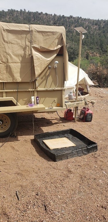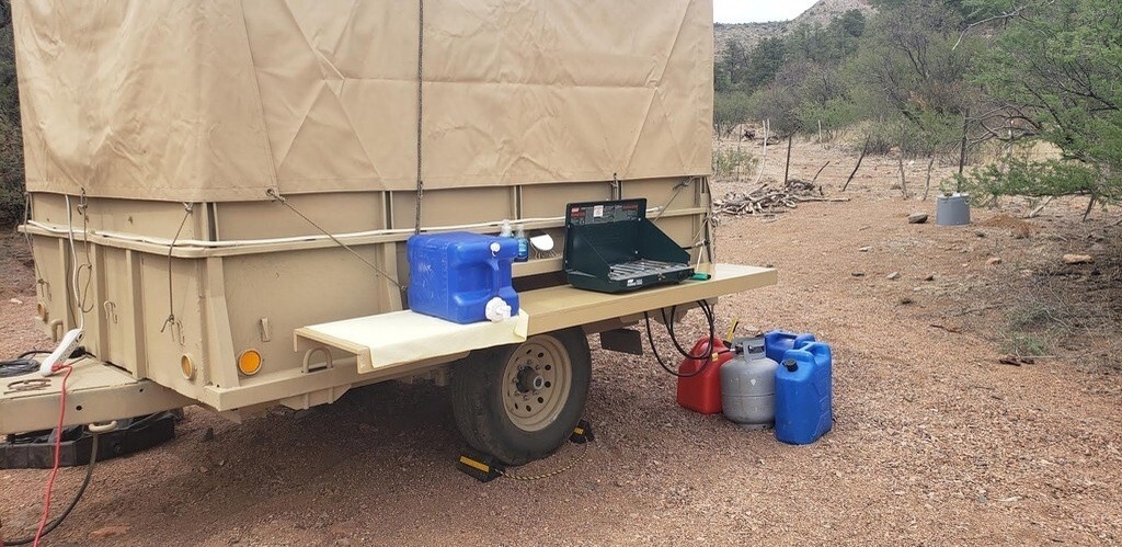 Custom Prospecting & Camping Off-Road Trailer Built from a 1.5-ton Army trailer and purpose-converted for off-grid prospecting and camping, this titled rig is fully outfitted and ready to roll. Army Trailer Conversion & All Components Listed for Sale • 1.5 Ton Custom Army Trailer Conversion to Prospecting/Camping Trailer - Titled • New 7,000 lb axle, springs, electric brakes, and 10 ply tires •Interior sides lined with 3/4" MDO plywood •Locking Device for Trailer and Receiver Hitch •100 Gallon Water Storage Tank •Hot Water on Demand Propane Heater with 5 Gal./Min. Water Pump