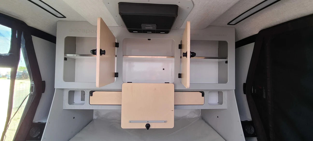 Galley:Stainless Steel Full-Size SinkENO 2-Burner StoveFridge SlideHidden Knife StorageSpice DrawerModular Shelving